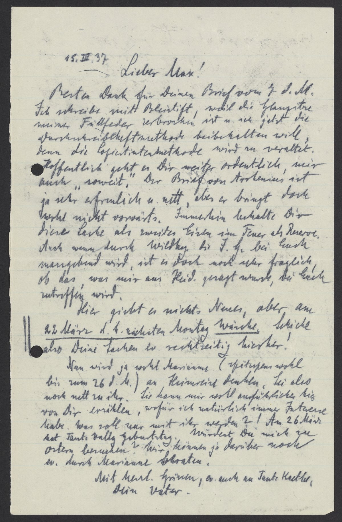 Nun wird ja wohl Marianne (spätestens wohl bis zum. 26 d.M.) an Heimreise denken. Sei also noch nett zu ihr. Sie kann mir ausführlich von Dir erzählen, wofür ich natürlich immer Interesse habe. Was soll nur mit ihr werden?! Am 26. März hat Tante Vally Geburtstag. Würdest Du mich zu Ostern besuche? Wir können ja darüber noch durch Marianne beraten.