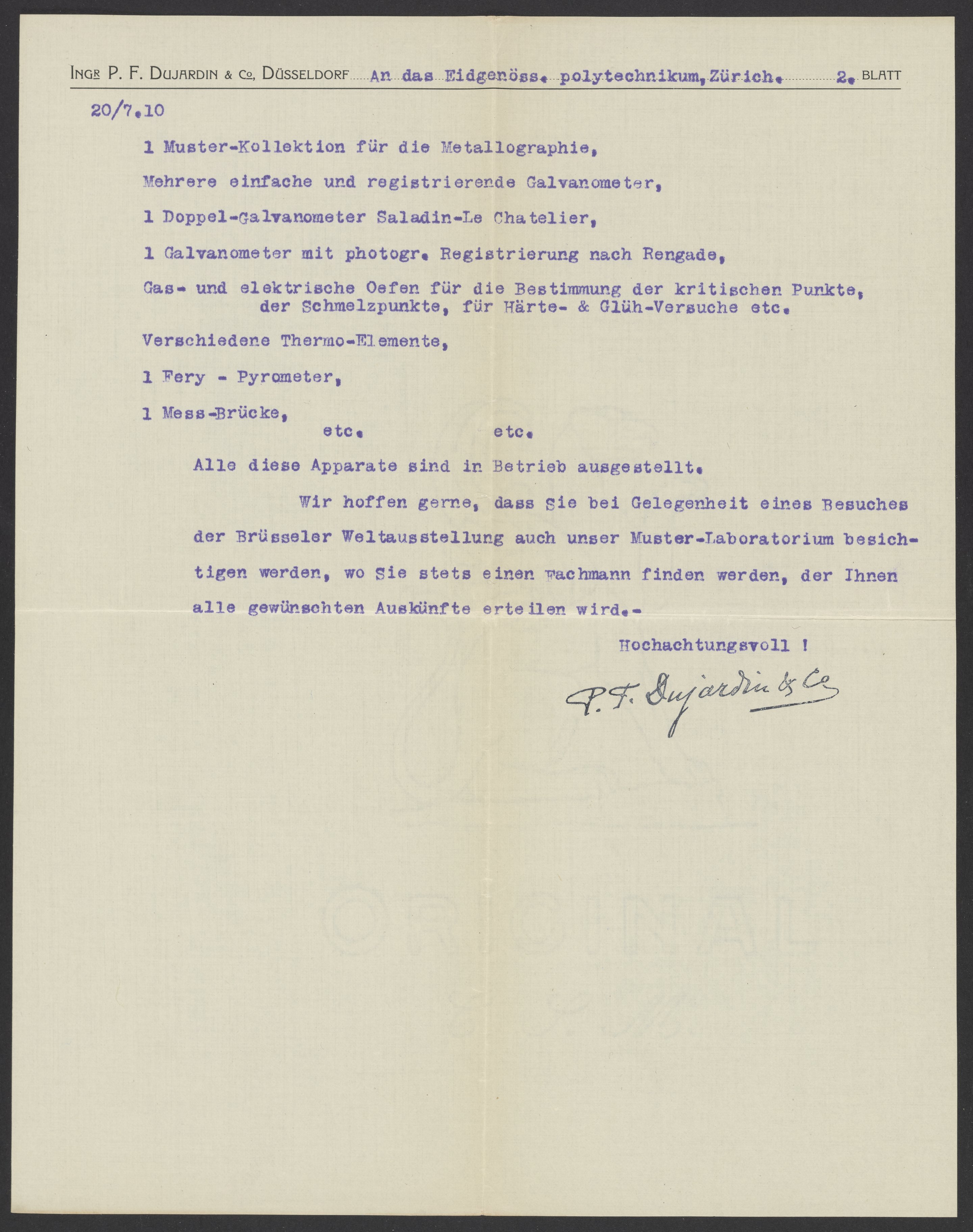 Letter from P.F. Dujardin & Co. advertising machines and products for metallographic laboratories