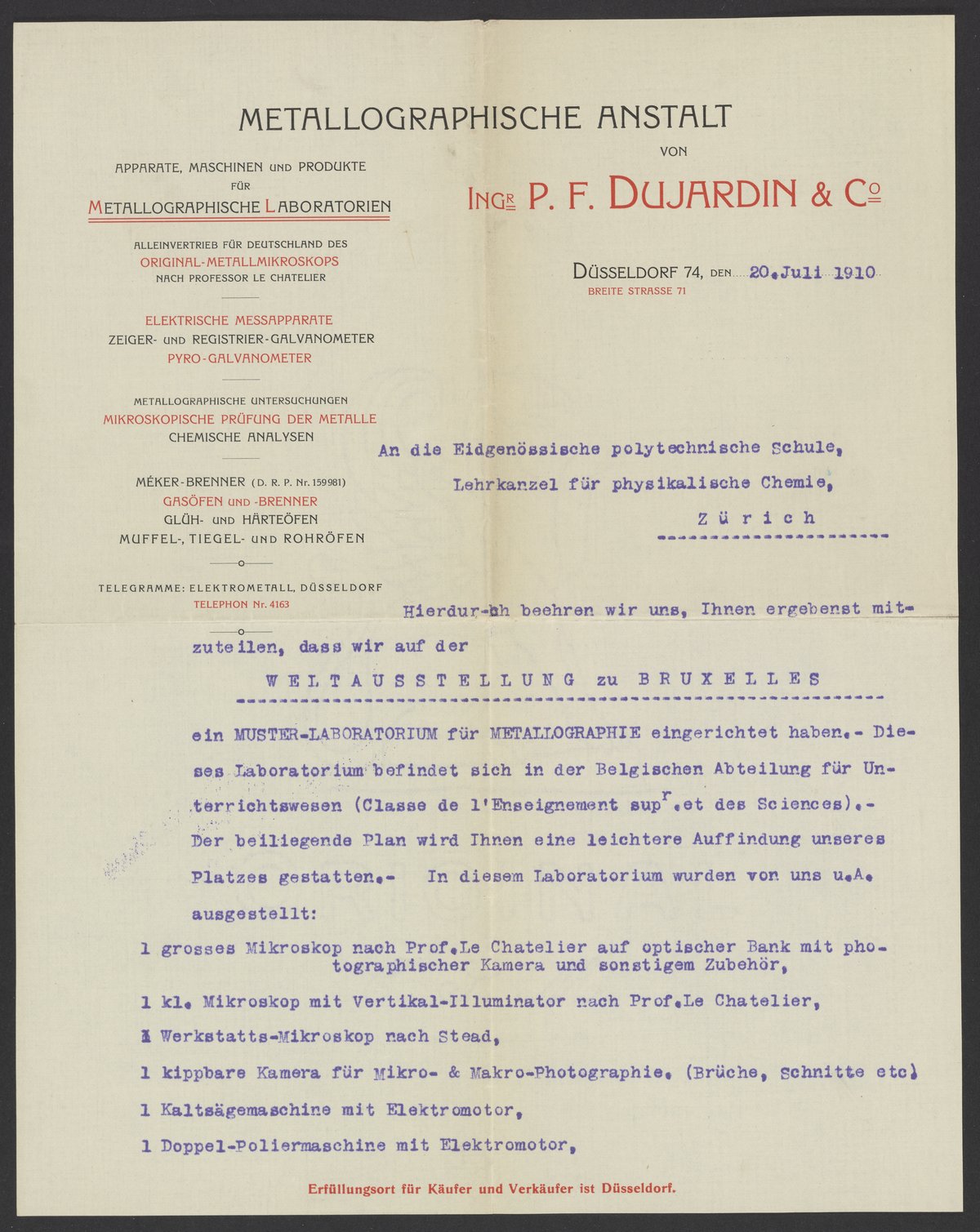 P. F. Dujardin & Co. “Letter from P.F. Dujardin & Co. Advertising Machines and Products for Metallographic Laboratories,” July 20, 1910. Papers of Georg and Max Bredig, Box 3, Folder 3. Science History Institute. Philadelphia. https://digital.sciencehistory.org/works/o15rqfk.