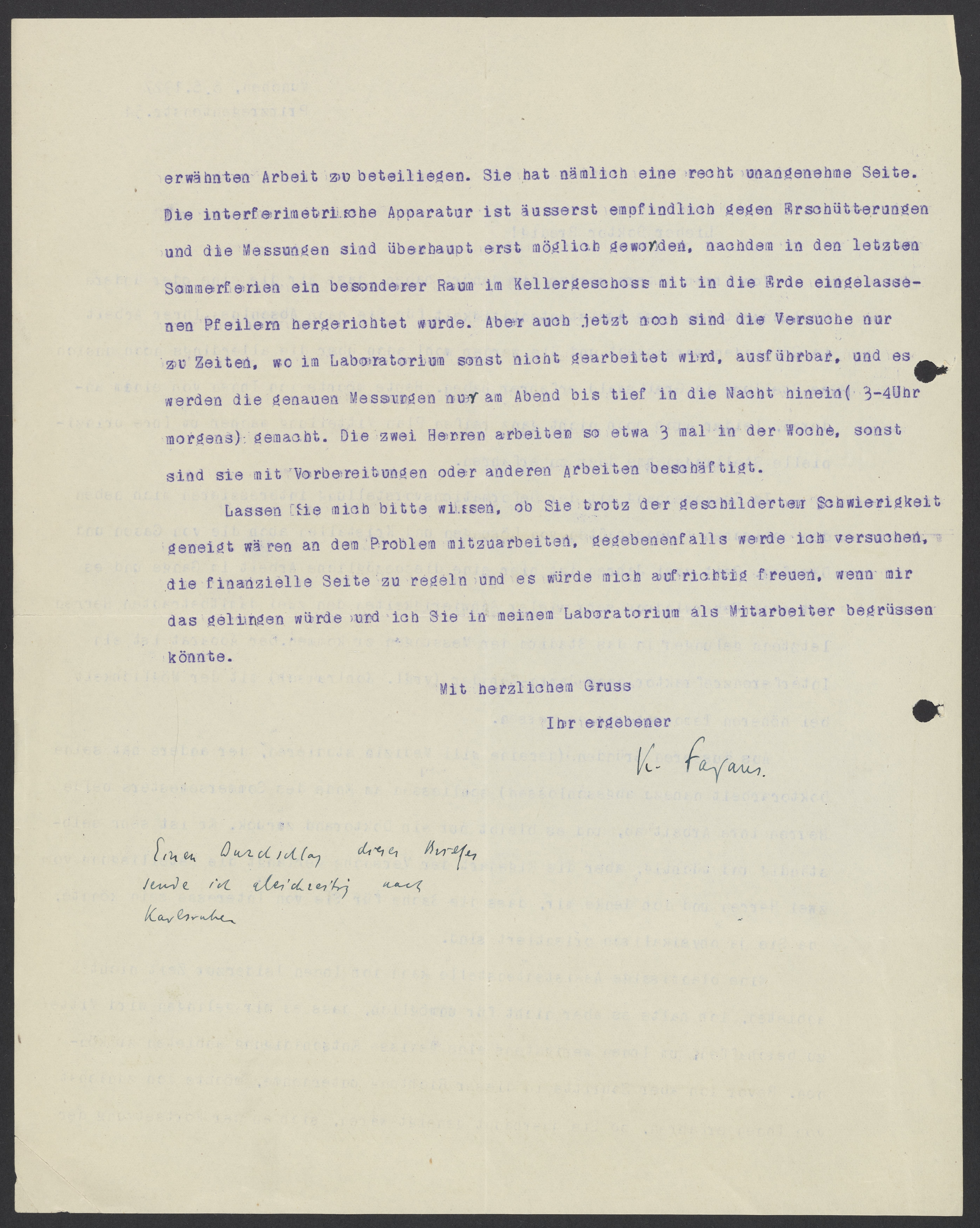 Lassen Sie mich bitte wissen, ob Sie trotz der geschilderten Schwierigkeit geneigt wären an dem Problem mitzuarbeiten, gegebenfalls werde ich versuchen, die finanzielle Seite zu regeln und es würde mich aufrichtig freuen, wenn mir das gelingen würde und ich Sie in meinem Laboratorium als Mitarbeiter begrüssen könnte.