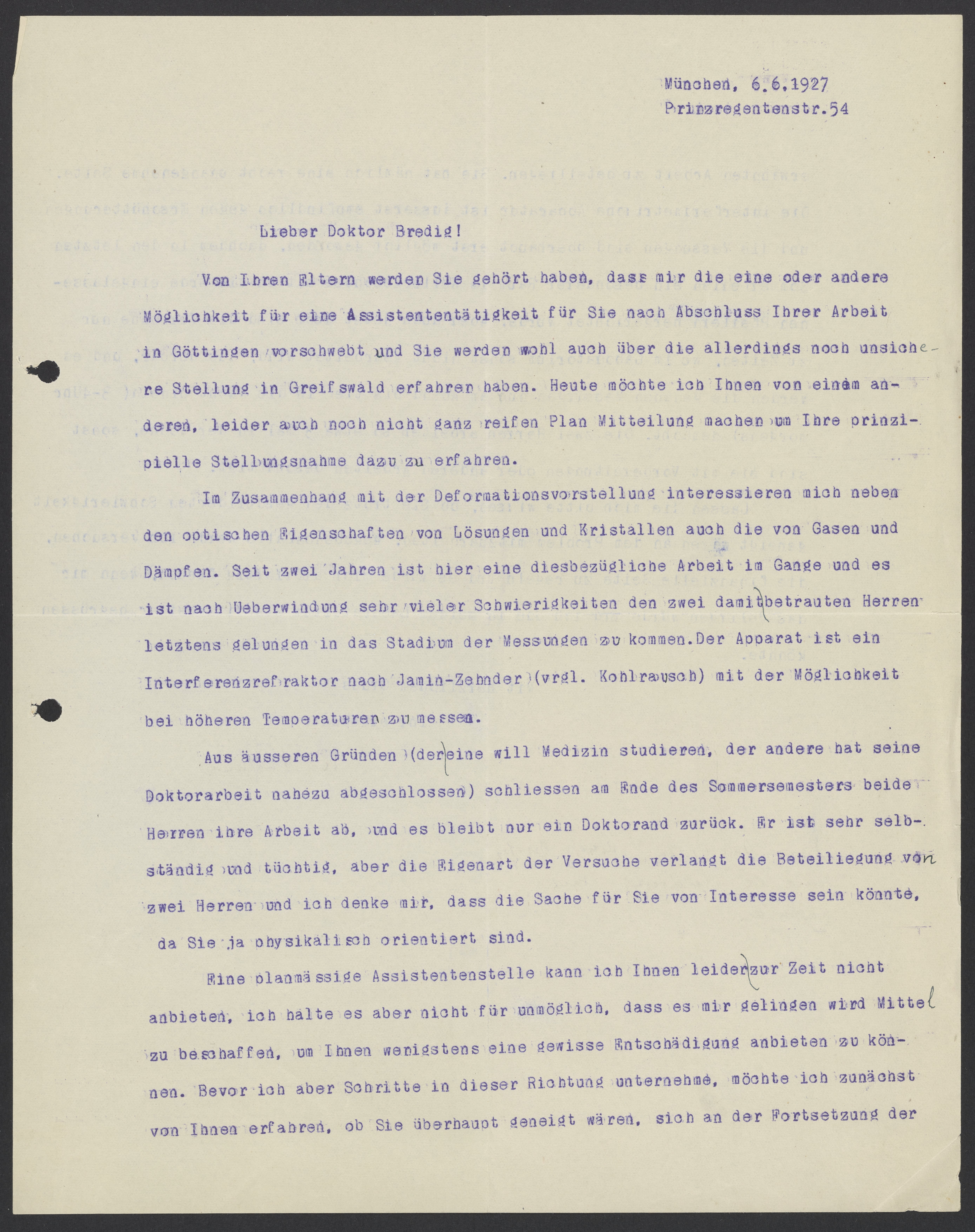 Von Ihren Eltern würden Sie gehört haben, dass mir die eine oder andere Möglichkeit für eine Assistententätigkeit für Sie nach Abschluss Ihrer Arbeit in Göttingen vorschwebt und Sie werden wohl auch über die allerdings noch unsichere Stellung in Greifswald erfahren haben. Heute möchte ich Ihnen von einem anderen, leider auch noch nicht ganz reifen Plan Mitteilung machen um Ihre prinzipielle Stellungnahme zu erfahren.
