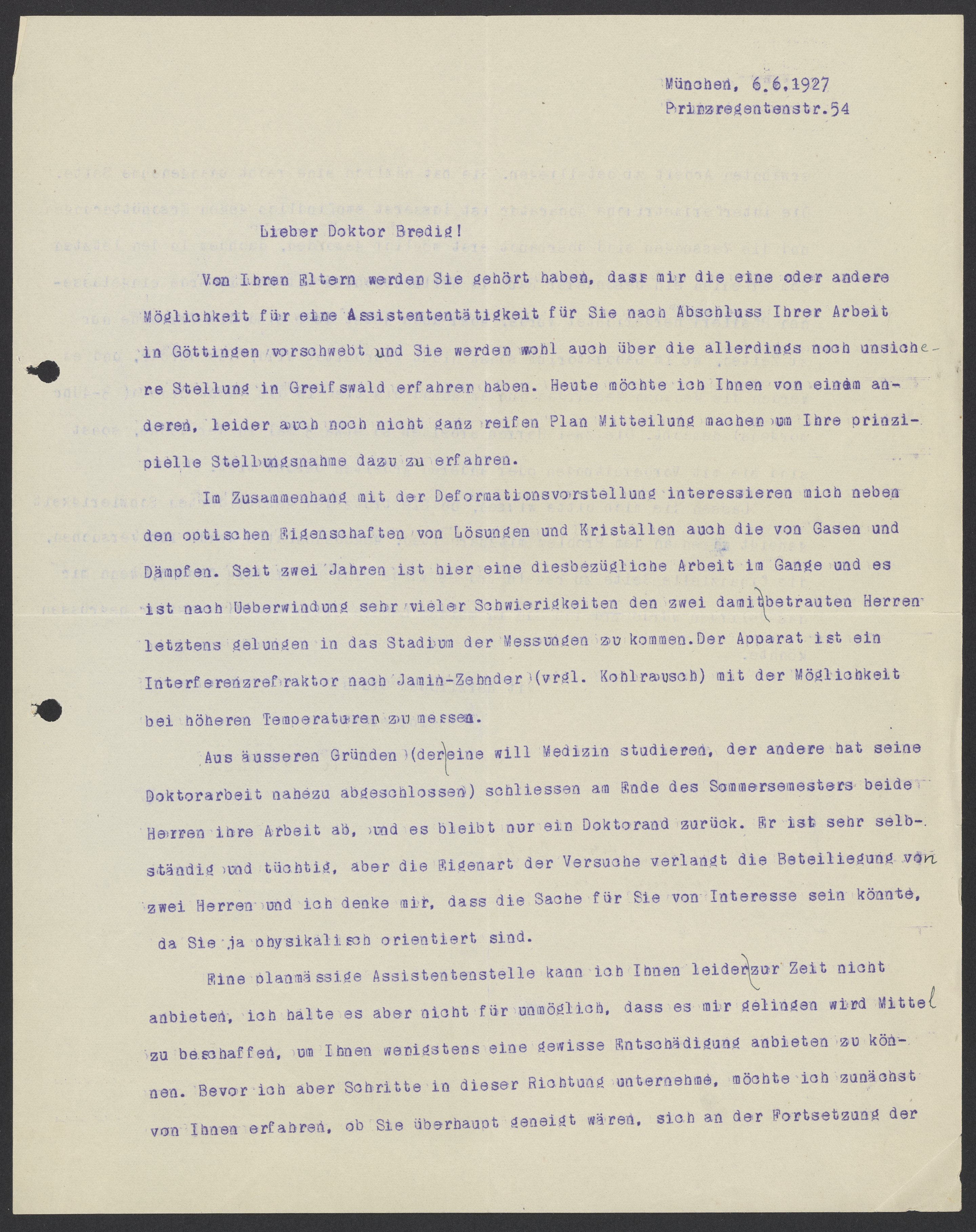Ein planmässige Assistentenstelle kann ich Ihnen leider zur Zeit nicht anbiete, ich halte es aber für unmöglich, dass es mir gelingen wird Mittel zu beschaffen, um Ihnen wenigstens eine gewisse Entschädigung anbieten zu können. Bevor ich aber Schritte in dieser Richtung unternehme, möchte ich zunächst von Ihnen erfahren, ob Sie überhaupt geneigt wären, sich an der Fortsetzung der