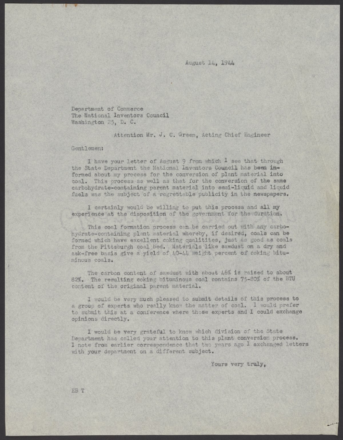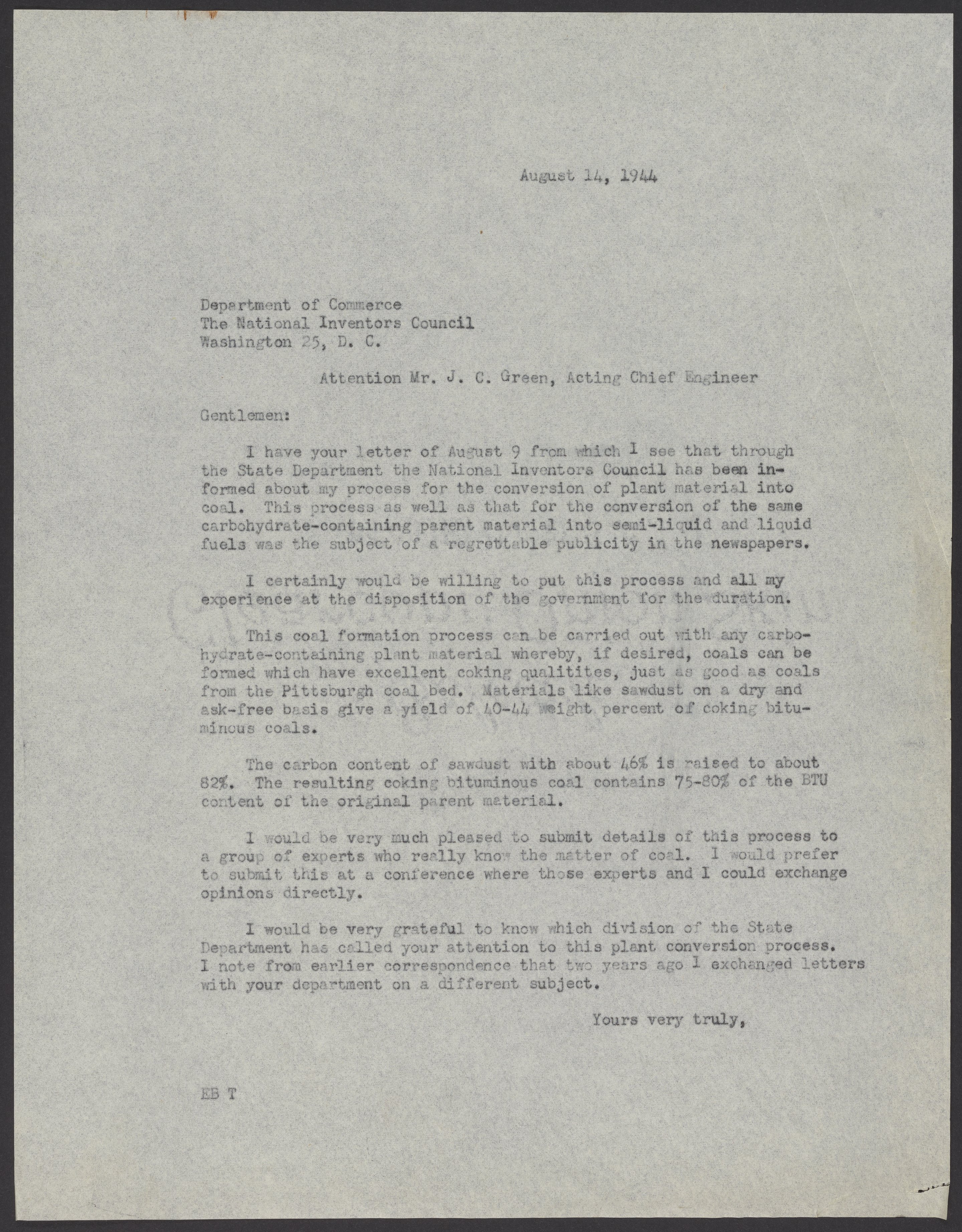 Letter from Ernst Berl (1877-1946) to the National Inventors Council regarding his process for converting plant material into fuel. Berl explains his process and asks if he can submit the process at a conference.