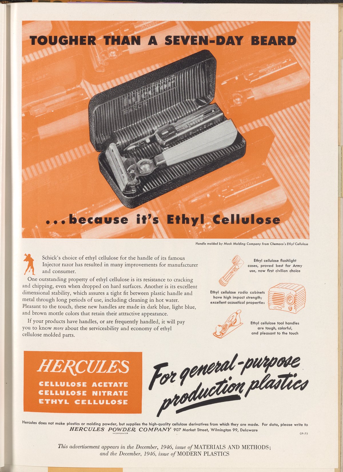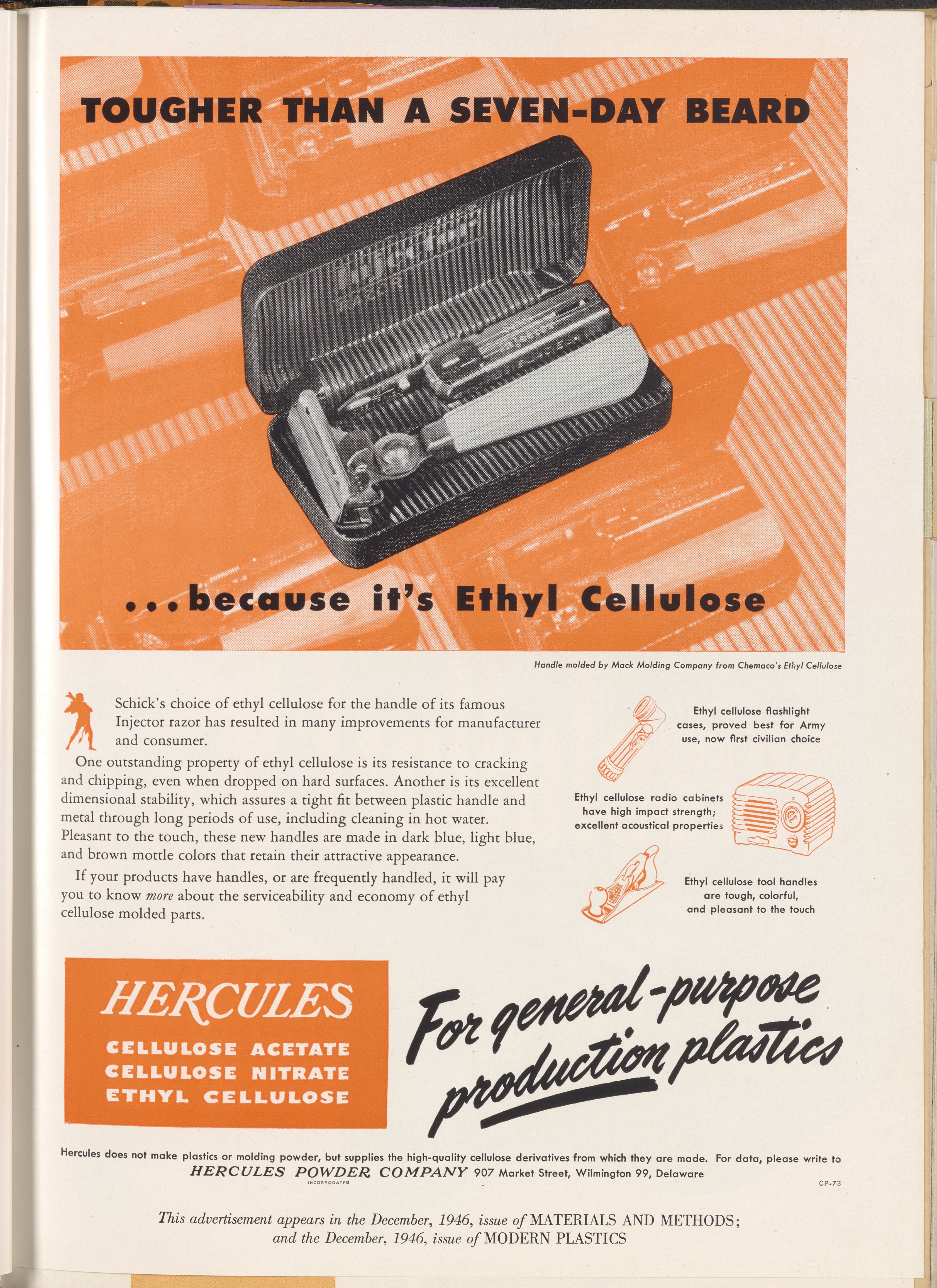 Hercules Incorporated. “Tougher than a Seven-Day Beard.” 1946 Hercules Advertisements, 1946. Records of Hercules Incorporated, Volume 1946. Science History Institute. Philadelphia. https://digital.sciencehistory.org/works/o24xcql.