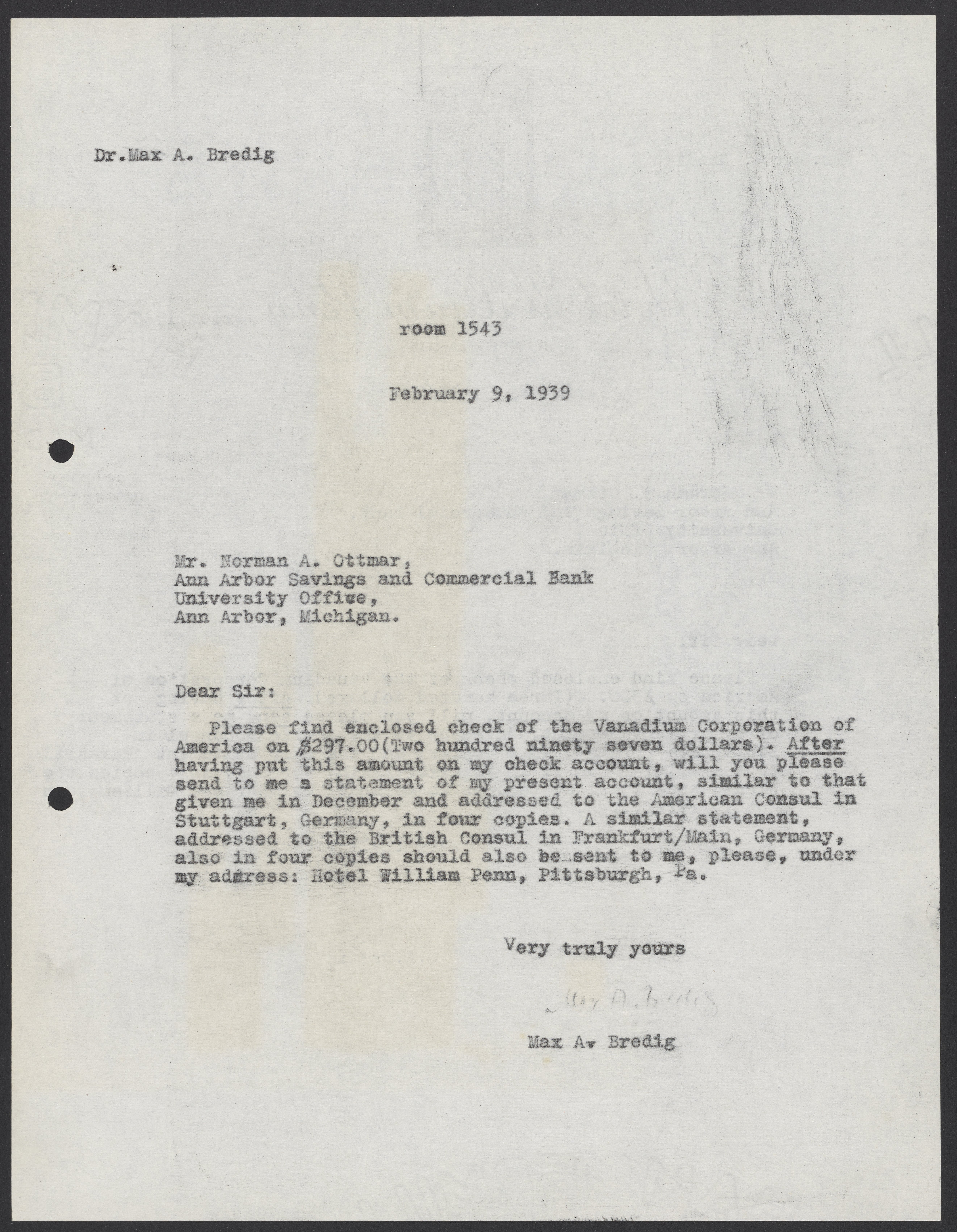 Small JPG1200 x 1545px — 233 KBLarge JPG2880 x 3709px — 1.6 MBFull-sized JPG5285 x 6806px — 5.5 MBOriginal fileTIFF — 5285 x 6806px — 103 MBMax Albert Bredig (1902-1977) sends the Ann Arbor Savings and Commercial Bank a check and requests copies of his account statements.