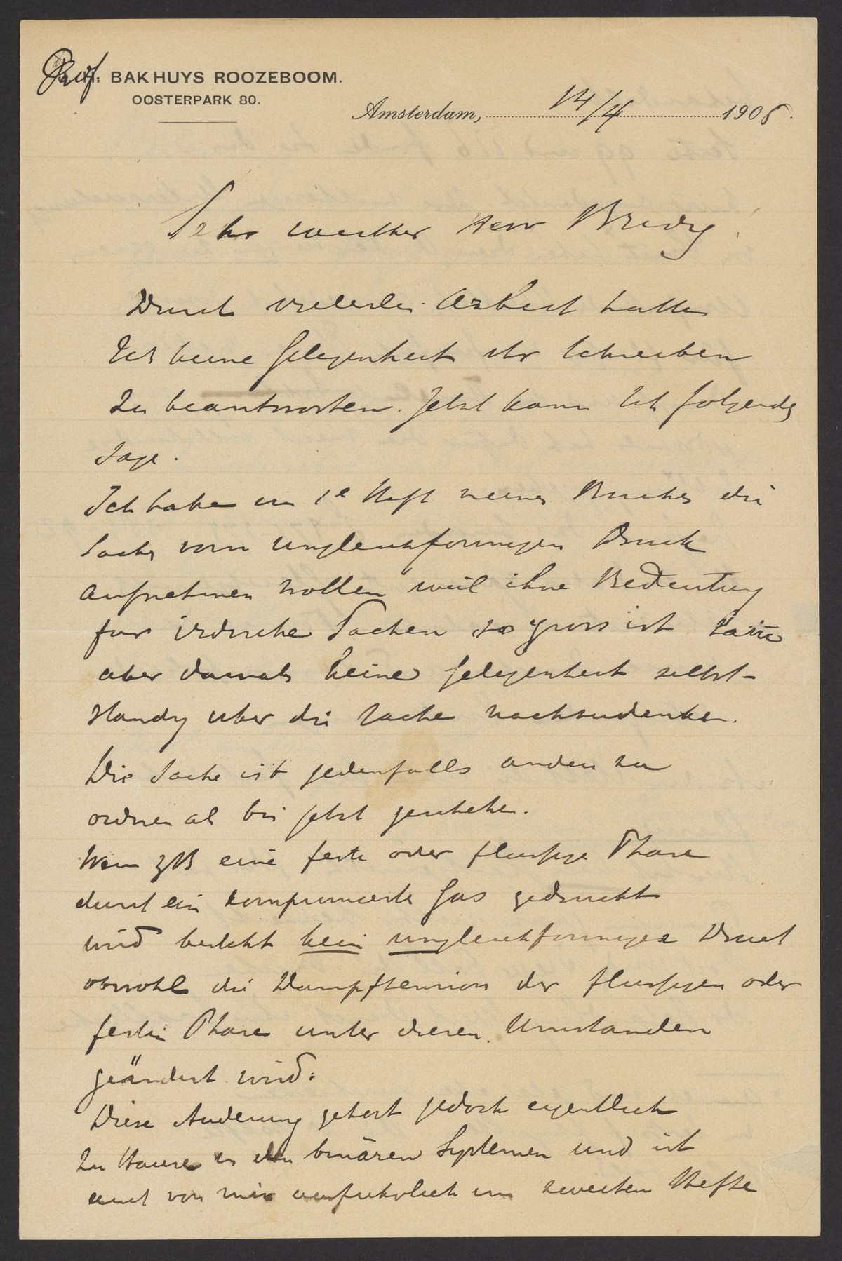 Letter from Hendrik Willem Bakhuis Roozeboom to Georg Bredig, April 1905