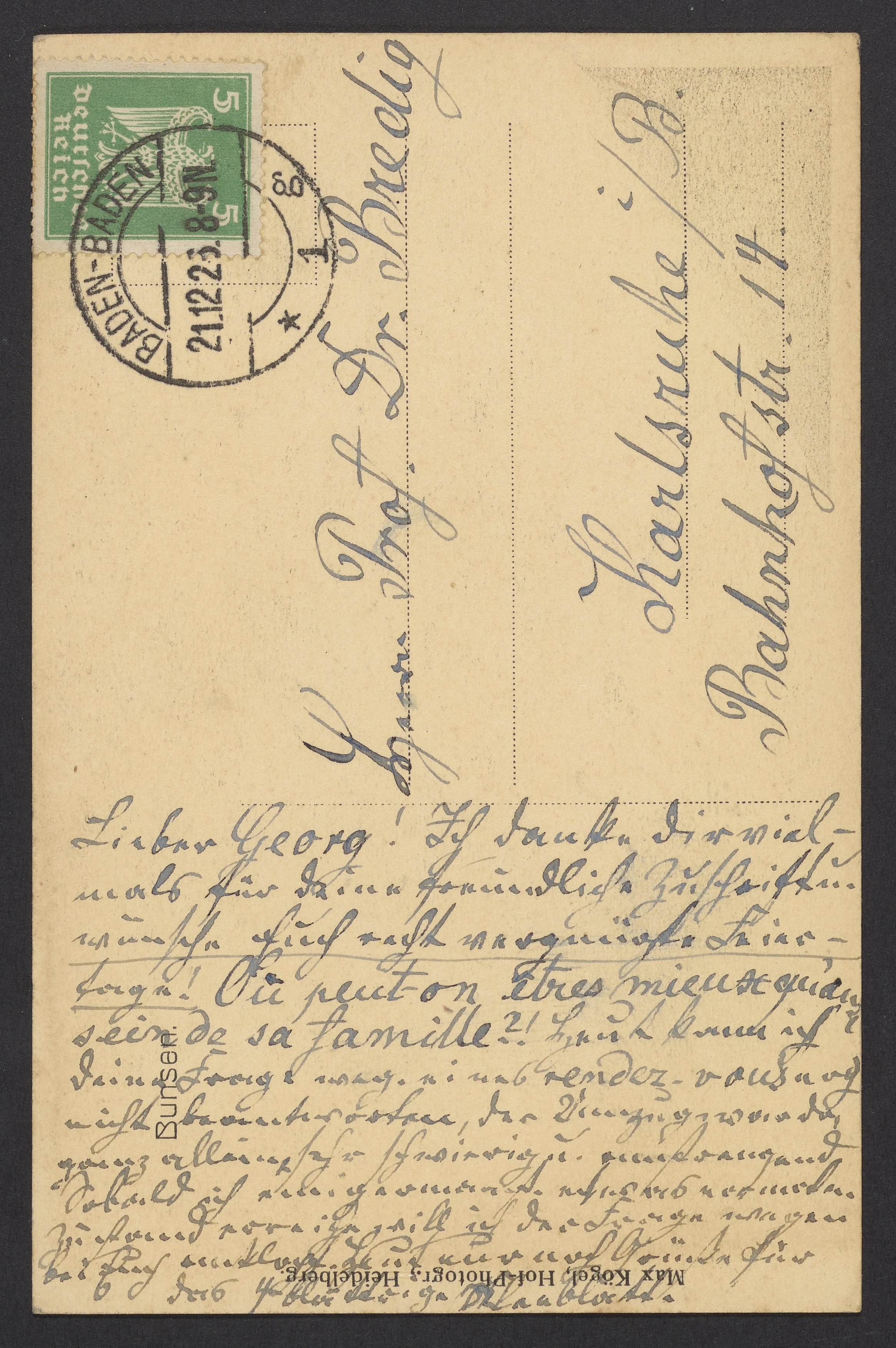 Kögel, Max. “Postcard of Robert Bunsen Sent to Georg Bredig,” December 23, 1923. Papers of Georg and Max Bredig, Box 22. Science History Institute. Philadelphia. https://digital.sciencehistory.org/works/o555lrl.