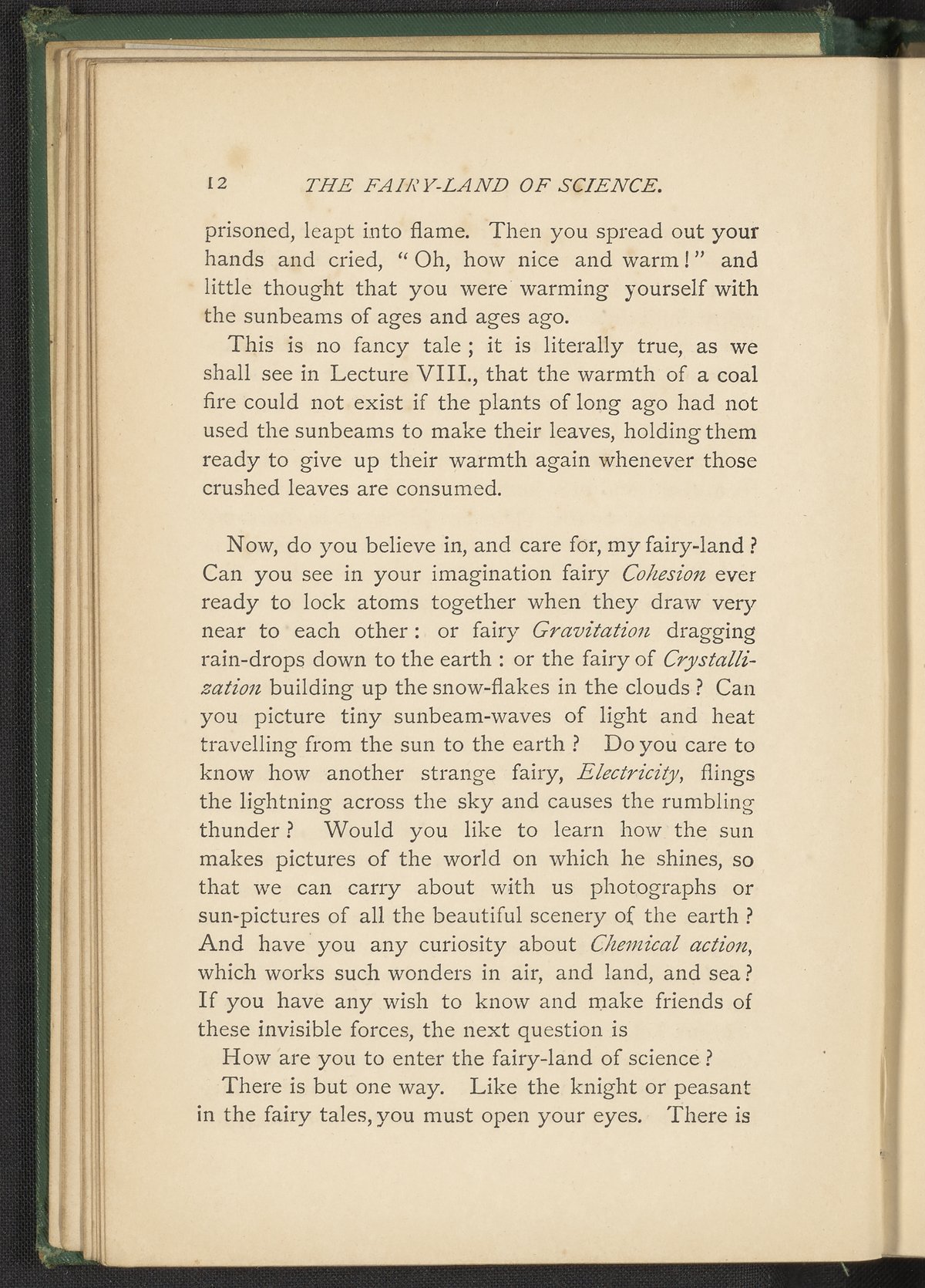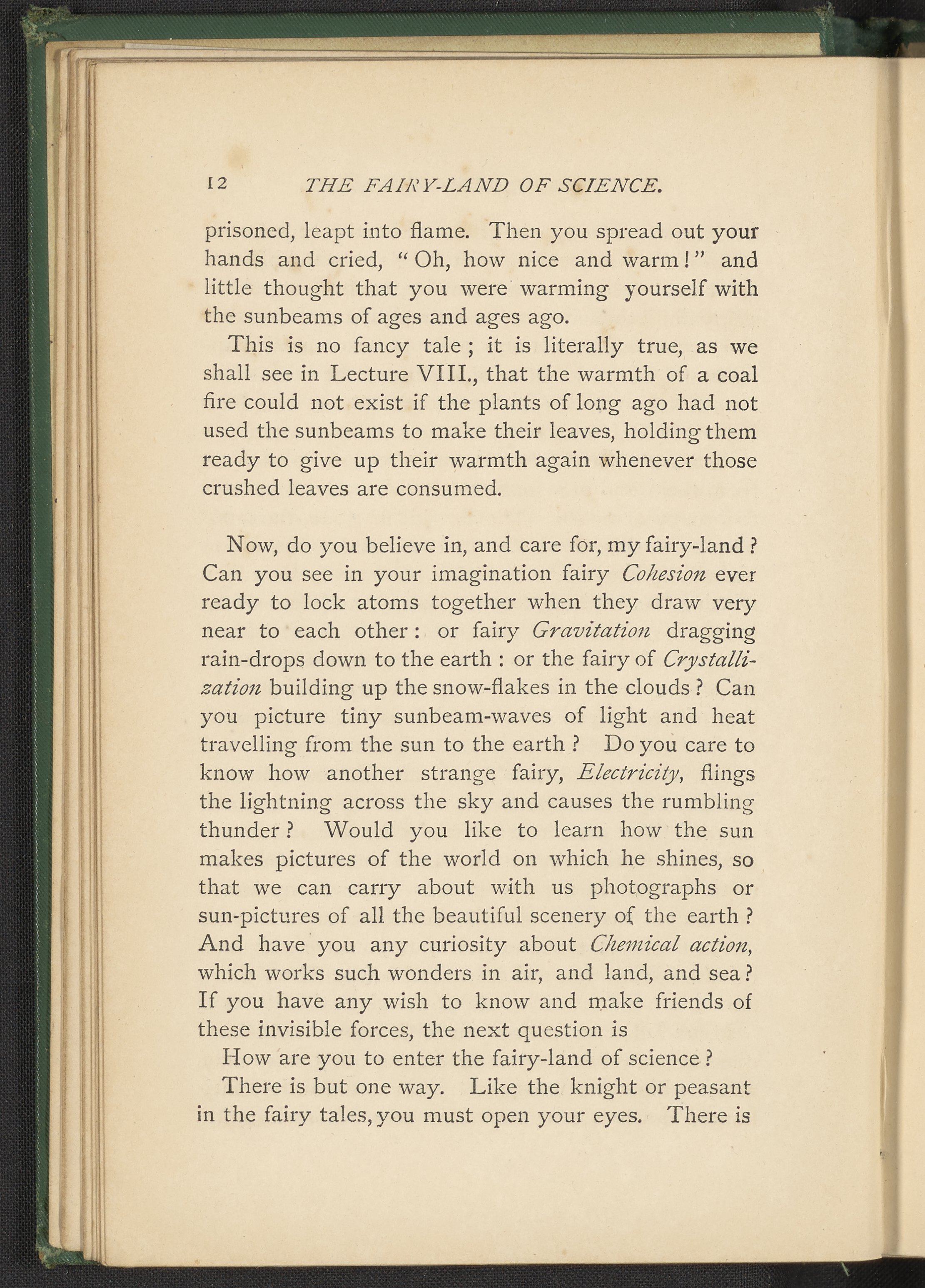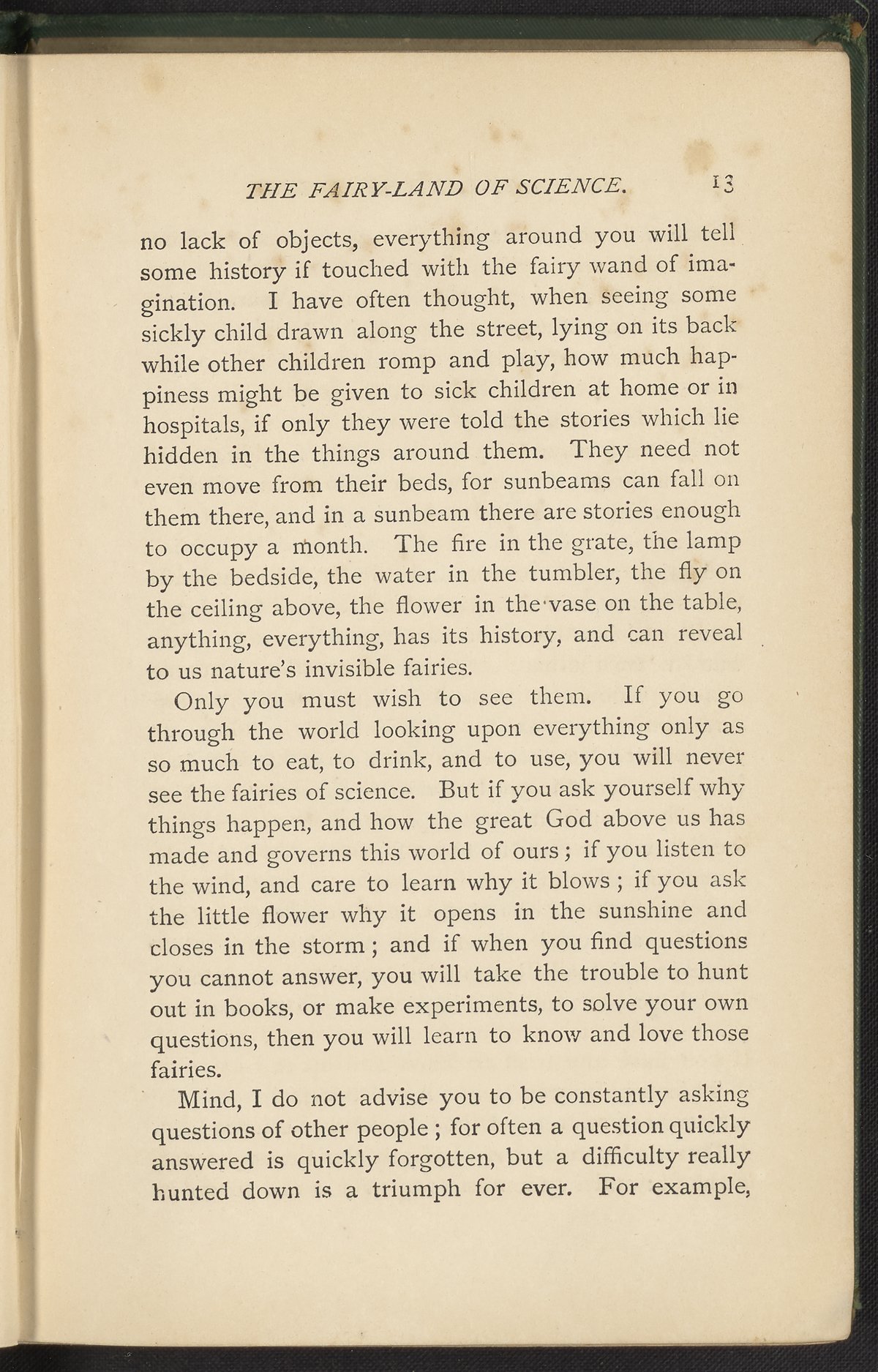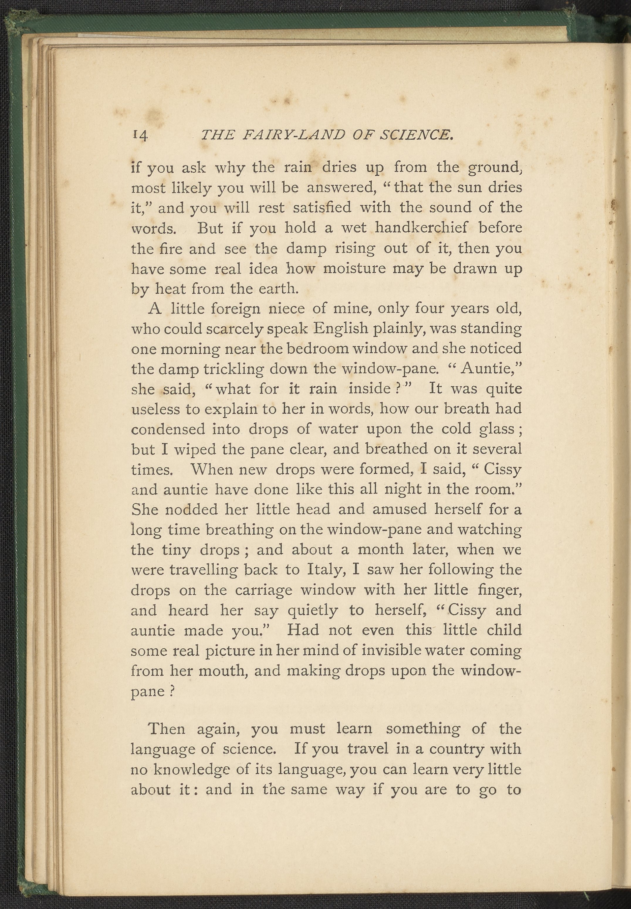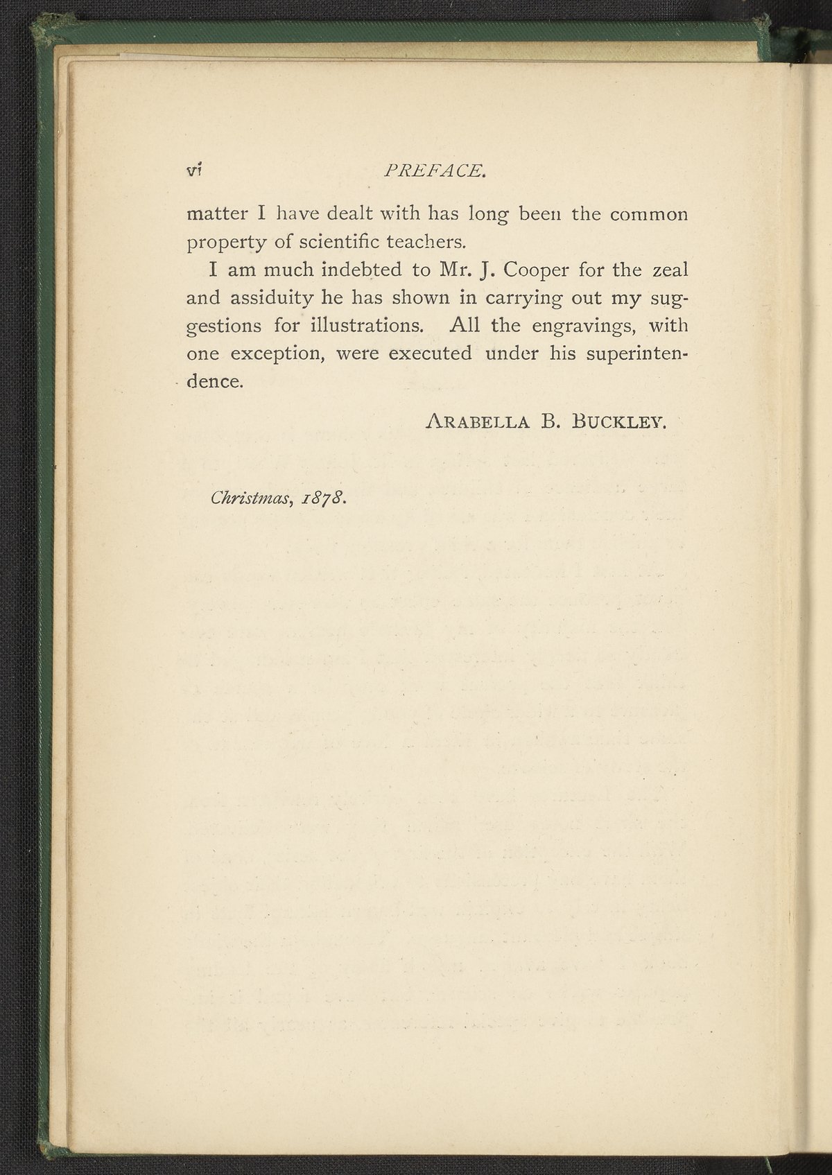 Small JPG1200 x 1677px — 515 KBFull-sized JPG2221 x 3103px — 1.5 MBOriginal fileTIFF — 2221 x 3103px — 19.8 MBArabella Burton Buckley (1840-1929) was a writer and science educator who championed Darwinian evolution as opposed to the contemporary emphasis on competition and physical survival. This work, one of Buckley's earliest, includes a collection of ten scientific lectures delivered to an audience of children in spring 1878. The lectures were reformatted into chapters and published as The Fairy-Land of Science in London in 1878. The edition digitized here was published in 1883.