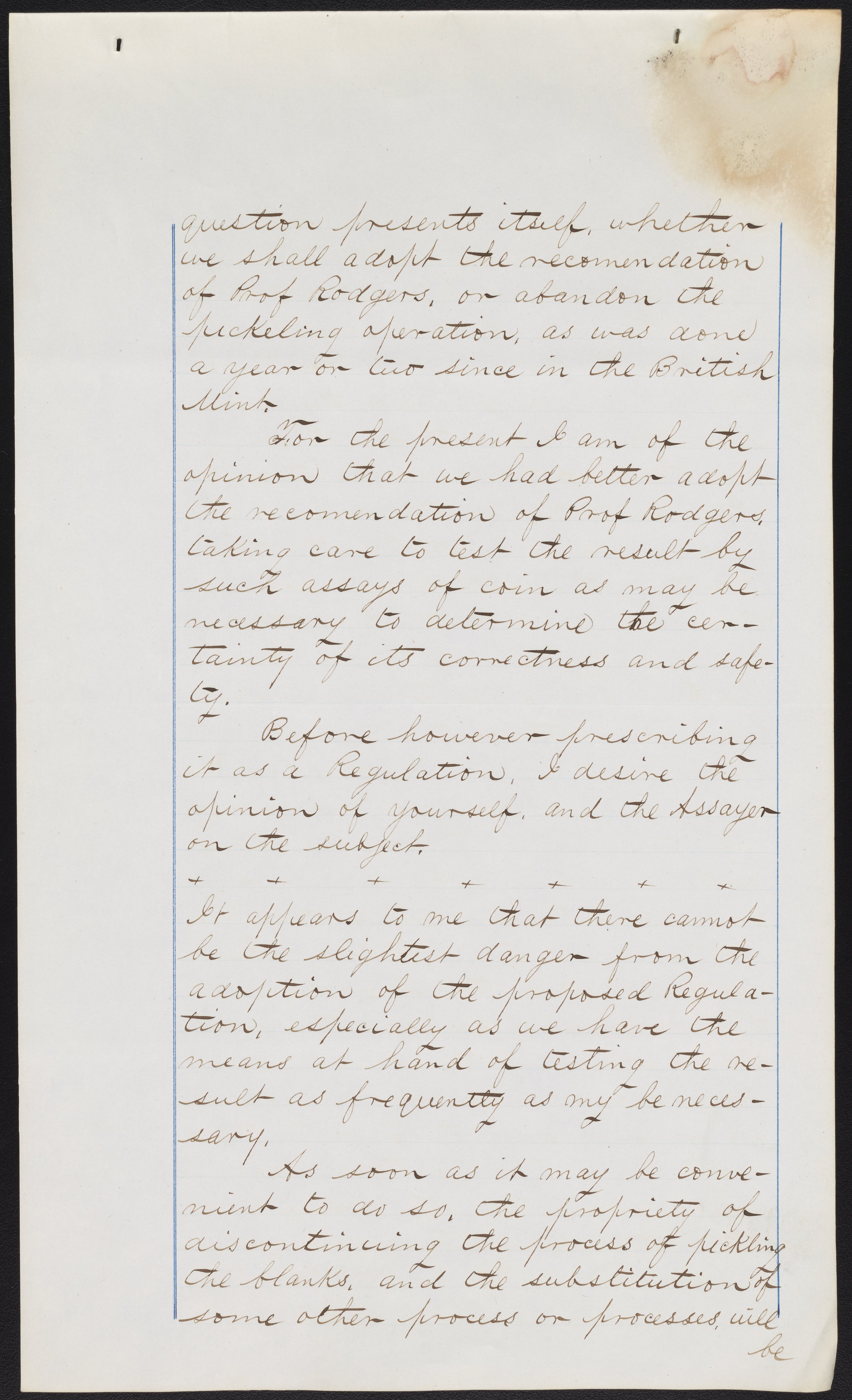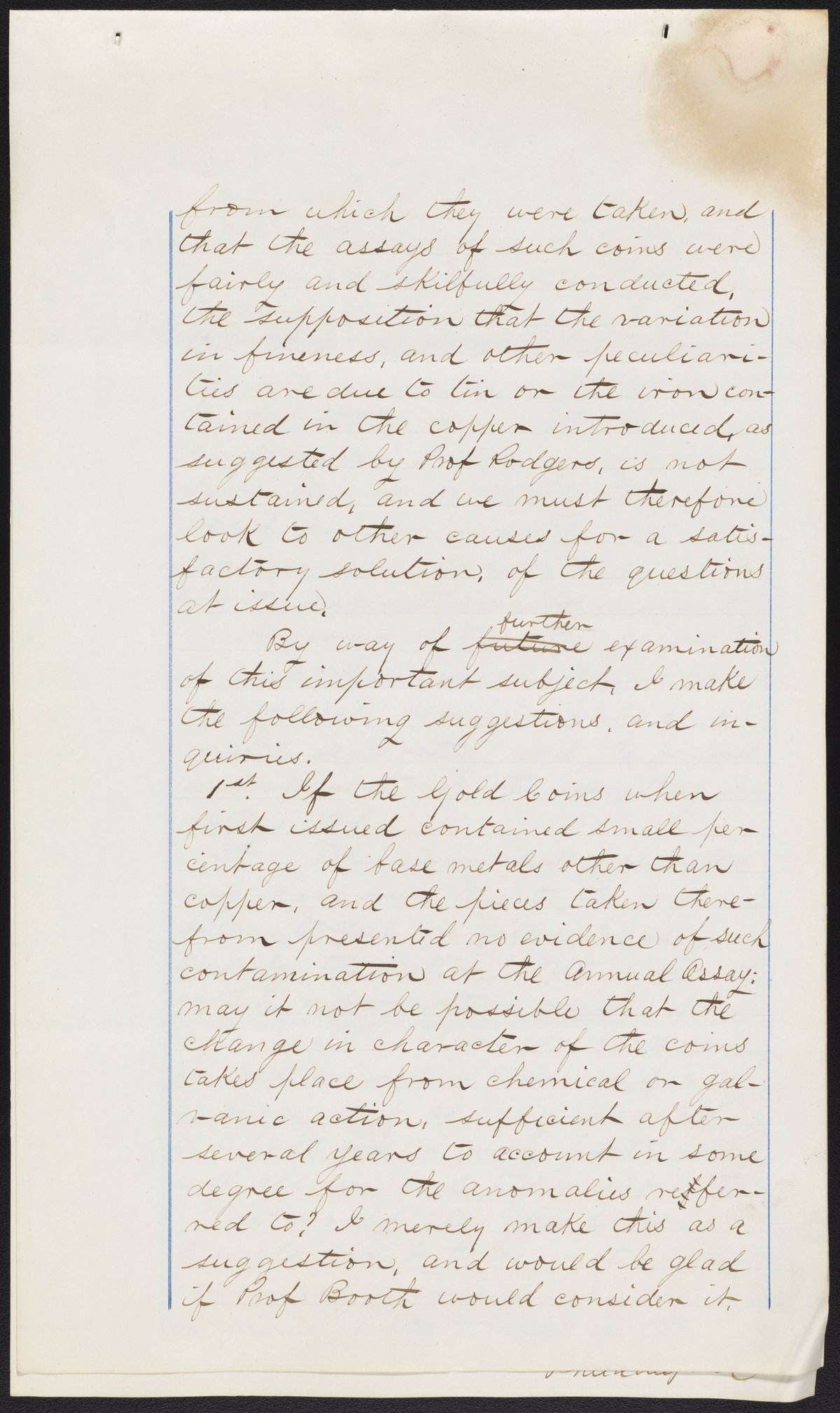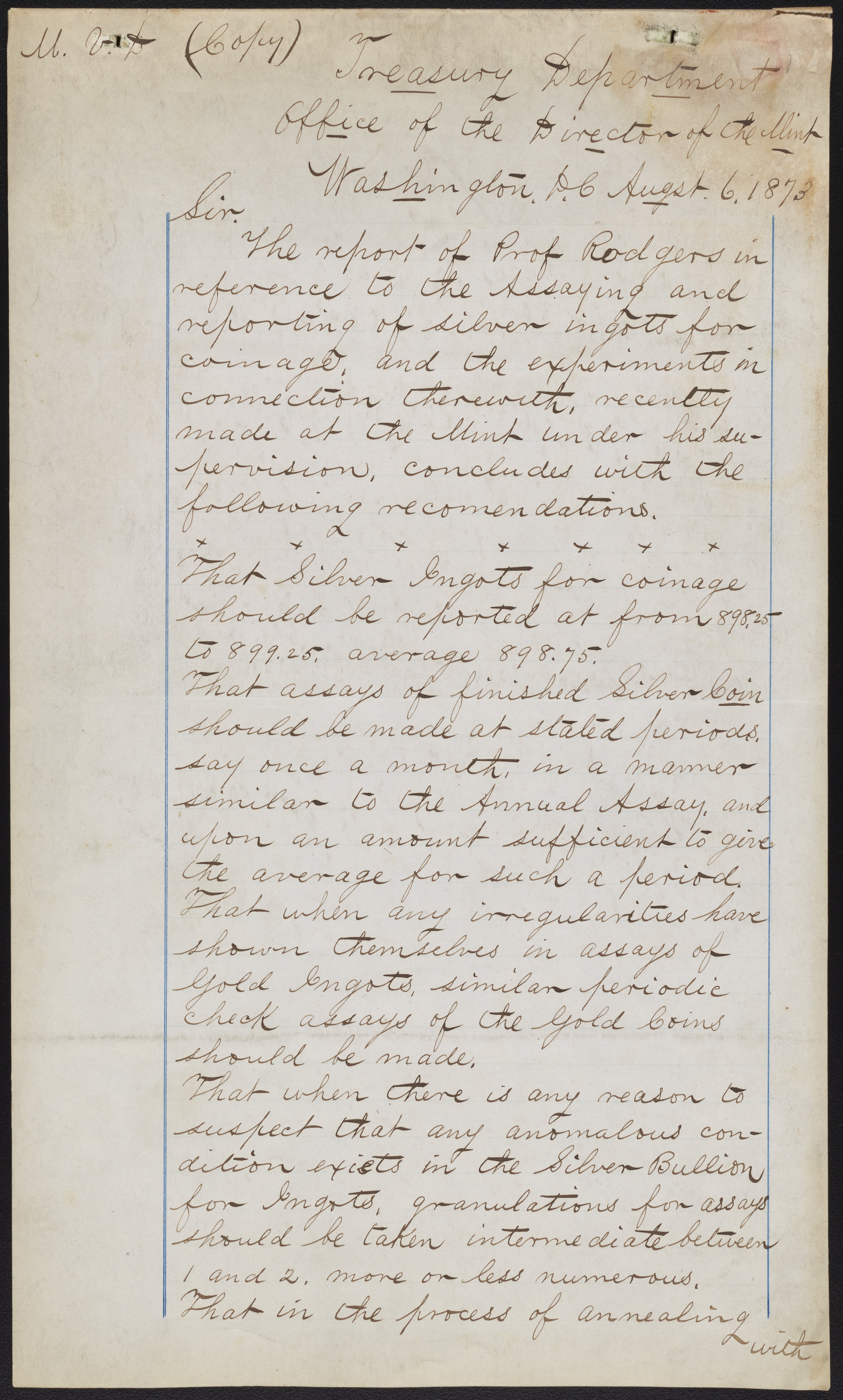 Small JPG1200 x 1991px — 401 KBLarge JPG2880 x 4779px — 1.8 MBFull-sized JPG5412 x 8980px — 5.5 MBOriginal fileTIFF — 5412 x 8980px — 139 MBJames Curtis Booth's (1810-1888) copy of a letter from H.R. Linderman (1825-1879), who was appointed as superintendent of the United States Mint in April 1873, to James Pollock, the former director of the Mint. Linderman notes recommendations by one Prof. Rodgers concerning assaying and reporting of silver ingots for coinage.
