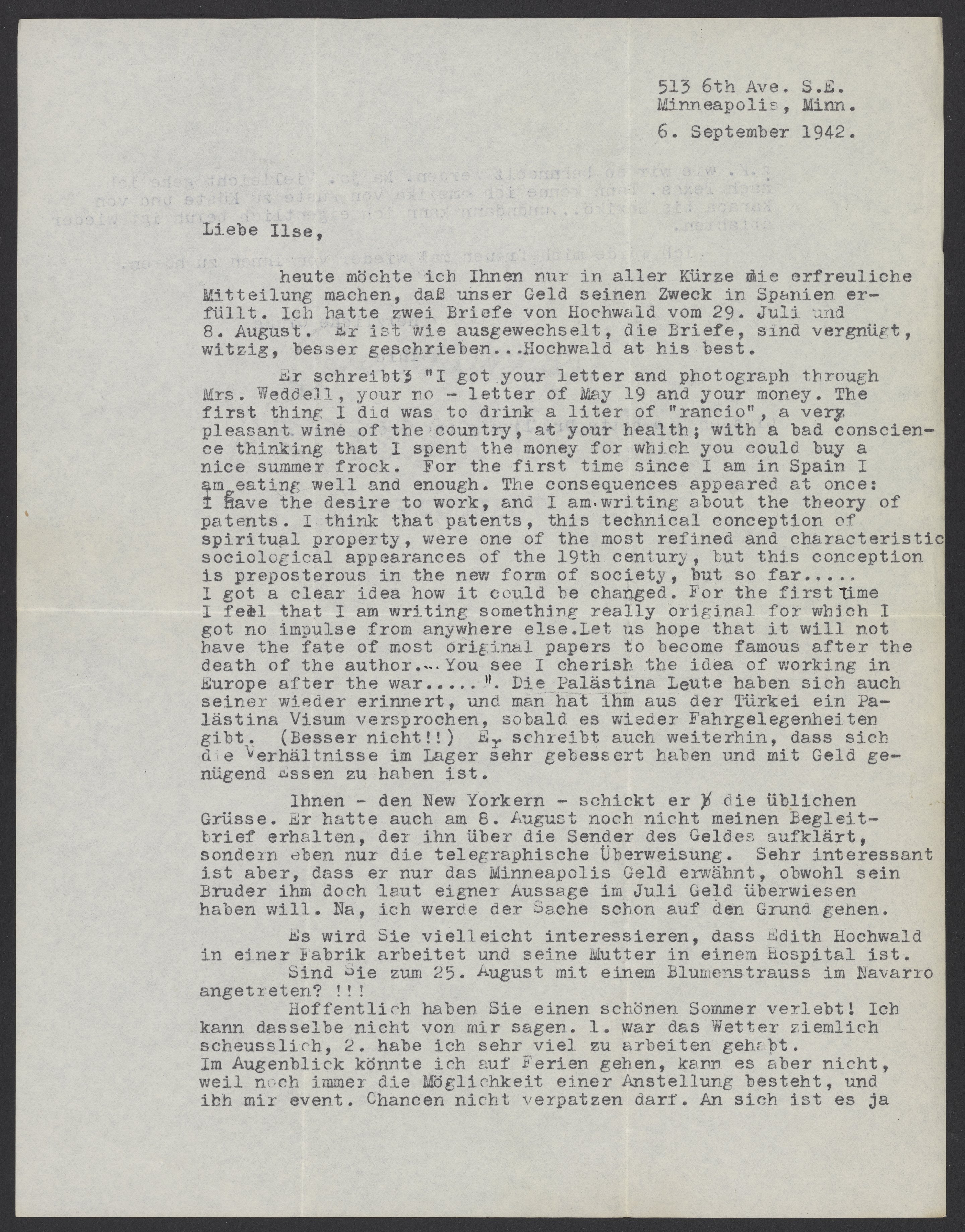 Small JPG1200 x 1532px — 370 KBLarge JPG2880 x 3677px — 1.9 MBFull-sized JPG5406 x 6902px — 6.0 MBOriginal fileTIFF — 5406 x 6902px — 107 MBIlse Wolfsberg informs her friend, Ilse Hayn, that their money for Fritz G. Hochwald (1897-1968) arrived and was able to help him at the Miranda de Ebro Concentration camp.
