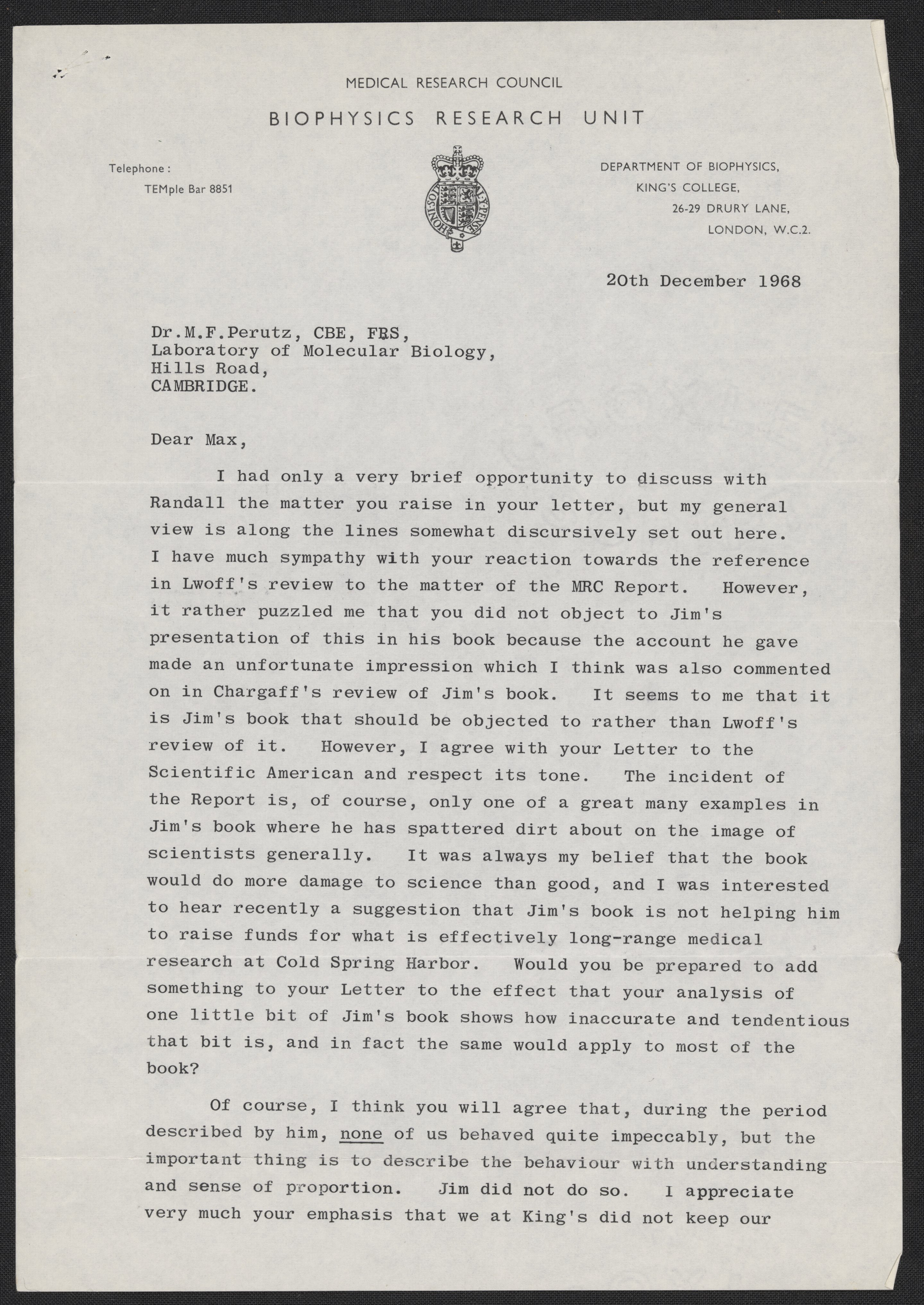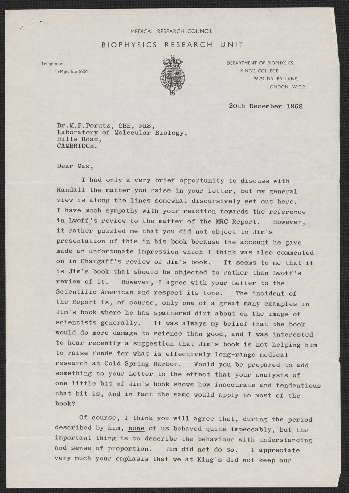 Wilkins, Maurice. “Letter from Maurice Wilkins to Max Perutz, December 20, 1968,” December 20, 1968. History of Molecular Biology Collection, Box 88, Folder 2. Science History Institute. Philadelphia. https://digital.sciencehistory.org/works/o9zfcx7.