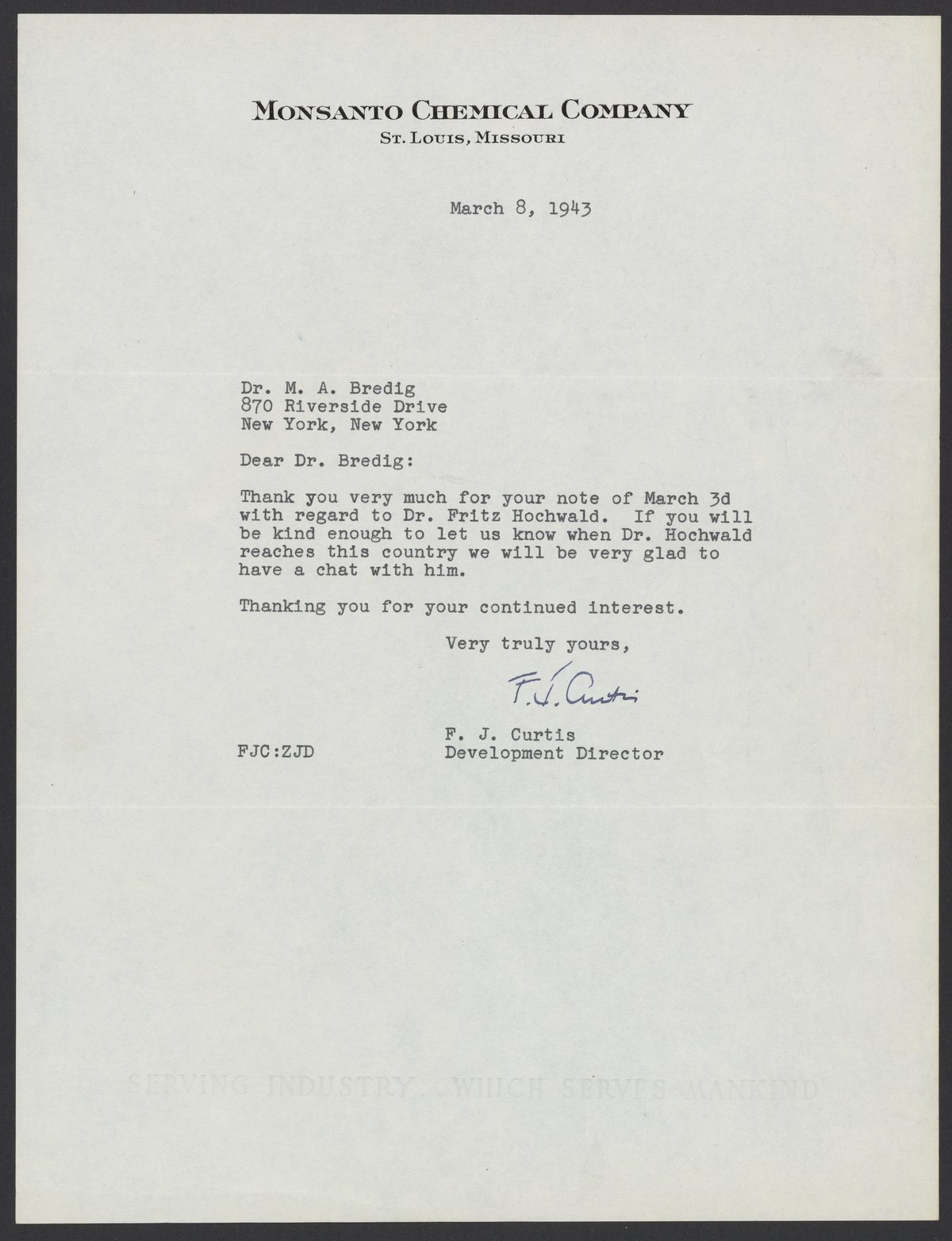 Letter from Francis J. Curtis to Max Bredig, March 8, 1943