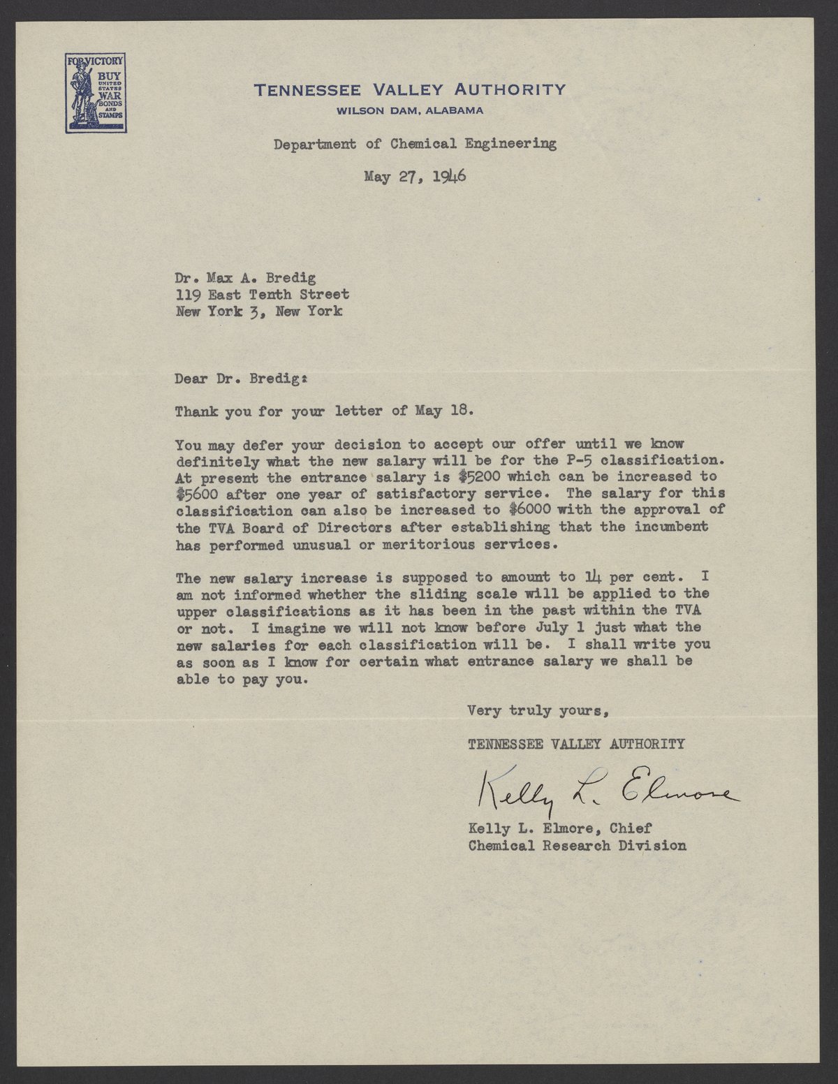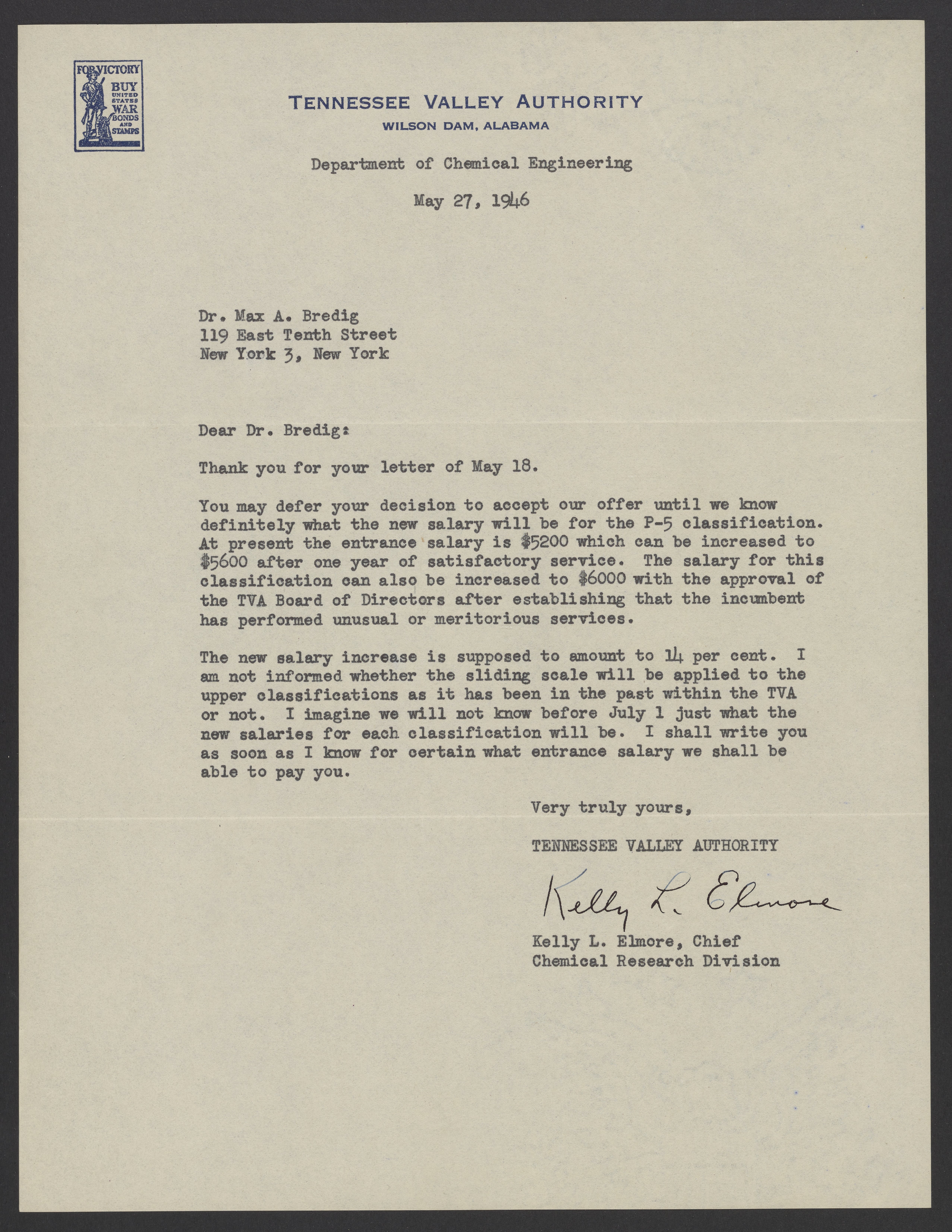 Letter from Kelly L. Elmore to Max Bredig, May 27, 1946