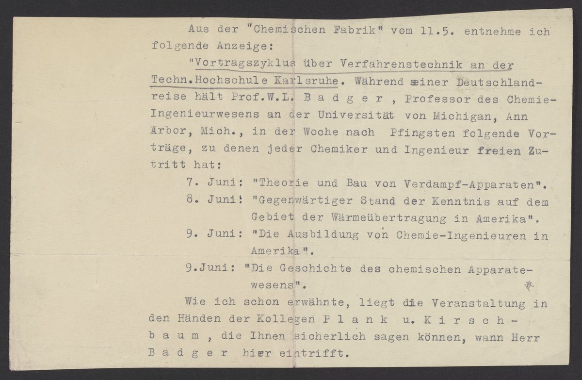 Part of a letter from an unidentified sender. The letter contains an advertisement for "Lecture Series on Process Engineering” at the Karlsruhe Technical University, featuring Prof. W. L. Badger (1886 - 1958), a chemical engineer and professor from the University of Michigan, Ann Arbor.