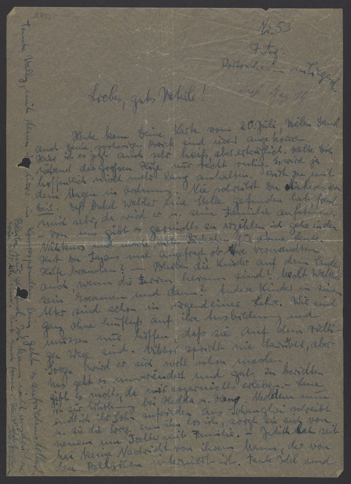 Heute kam Deine Karte vom 20. Juli, vielen Dank! Auch Deine vorherigen Briefe sind immer angekommen. Hier ist es jetzt auch sehr heiß, aber erträglich. Halte Dich während der großen Hitze nur recht ruhig. Es wird ja hoffentlich nicht mehr lang anhalten. Bist Du mit dem Magen in Ordnung. Nie schreibst Du Näheres von Dir. Dass Onkel Walther eine Stelle gefunden hat, freut mich sehr, da wird er u. seine Familie anfahren. Von uns gibt es garnichts zu erzählen, ich gehe in den Nähkurs und mache viele Päckchen für arme Leute. Hast Du Fajans mal angefragt, ob ihre Verwandten Hilfe brauchen? – Bleiben die Kinder auf dem Lande, auch wenn die Ferien herum sind? Macht Walther sein Examen und dann? Andere Kinder in seinem Alter sind schon in einer Lehre. Wir sind ganz ohne Einfluss auf ihre Ausbildung und müssen nur hoffen, daß sie auf dem richtigen Wege sind. Viktor spricht nie darüber, aber Sorgen wird er sich wohl machen.