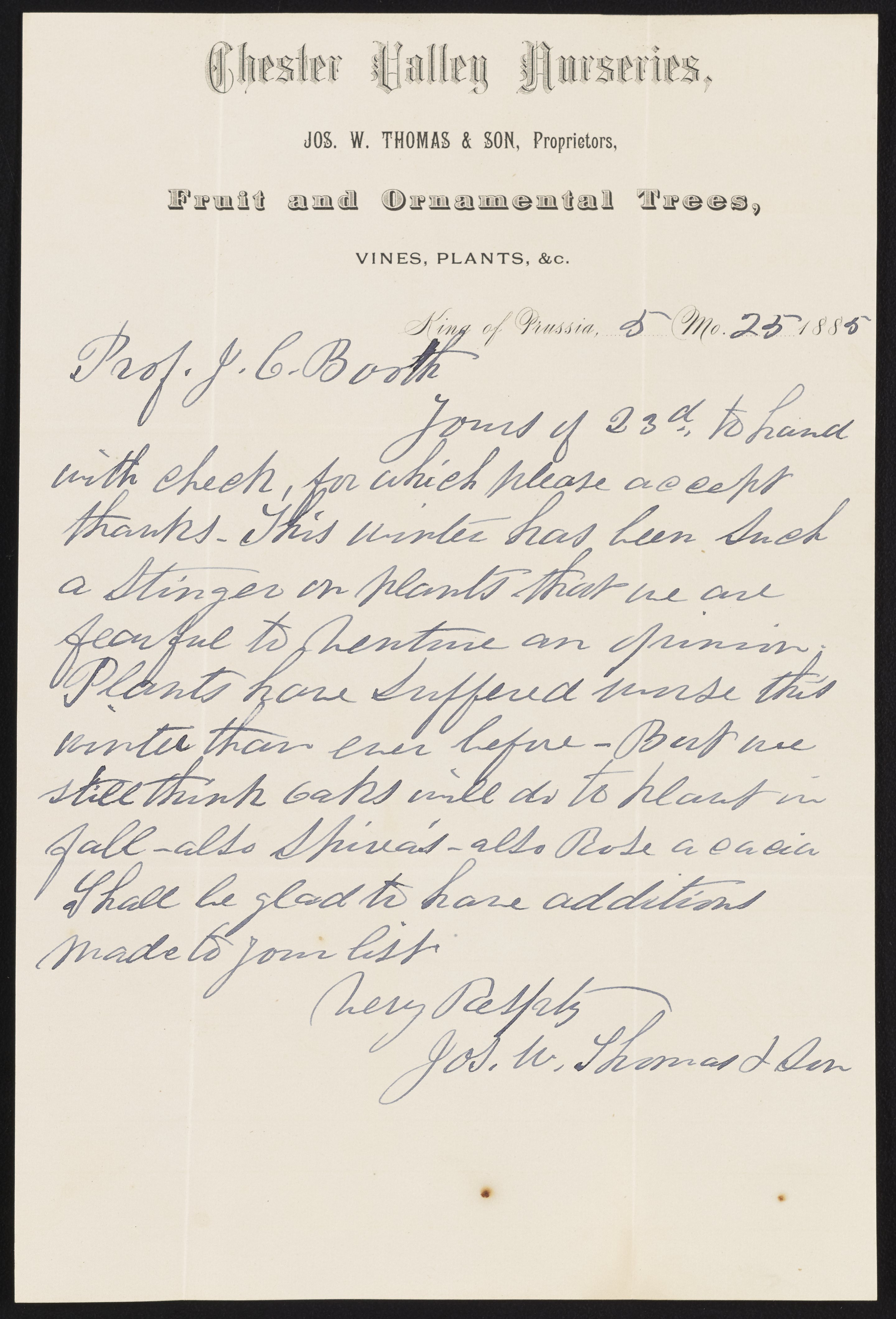Thomas, Joseph W. “Letter from J.W. Thomas to James Curtis Booth, May 25, 1885,” May 25, 1885. Papers of James Curtis Booth, Box 2, Folder 10. Science History Institute. Philadelphia. https://digital.sciencehistory.org/works/ofjz751.