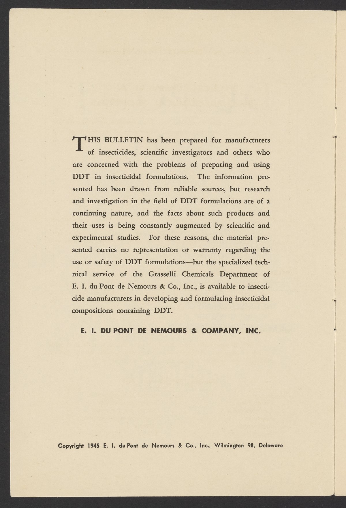 Small JPG1200 x 1759px — 254 KBFull-sized JPG2562 x 3756px — 1.1 MBOriginal fileTIFF — 2562 x 3756px — 27.5 MBTechnical bulletin created by the E. I. du Pont de Nemours & Company, Inc. regarding the properties of DDT. DDT (dichloro-diphenyl-trichloroethane) was developed as a synthetic insecticide in the 1940s. It was initially used to combat malaria, typhus, and other insect-borne diseases. The EPA banned DDT in 1972 after research showed harmful impacts to wildlife and potential human health risks. Notably, the preface of this report states that "the material presented carries no representation or warranty regarding the use or safety of DDT formulations."