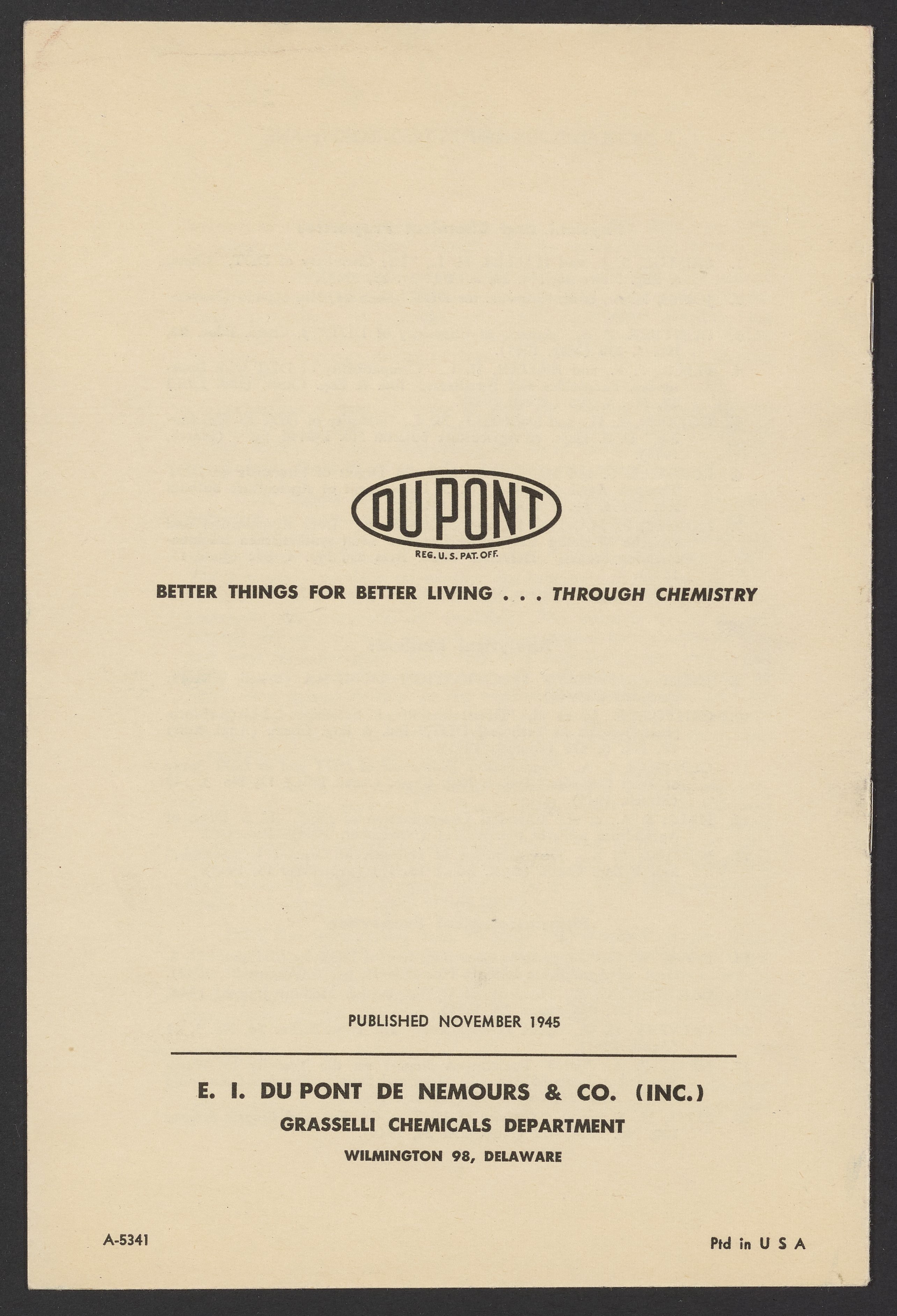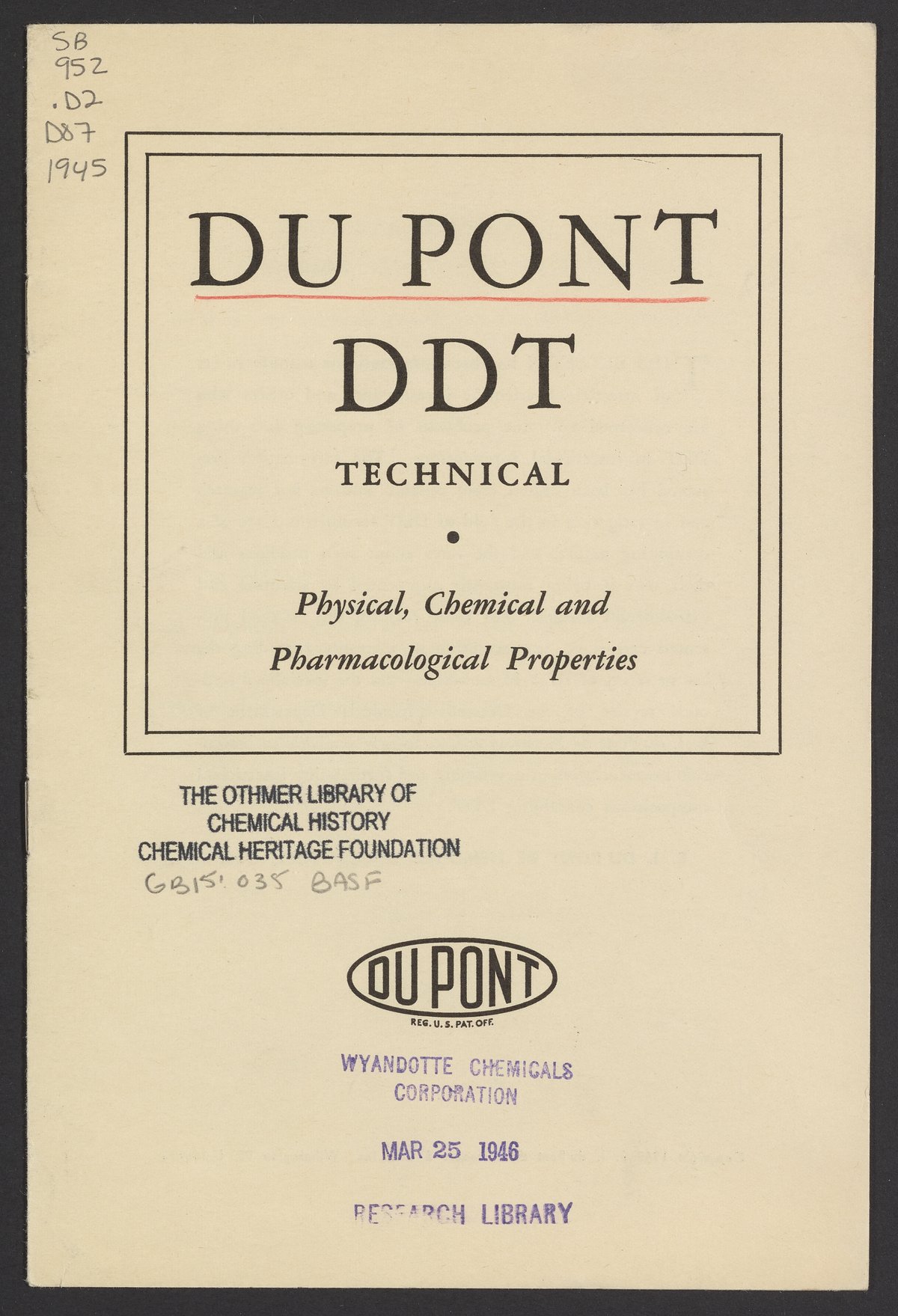 E.I. du Pont de Nemours & Company. Grasselli Chemicals Department. “Du Pont DDT Technical : Physical, Chemical and Pharmacological Properties.” Wilmington, Delaware: E.I. du Pont de Nemours & Company, 1945. SB952.D2 D87 1945. Science History Institute. Philadelphia. https://digital.sciencehistory.org/works/oggbhcf.