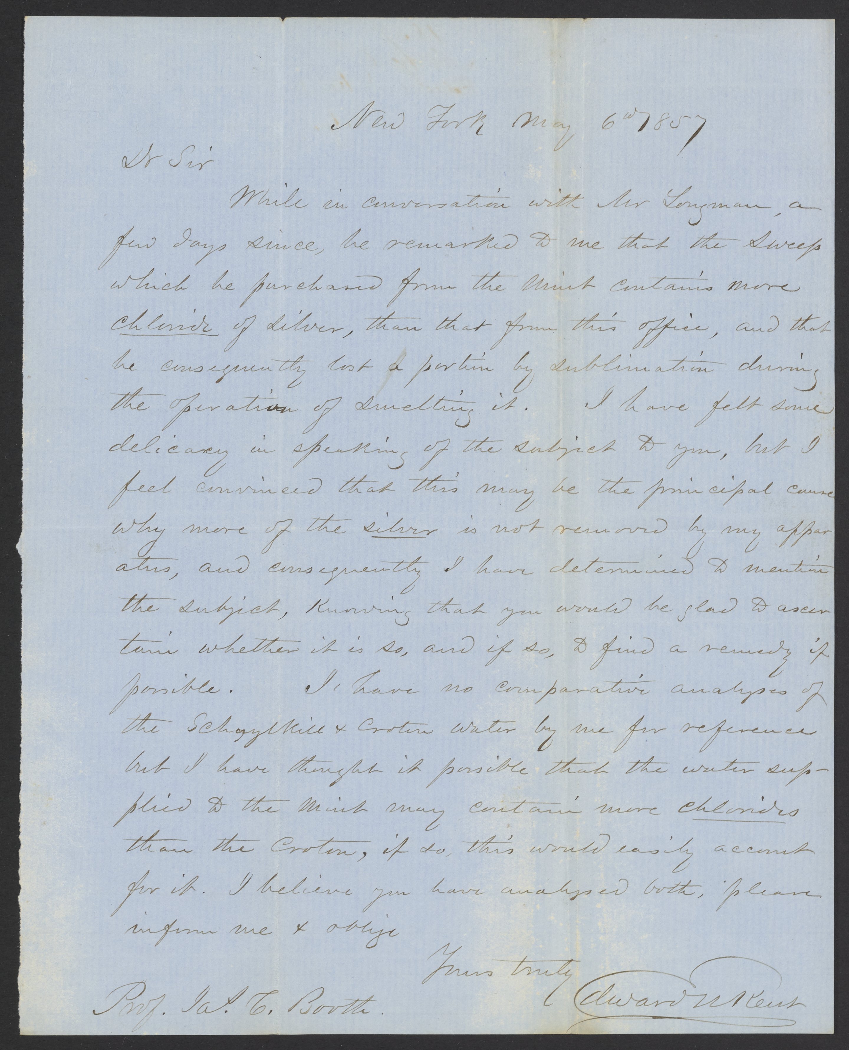 Kent, Edward. “Letter from Edward N. Kent to James Curtis Booth, May 6, 1857,” May 6, 1857. Papers of James Curtis Booth, Box 1, Folder 9. Science History Institute. Philadelphia. https://digital.sciencehistory.org/works/ok1py1k.