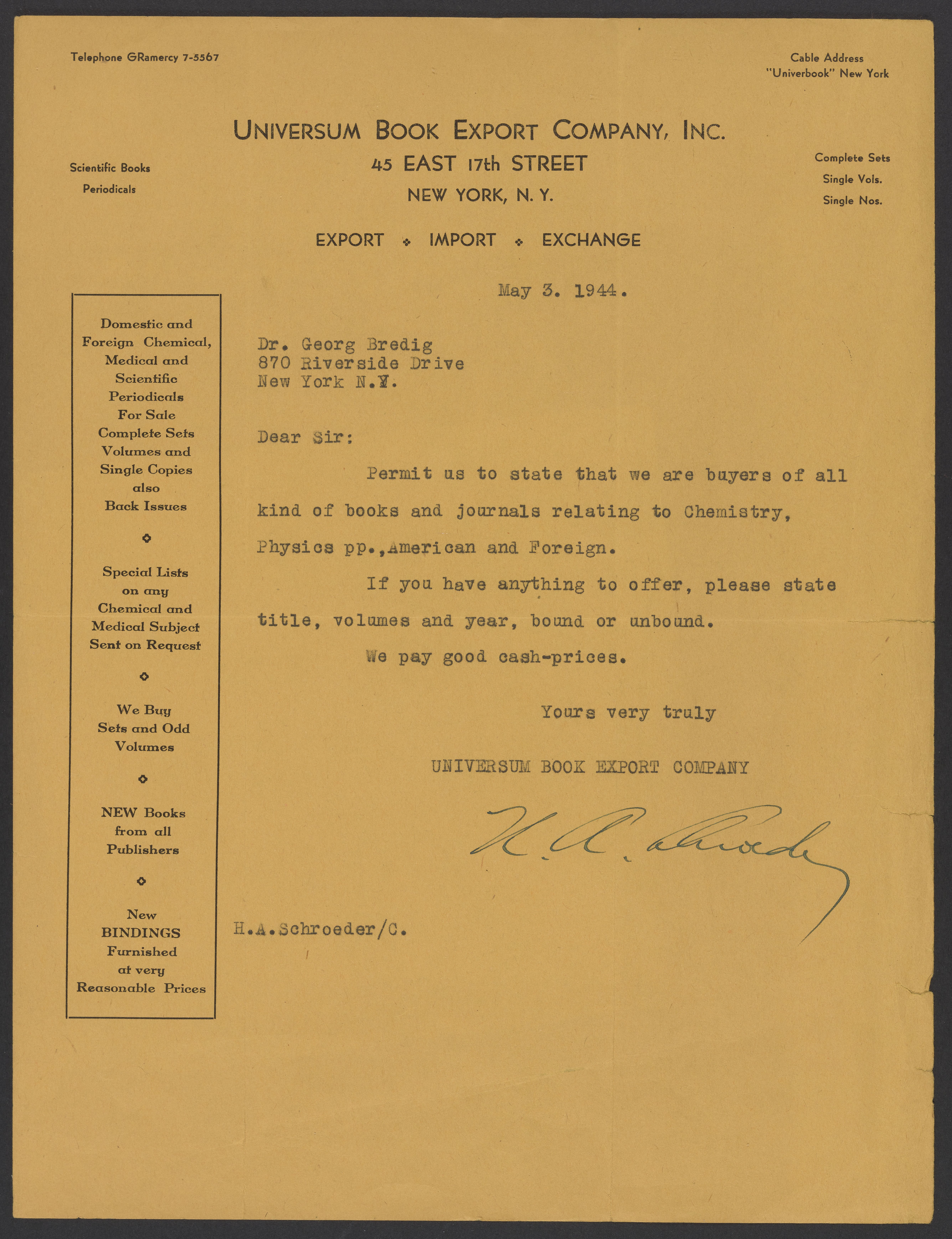 Schroeder, H. A. “Letter from Universum Book Export Company to Georg Bredig,” May 3, 1944. Papers of Georg and Max Bredig, Box 2, Folder 60. Science History Institute. Philadelphia. https://digital.sciencehistory.org/works/om766dx.