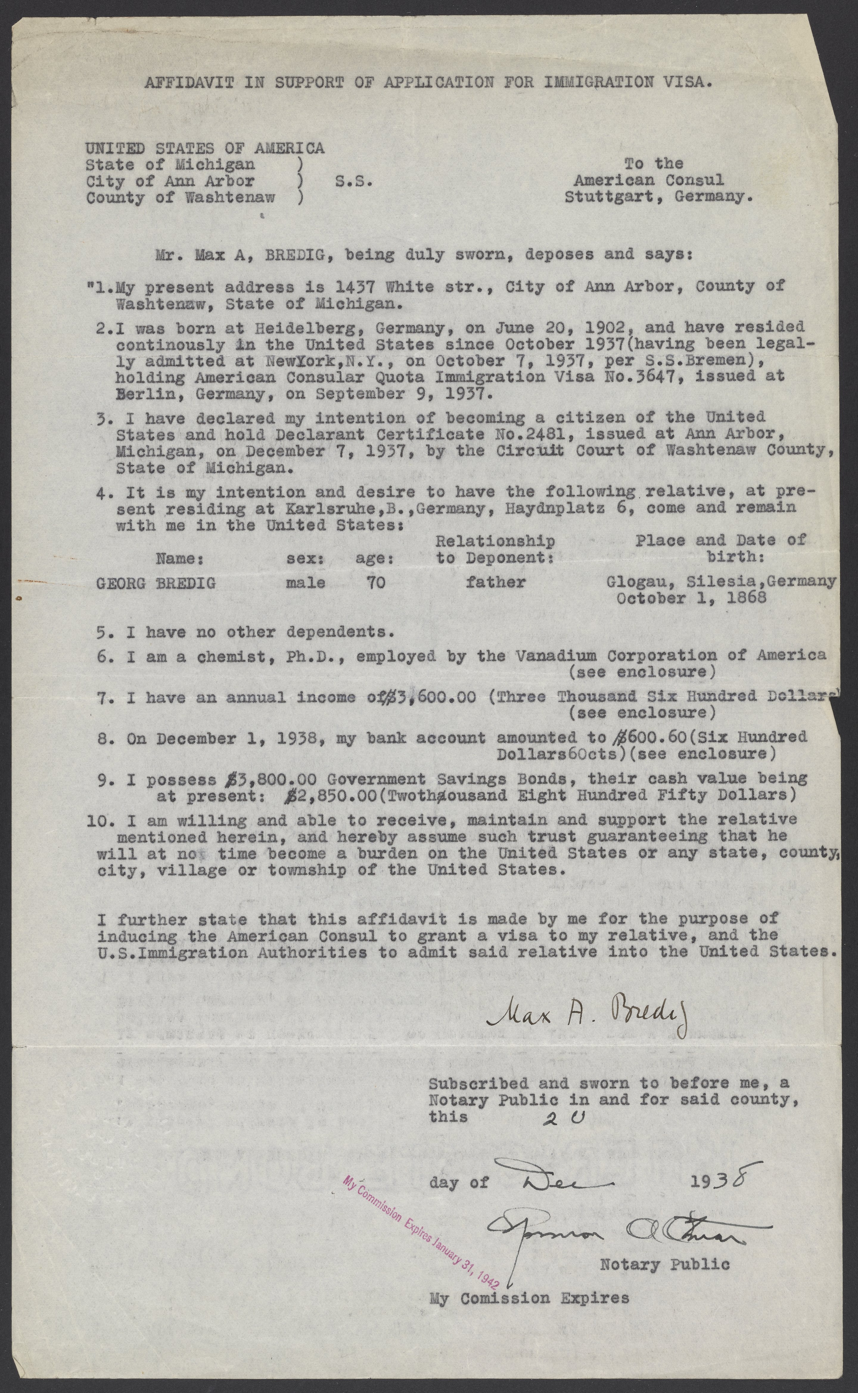 Affidavit of Support from Max Bredig for Georg Bredig