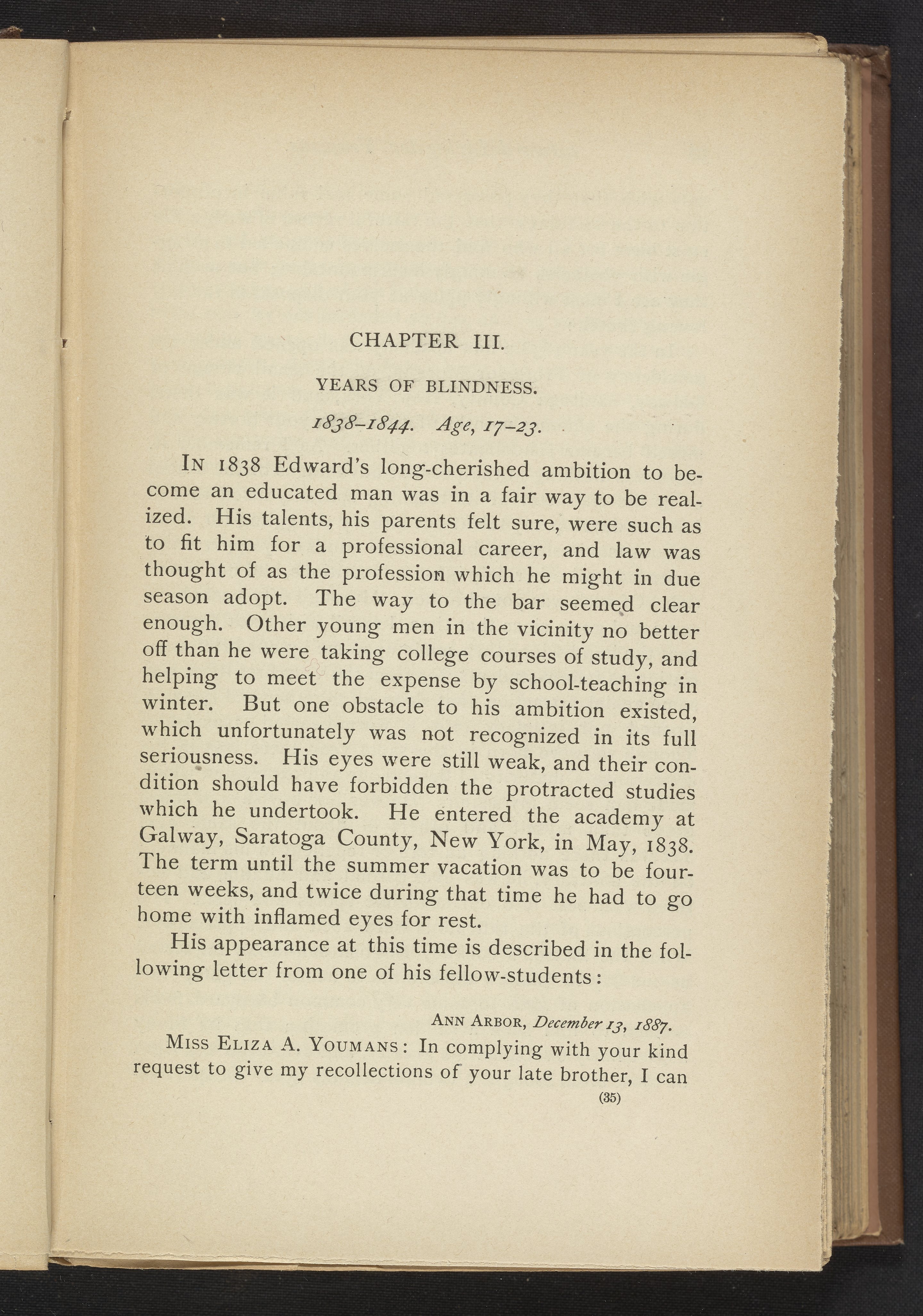 Small JPG1200 x 1737px — 407 KBLarge JPG2880 x 4168px — 2.4 MBFull-sized JPG3534 x 5115px — 3.5 MBOriginal fileTIFF — 3534 x 5115px — 51.8 MBBiography of American scientific writer, editor and lecturer Edward Livingston Youmans (1821-1887) who founded Popular Science magazine. Youman experienced partial blindness at age 17, which lasted until he was about 30 years old. The front matter and chapters on his blindness have been digitized from this book.