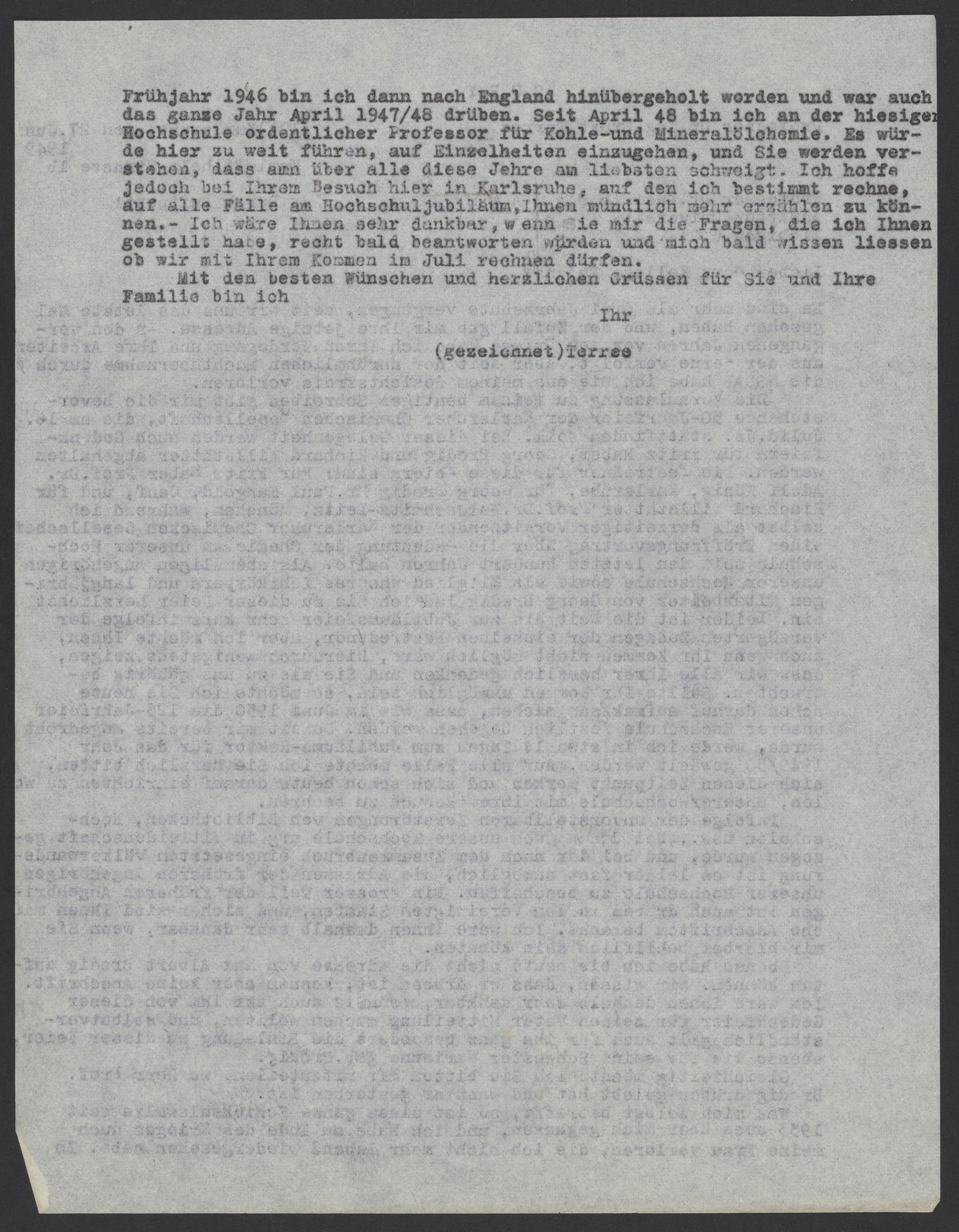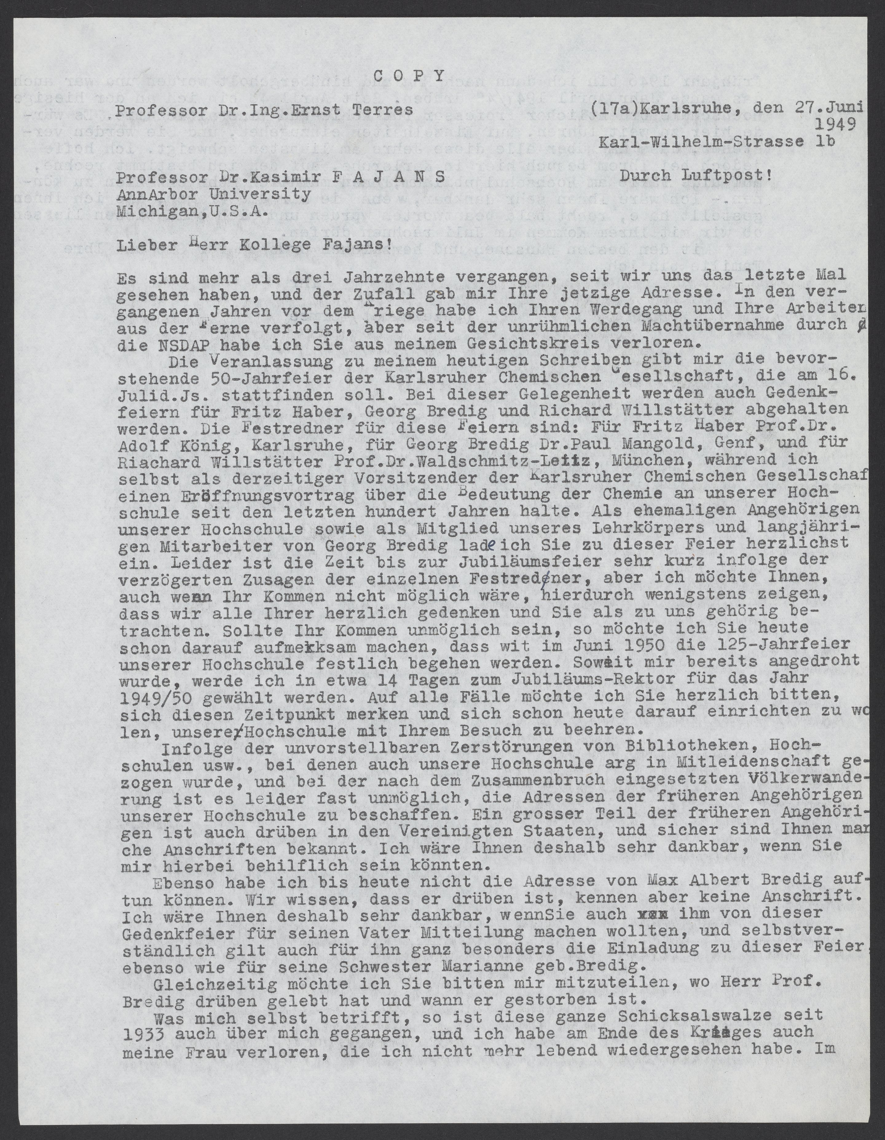 Letter from Ernst Terres to Kasimir Fajans, June 27, 1949