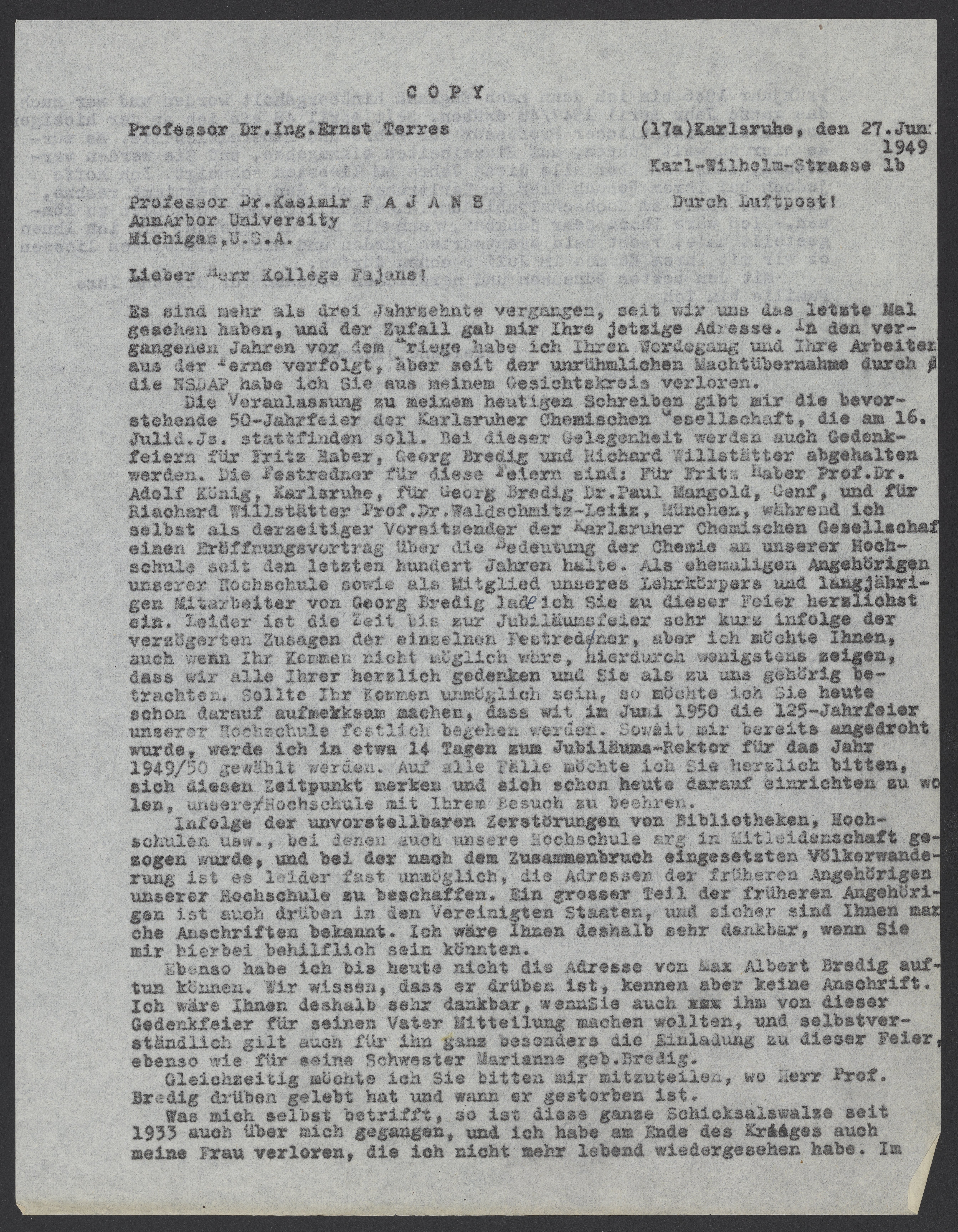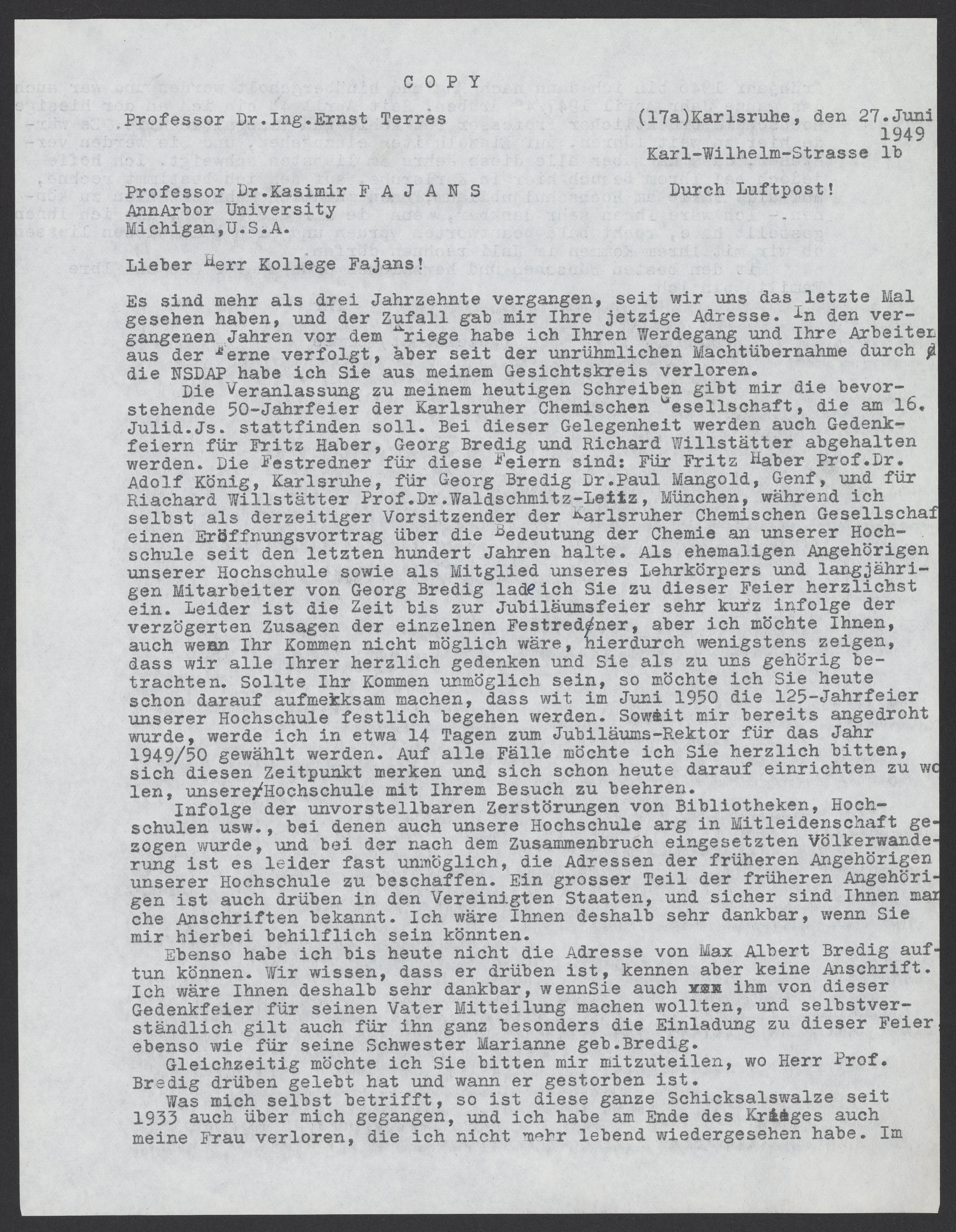 Die Veranlassung zu meinem heutigen Schreiben gibt mir die bevorstehende 50-Jahrfeier der Karlsruher Chemischen Gesellschaft, die am 16. Juli d.Js. stattfinden soll. Bei dieser Gelegenheit werden auch Gedenkfeier für Fritz Haber, Georg Bredig und Richard Willstätter abgehalten werden. Die Festredner für diese Feiern sind: Für Fritz Haber Prof. Dr. Adolf König, für Georg Bredig Dr. Paul Mangold, Genf, und für Richard Willstätter Prof. Dr. Waldschmitz-Leitz, München, während ich selbst als derzeitiger Vorsitzender der Karlsruher Chemischen Gesellschaft einen Eröffnungsvortrag über die Bedeutung der Chemie an unserer Hochschule seit den letzten hundert Jahren halte. Als ehemaligen Angehörigen unserer Hochschule sowie als Mitglied unseres Lehrkörpers und langjährigen Mitarbeiter von Georg Bredig lade ich Sie zu dieser Feier herzlichst ein. Leider ist die Zeit bis zur Jubiläumsfeier sehr kurz infolge der verzögerten Zusagen der einzelnen Festredner, aber ich möchte Ihnen, auch wenn Ihr Kommen nicht möglich wäre, hierdurch wenigstens zeigen, dass wir alle Ihrer herzlich gedenken und Sie als zu uns gehörig betrachten. Sollte Ihr Kommen unmöglich sein, so möchte ich Sie heute schon darauf aufmerksam machen, dass wir im Juni 1950 die 125-Jahrfeier unserer Hochschule festlich begehen werden. Soweit mir bereits angedroht wurde, werde ich in etwa 14 Tagen zum Jubiläums-Rektor für das Jahr 1949/50 gewählt werden. Auf alle Fälle möchte ich Sie herzlich bitten, sich diesem Zeitpunkt merken und sich schon heute darauf einrichten zu wollen, unsere Hochschule mit Ihrem Besuch zu beehren.