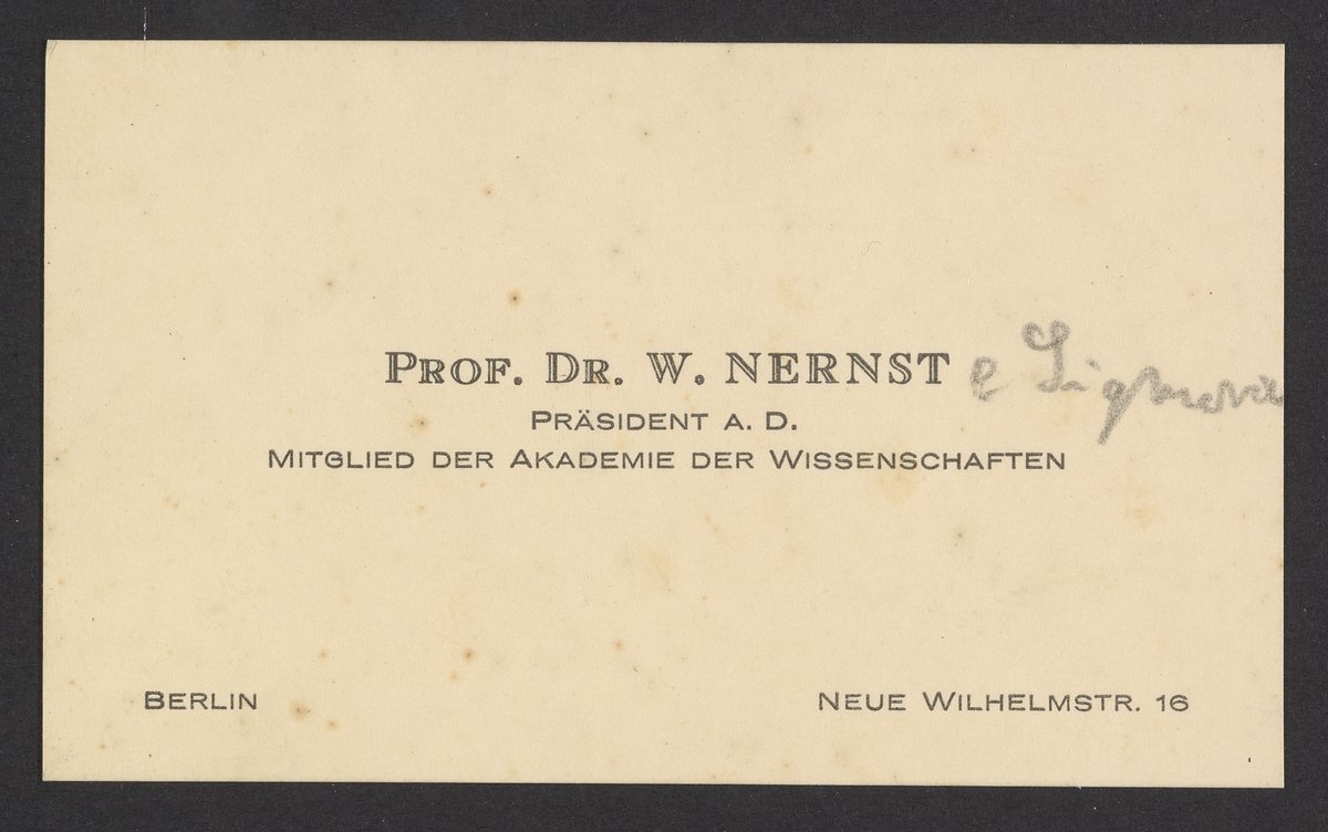 Nernst, Walther. “Walther Nernst's Personal Calling Card,” circa 1900. Papers of Georg and Max Bredig, Box 2, Folder 29. Science History Institute. Philadelphia. https://digital.sciencehistory.org/works/othrosi.