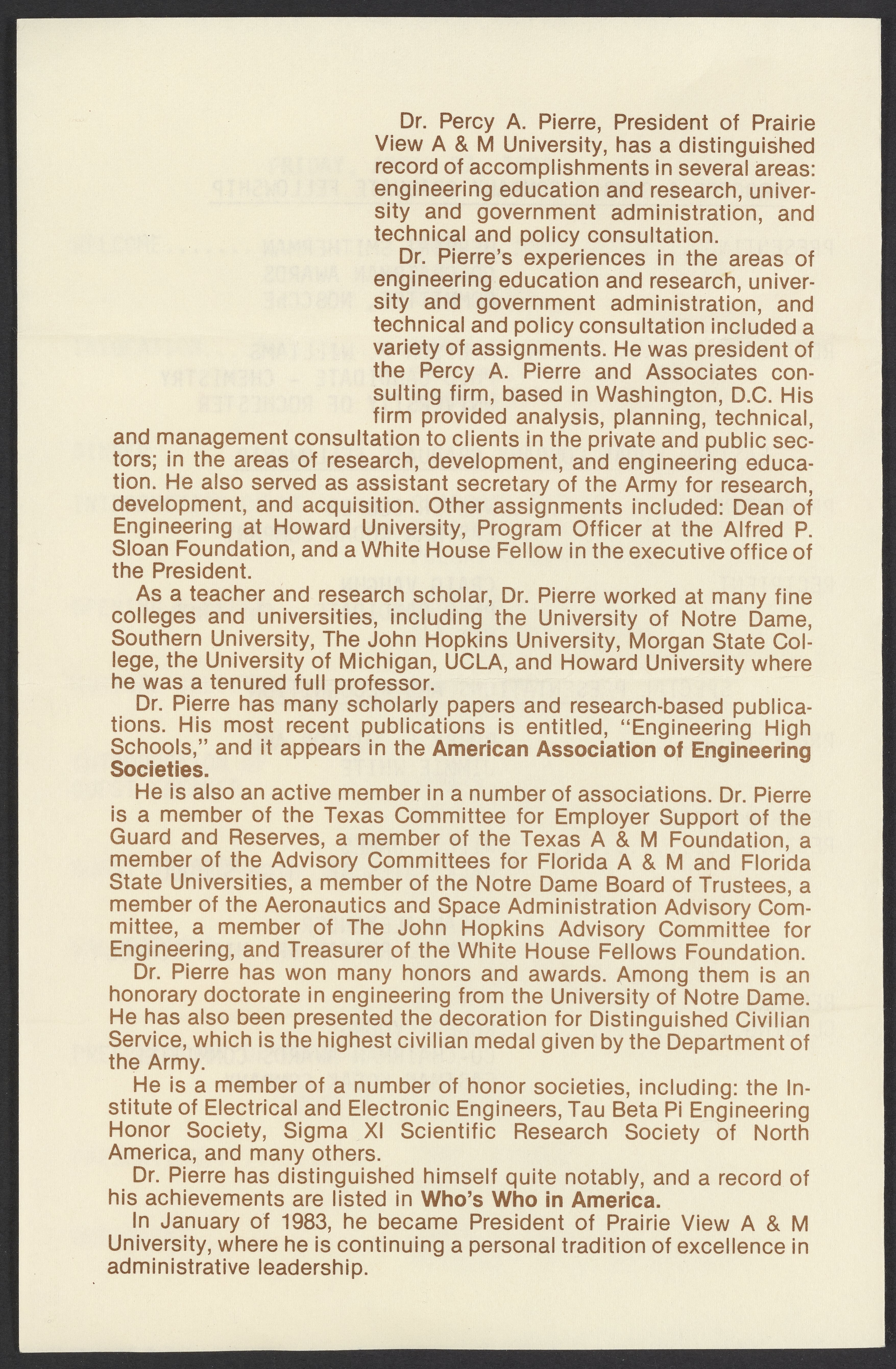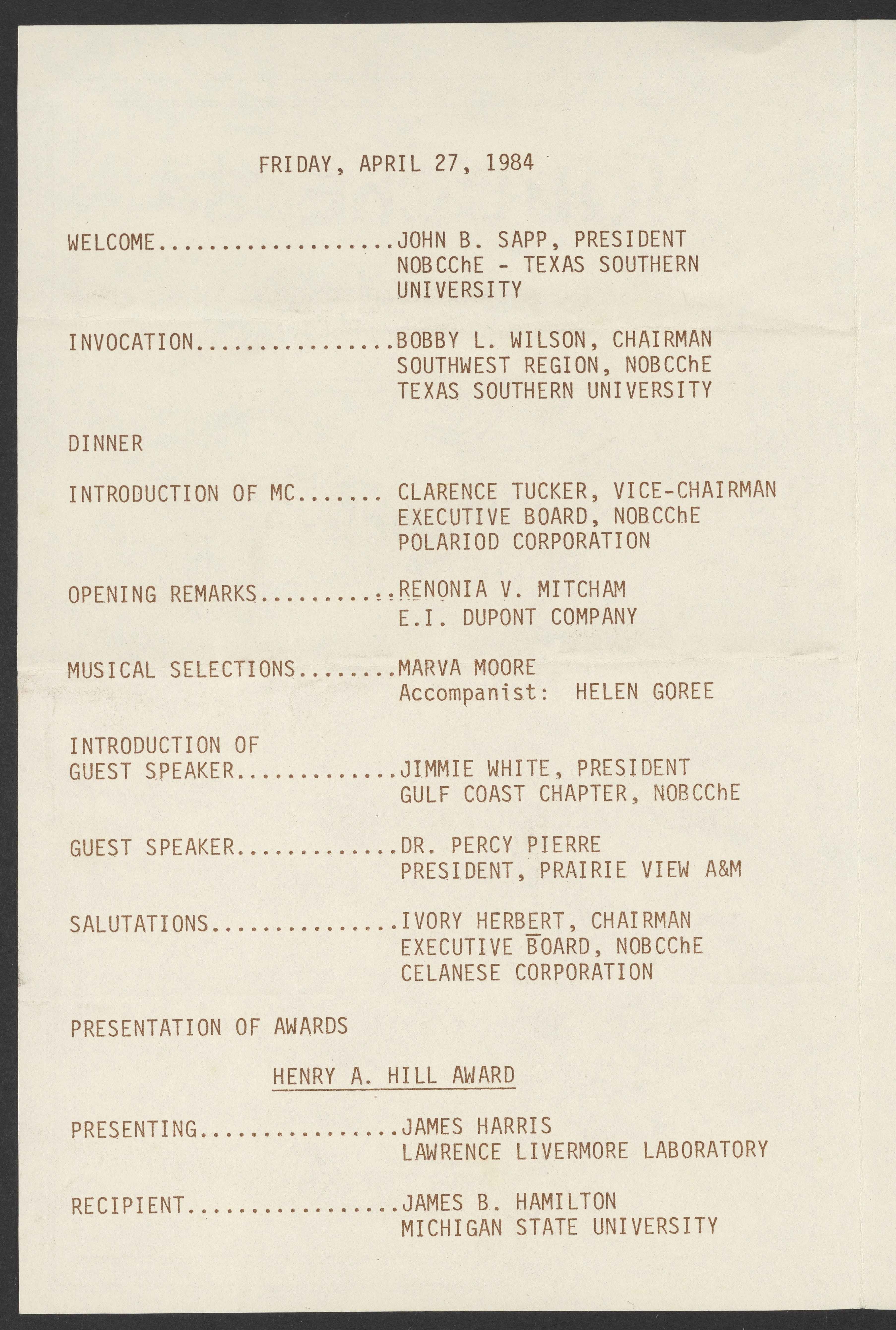 Small JPG1200 x 1819px — 312 KBLarge JPG2880 x 4365px — 1.7 MBFull-sized JPG3527 x 5346px — 2.5 MBOriginal fileTIFF — 3527 x 5346px — 54.0 MBProgram for the April 27, 1984 awards banquet held at the 11th annual meeting of the National Organization for the Professional Advancement of Black Chemists and Chemical Engineers (NOBCChE). The program also includes a short biography of Percy A. Pierre (1939-), the guest speaker for the event.