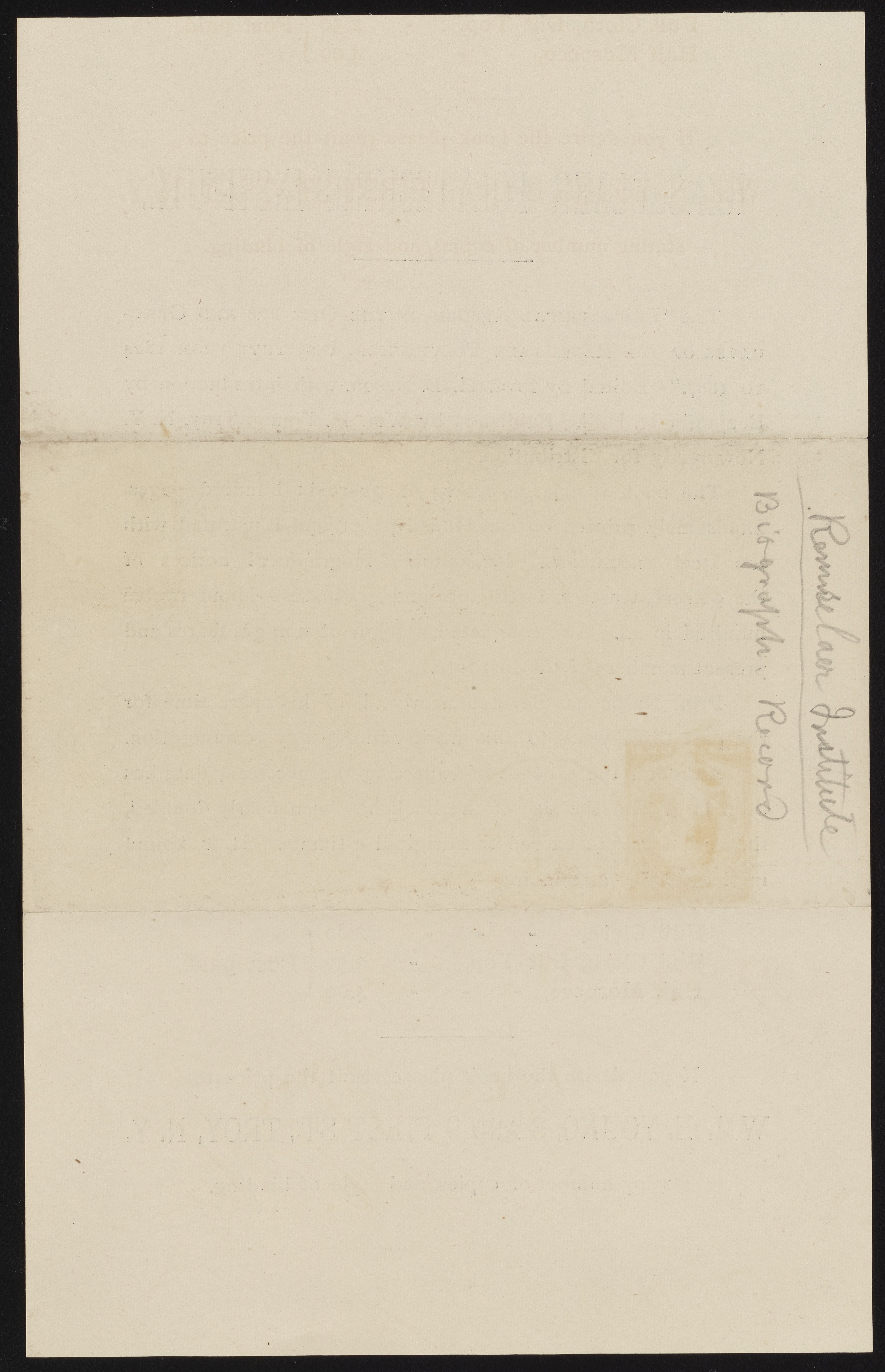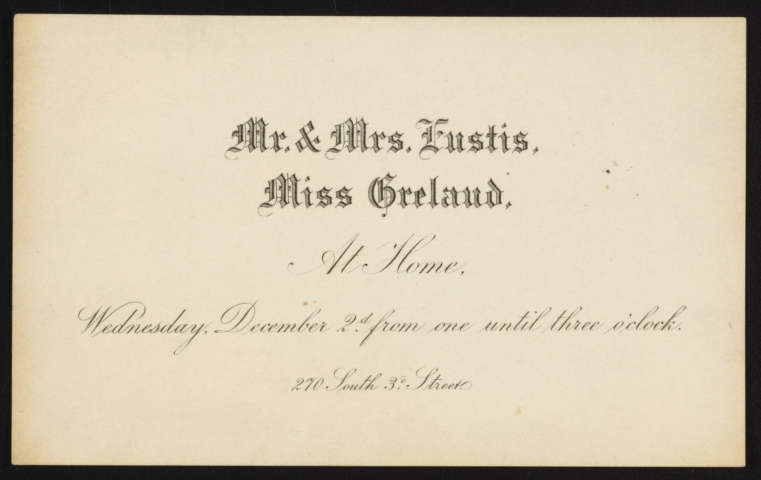 Small JPG1200 x 703px — 91.2 KBFull-sized JPG2812 x 1648px — 416 KBOriginal fileTIFF — 2812 x 1648px — 13.3 MBIncludes two tickets and an announcement for various lectures given by James Curtis Booth (1810-1888) at the University of Pennsylvania, an invitation to the wedding of Bessie and Arthur Van Harlingen, an advertisement for a publication by the Rensselaer Polytechnic Institute, and a calling card for a Mr. and Mrs. Eustis.
