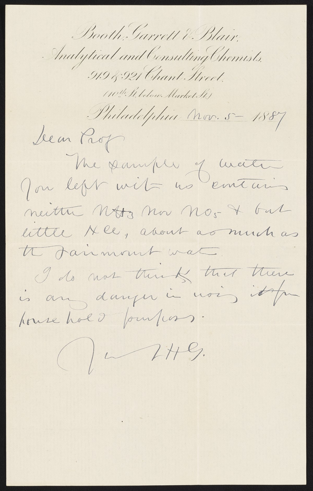 Small JPG1200 x 1883px — 240 KBLarge JPG2880 x 4520px — 1.3 MBFull-sized JPG3194 x 5013px — 1.6 MBOriginal fileTIFF — 3194 x 5013px — 45.9 MBIn 1836, James Booth started a student laboratory in Philadelphia where men could obtain practical training in chemistry - especially analytical chemistry - by personal instruction. With him were associated successively Martin H. Boyé (1812-1909), Thomas H. Garrett, and Andrew A. Blair. In 1878 the firm became Booth, Garrett & Blair. This letter from Thomas H. Garrett concerns local parsonage water analysis.