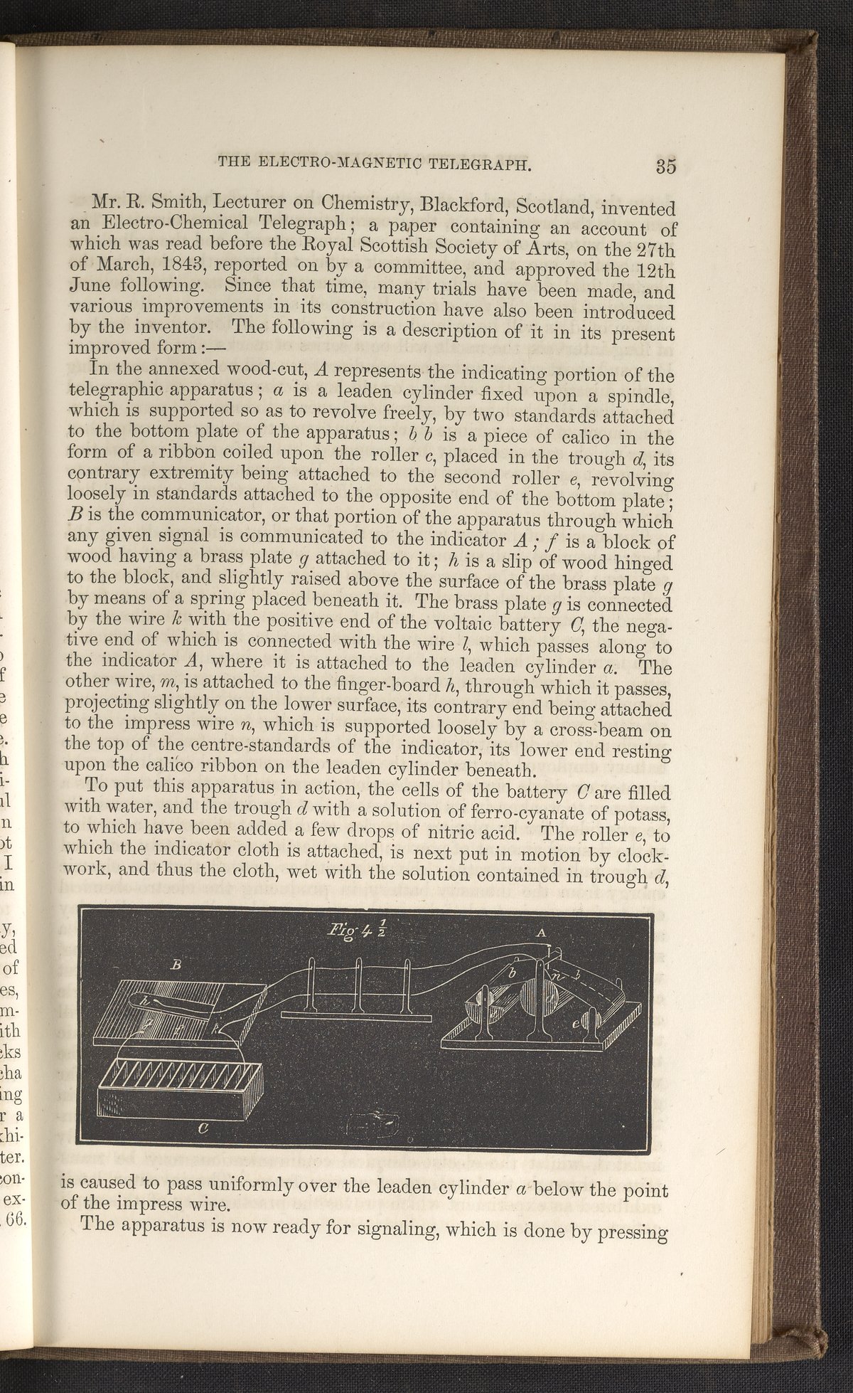 Text and woodcut diagram from page 35 of the 1853 volume The Electro Magnetic Telegraph detailing the primary components of an electro-chemical telegraph, including the indicator (a) and communicator portions (b), voltaic battery (c), roller (e), and finger-board (h).