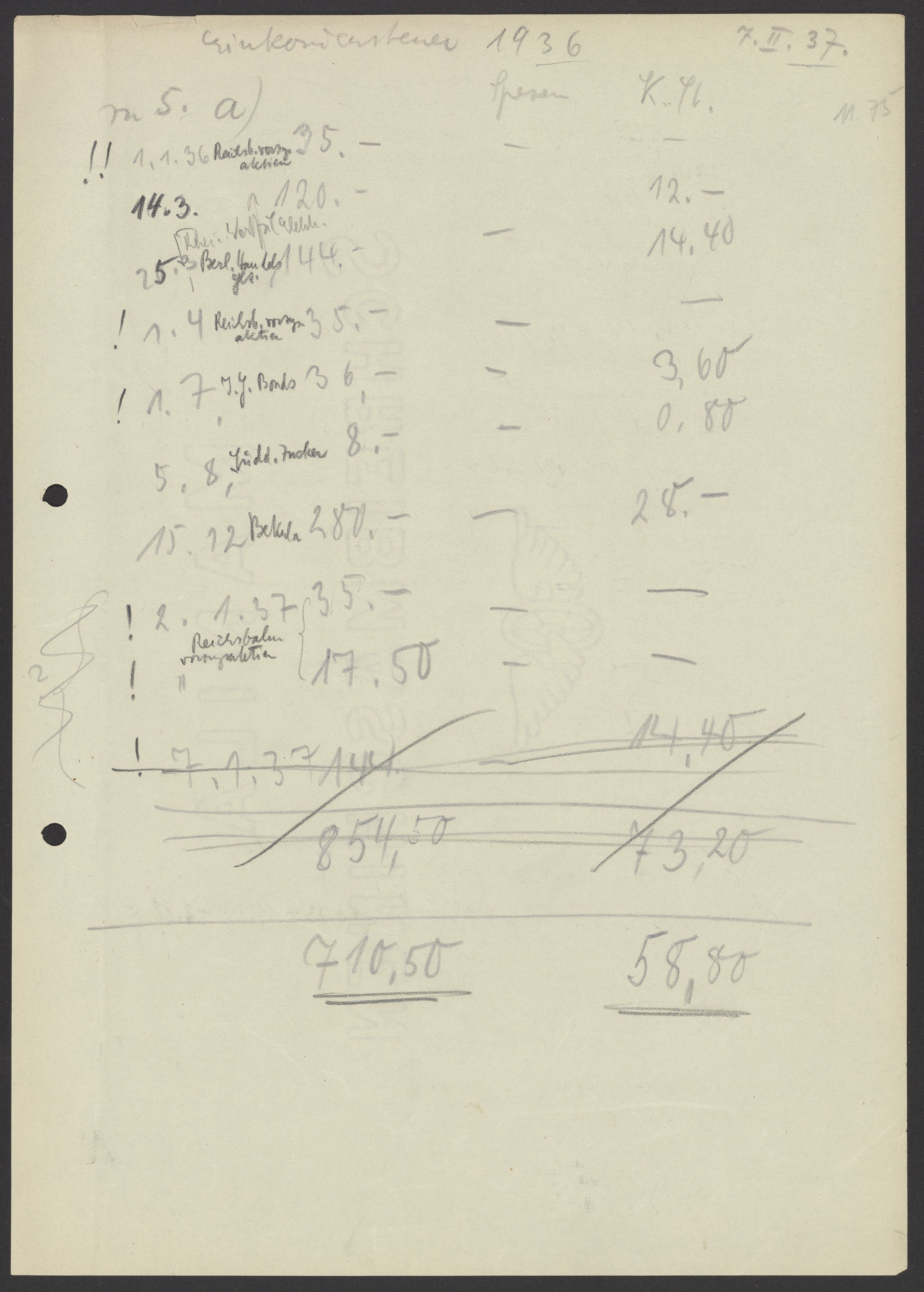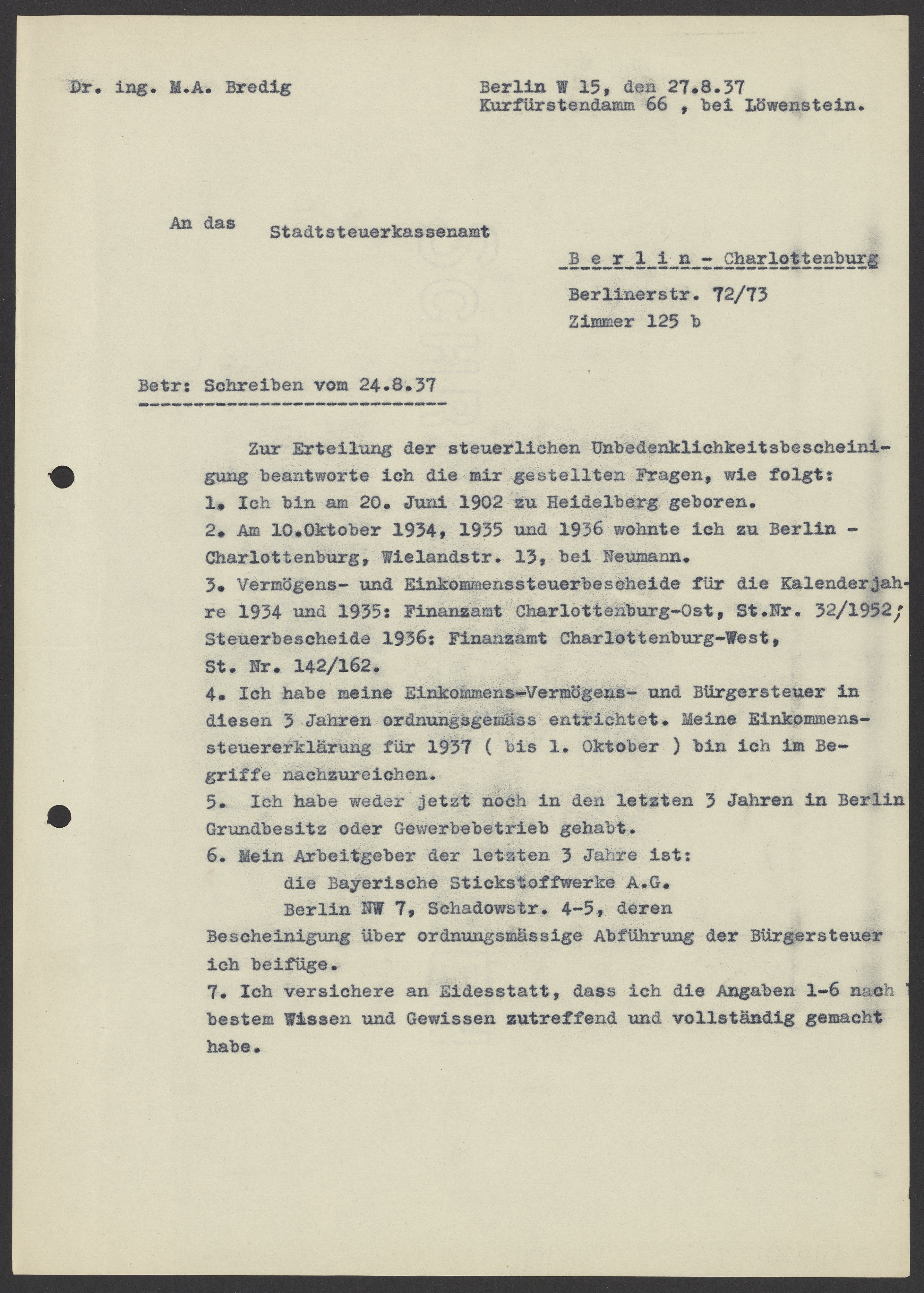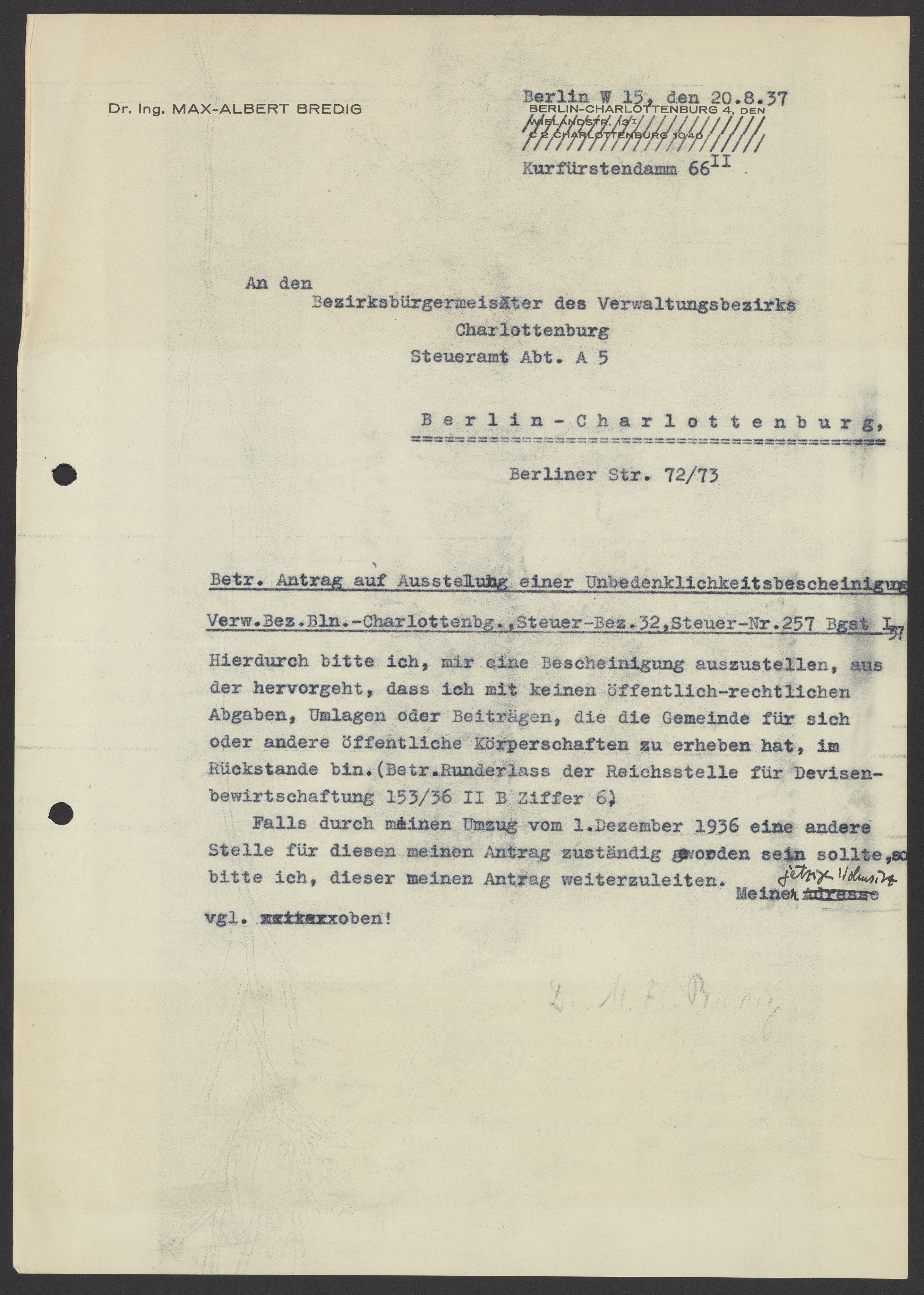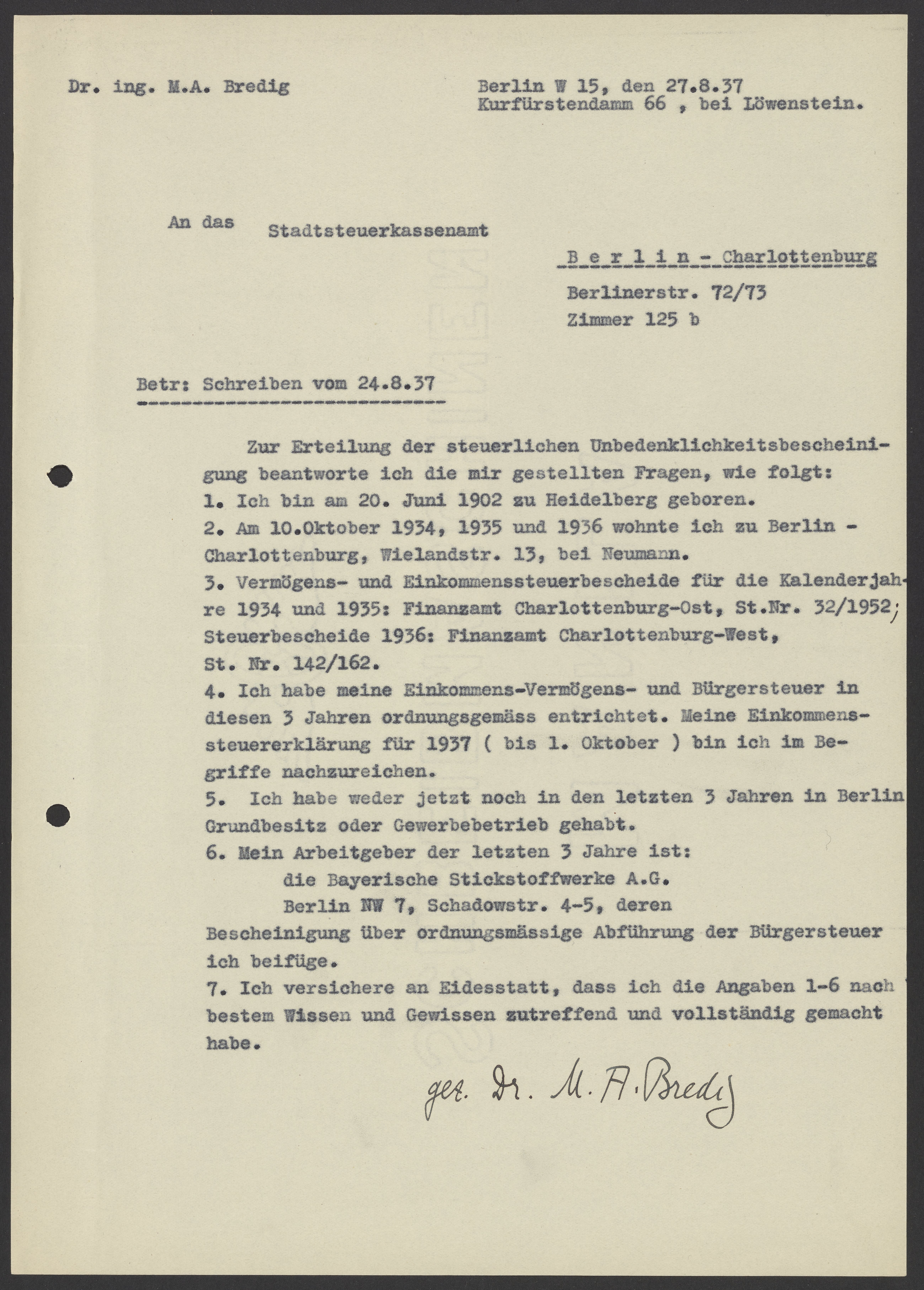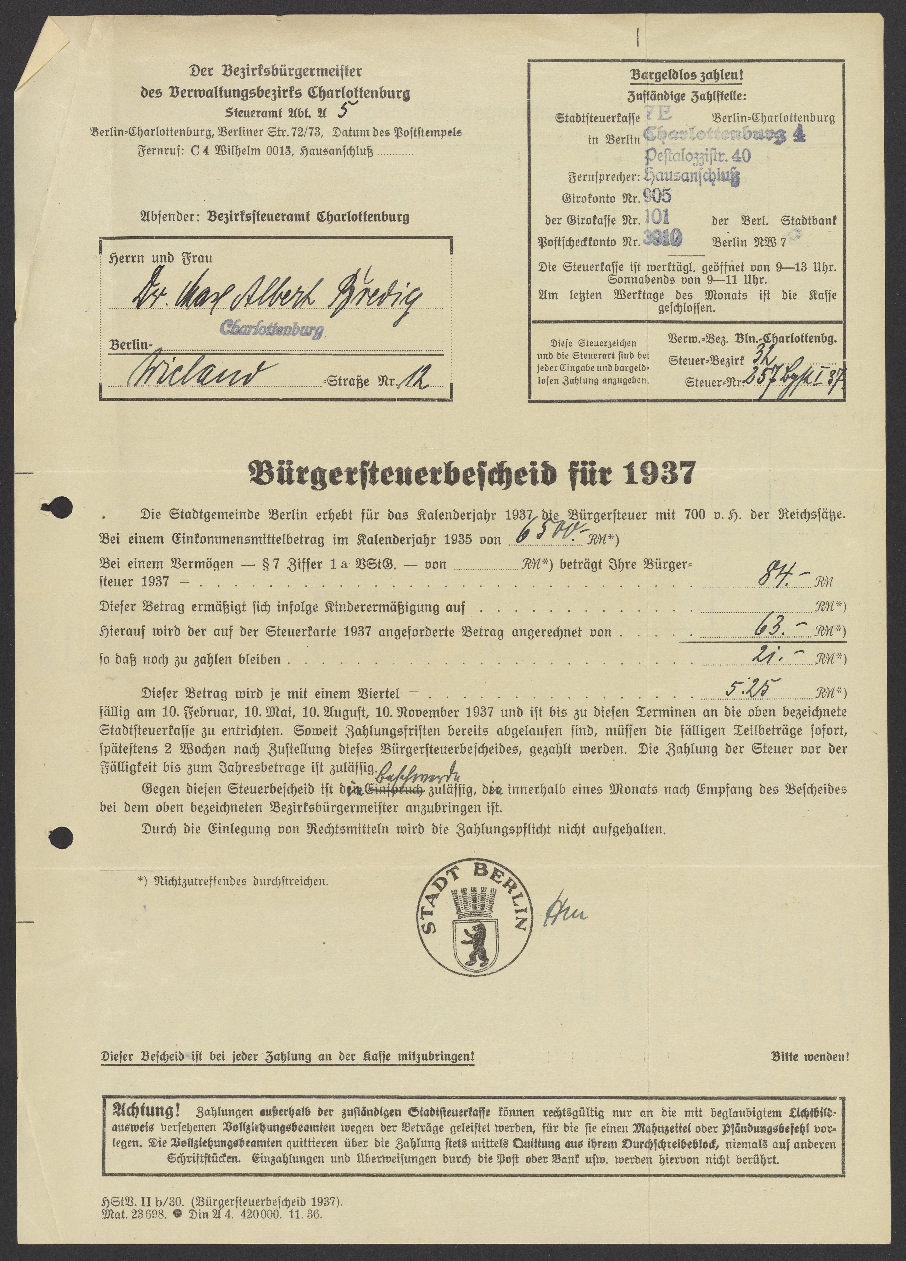 Financial documents of Max Bredig, 1937