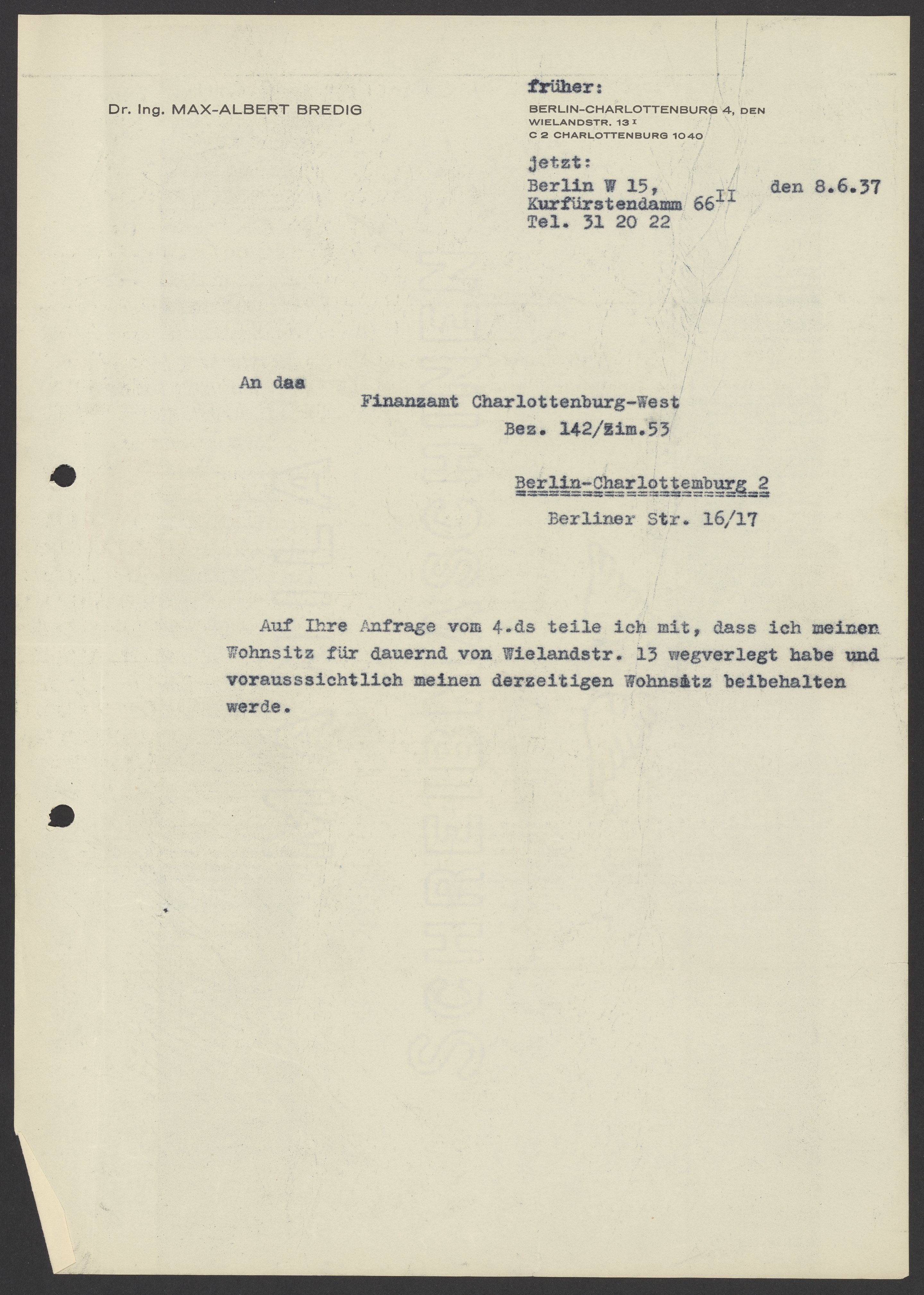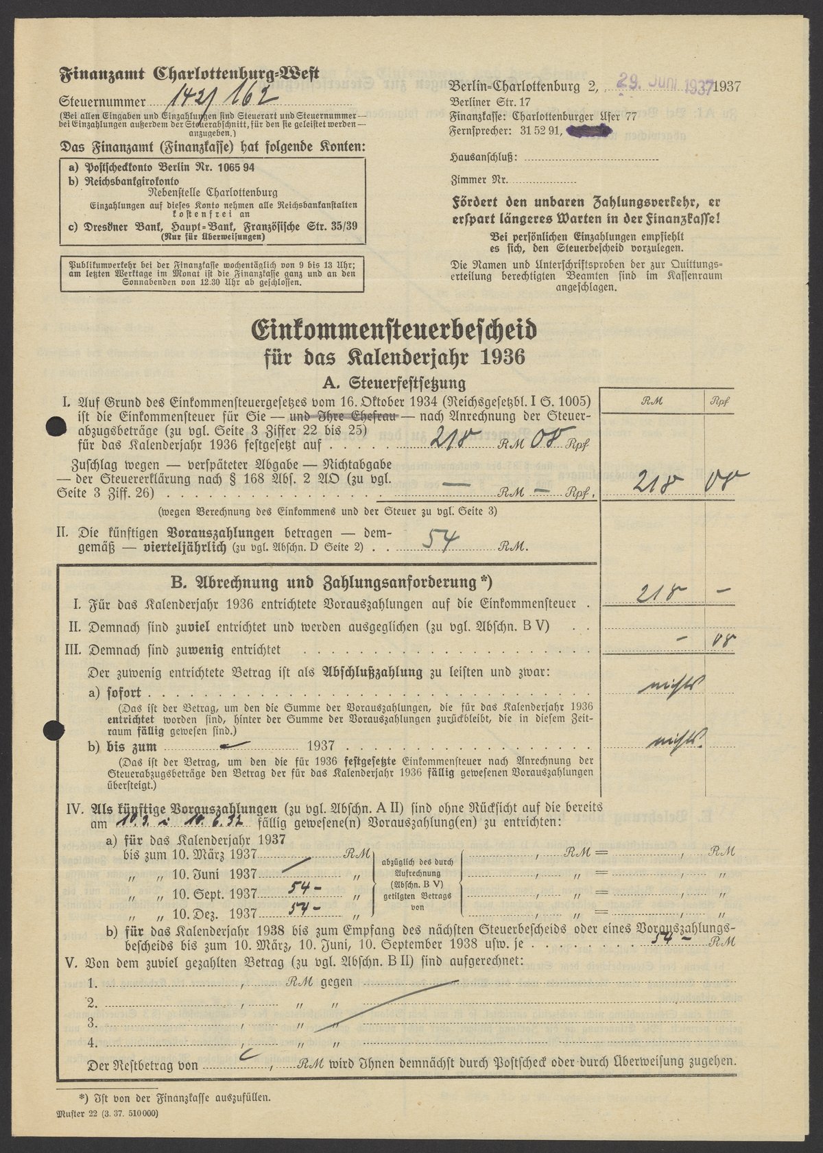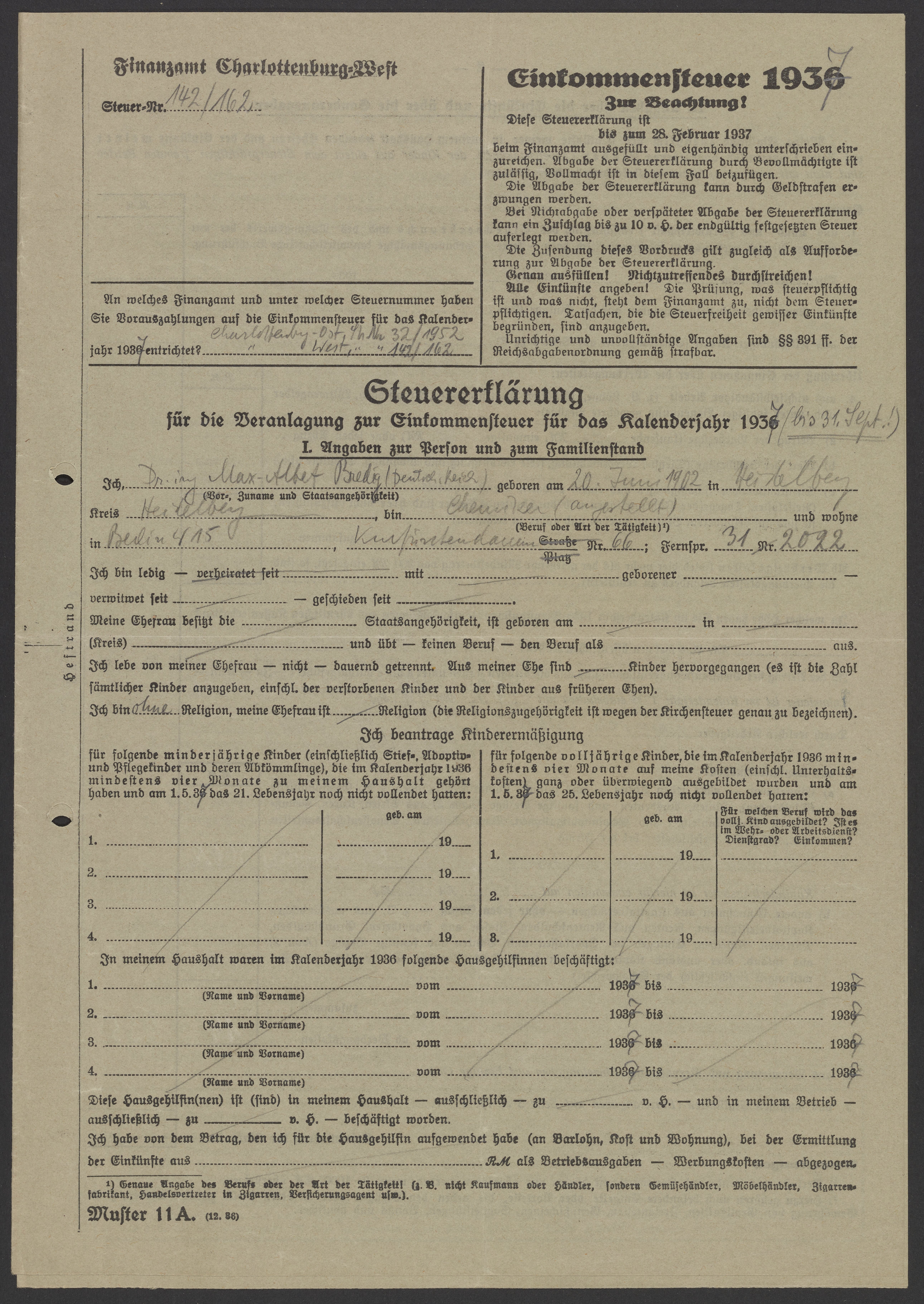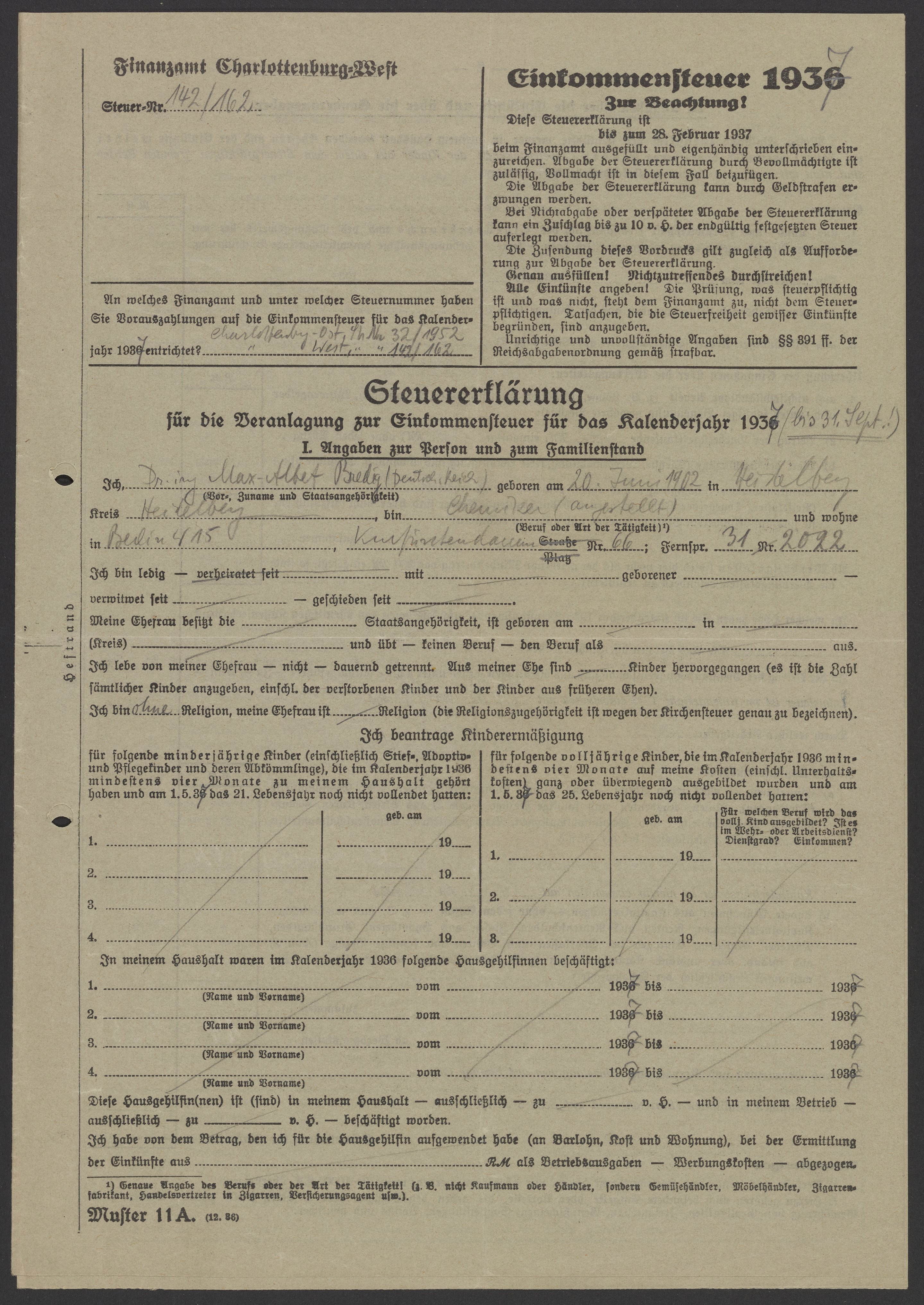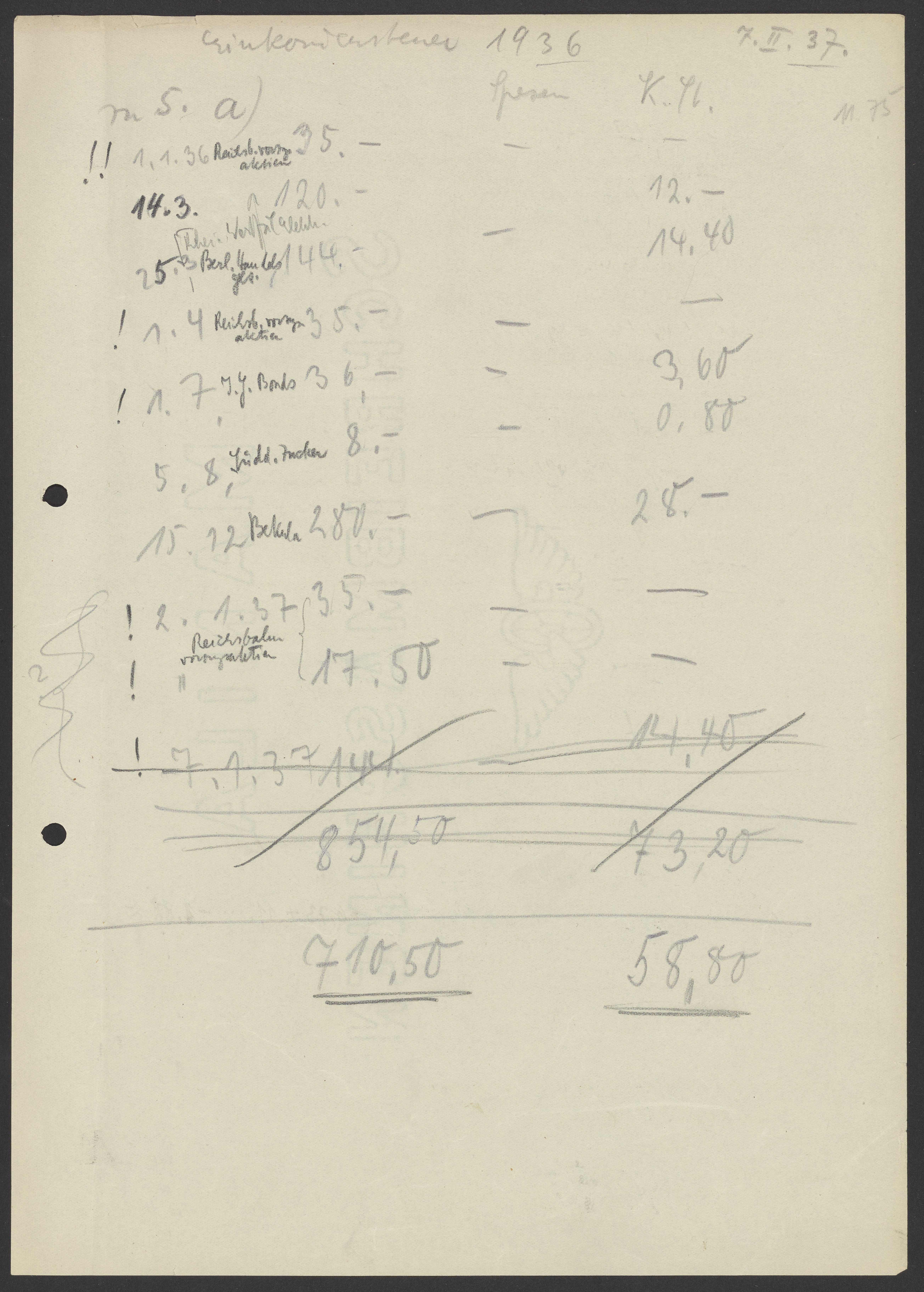 Financial documents of Max Bredig, 1937