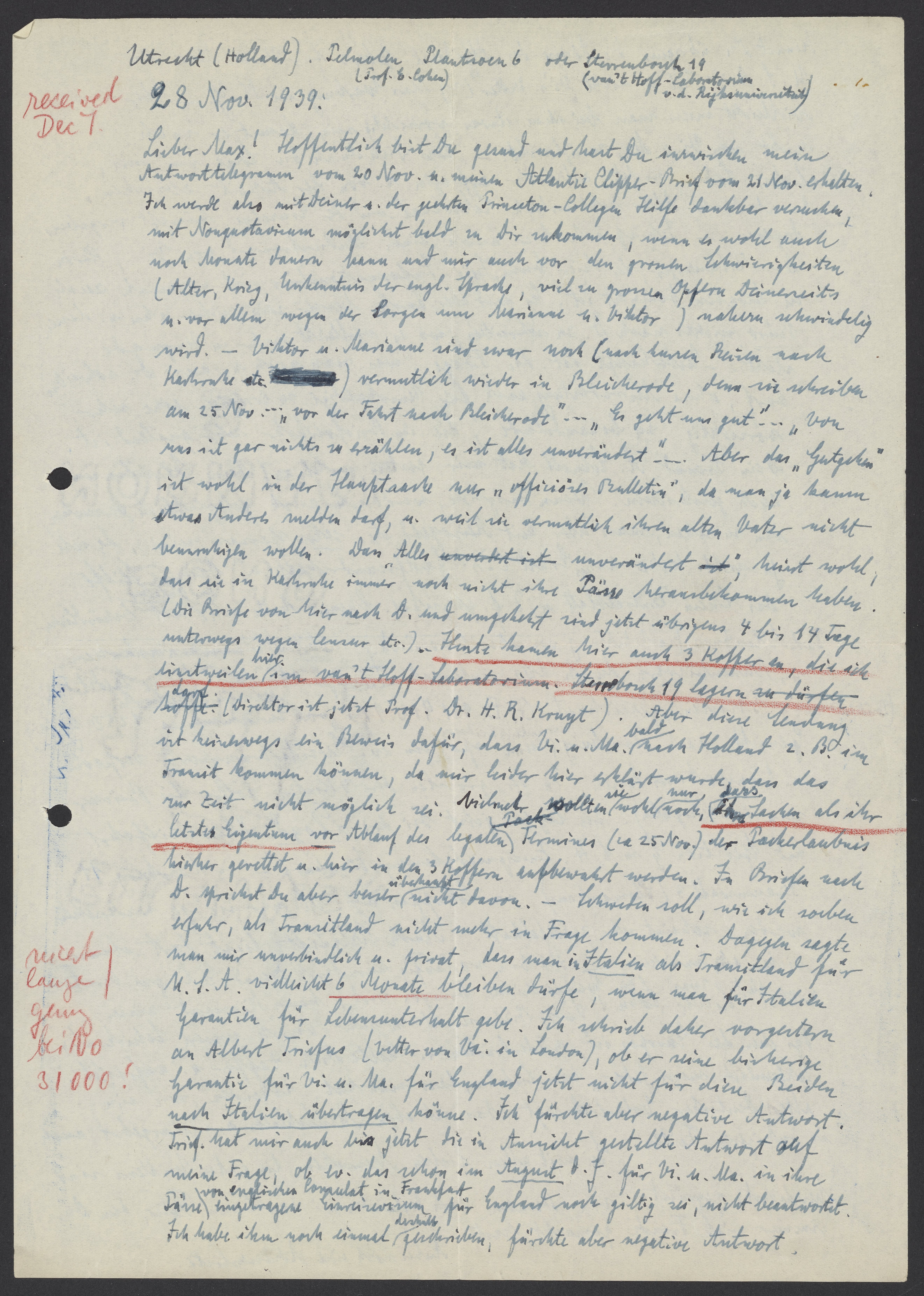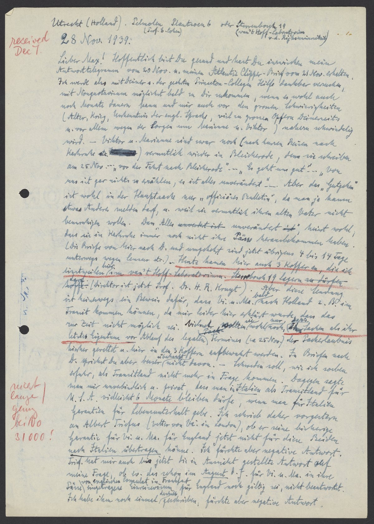 Lieber Max! Hoffentlich bist Du gesund und hast Du inzwischen mein Antworttelegram vom 21 Nov. u. mein Atlantic Clipper- Brief vom 21. Nov. erhalten. Ich werde also mit Deiner u. der gestern Princeton-Collegen Hilfe dankbar versuchen, mit Nonquotavisum möglichst bald zu Dir zukommen, wenn es wohl auch noch Monate dauern kann und mir auch vor den grossen Schwierigkeiten (Alter, Krieg, Unerkenntnis der engl. Sprache, viel u grossen Opfern Deinerseits u. vor allem wegen der Sorgen um Marianne und Viktor) nahezu schwindelig wird. – Viktor u. Marianne sind zwar noch (nach kurzen Reisen nach Karls etc.) vermutlich wieder in Bleicherode, denn sie schreiben am 25. Nov… „vor der Fahrt nach Bleicherode“ … „Es geht uns gut“… „von uns ist gar nichts zu erzählen, es ist alles unverändert“. Aber das „Gutgehen“ ist wohl in der Hauptsache nur „offiziöser Bulletin“, da man ja kaum etwas Anders melden darf, u. weit sie vermutlich ihren alten Vater nicht beunruhigen wollen. Das Alles „unverändert“ meint wohl, dass sie in Karlsruhe immer noch nicht ihre Pässe herausbekommen haben. (Die Briefe von hier nach D. und umgekehrt sind jetzt übrigens 4 bis 14 Tage unterwegs wegen Censur etc.) Heute kamen hier 3 Koffer an, die sich einstweilen hier im van’t Hoff Laboratorium. Sterrenbosch 19 lagern dürfen: (Direktor ist jetzt Prof. Dr. H. R. Kruyt). Aber diese Sendung ist keineswegs ein Beweis dafür, dass Vi. und Ma. bald nach Holland z.B. im Transit kommen können, da mir leider hier erklärt wurde, dass das zur Zeit nicht möglich sei. Vielmehr wollten sie wohl nur noch, dass ihre Sachen als ihr letztes Eigentum vor Ablauf des legalen Termines (ca. 25 Nov) der Packerlaubnis hierher gerettet u. hier in den 3 Koffern aufbewahrt werden. In Briefen nach D. sprichst Du aber besser überhaupt nicht davon. – Schweden soll, wie ich soeben erfuhr, als Transitland nicht mehr in Frage kommen. Dagegen sagte man mir unverbindlich u. privat, dass man in Italien als Transitland für U.S.A 6 Monate bleiben dürfe, wenn man für Italien Garantien für Lebensunterhalt gebe. Ich schrieb daher vorgestern an Albert Triefus (Vetter von Vi. in London), ob er eine bisherige Garantie für Vi. u. Ma. für England jetzt nicht für diese Beiden nach Italien übertragen könne. Ich fürchte aber negative Antwort. Trief. hat mir auch bis jetzt, die in Aussicht gestellte Antwort auf meine Frage, ob ev. das schon im August d.J. für Vi. u. Ma. in ihre Pässe von englischen Consulat in Frankfurt eingetragene Einreisevisum für England noch gültig sei, nicht beantwortet. Ich habe ihm noch einmal geschrieben, fürchte aber negative Antwort.