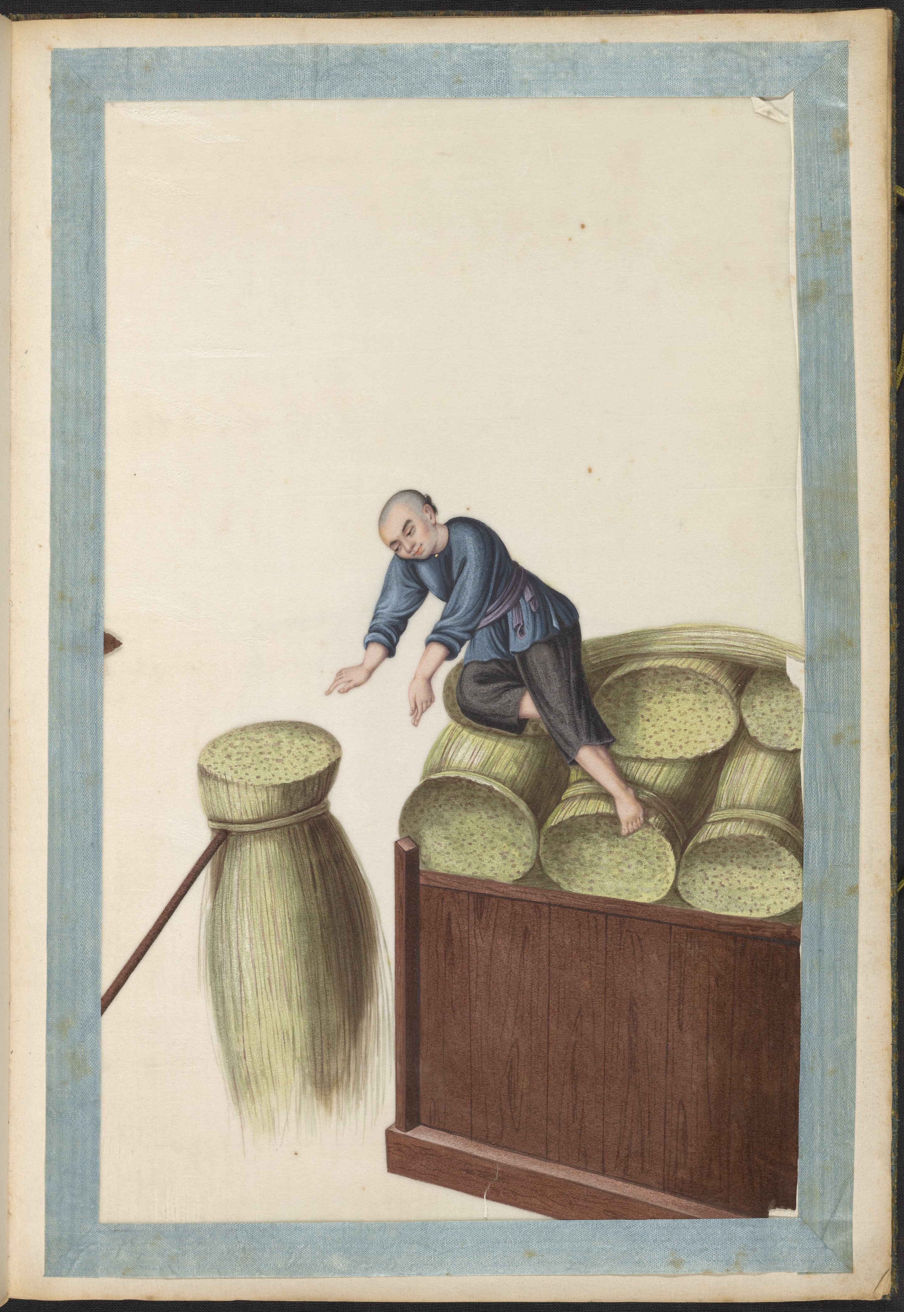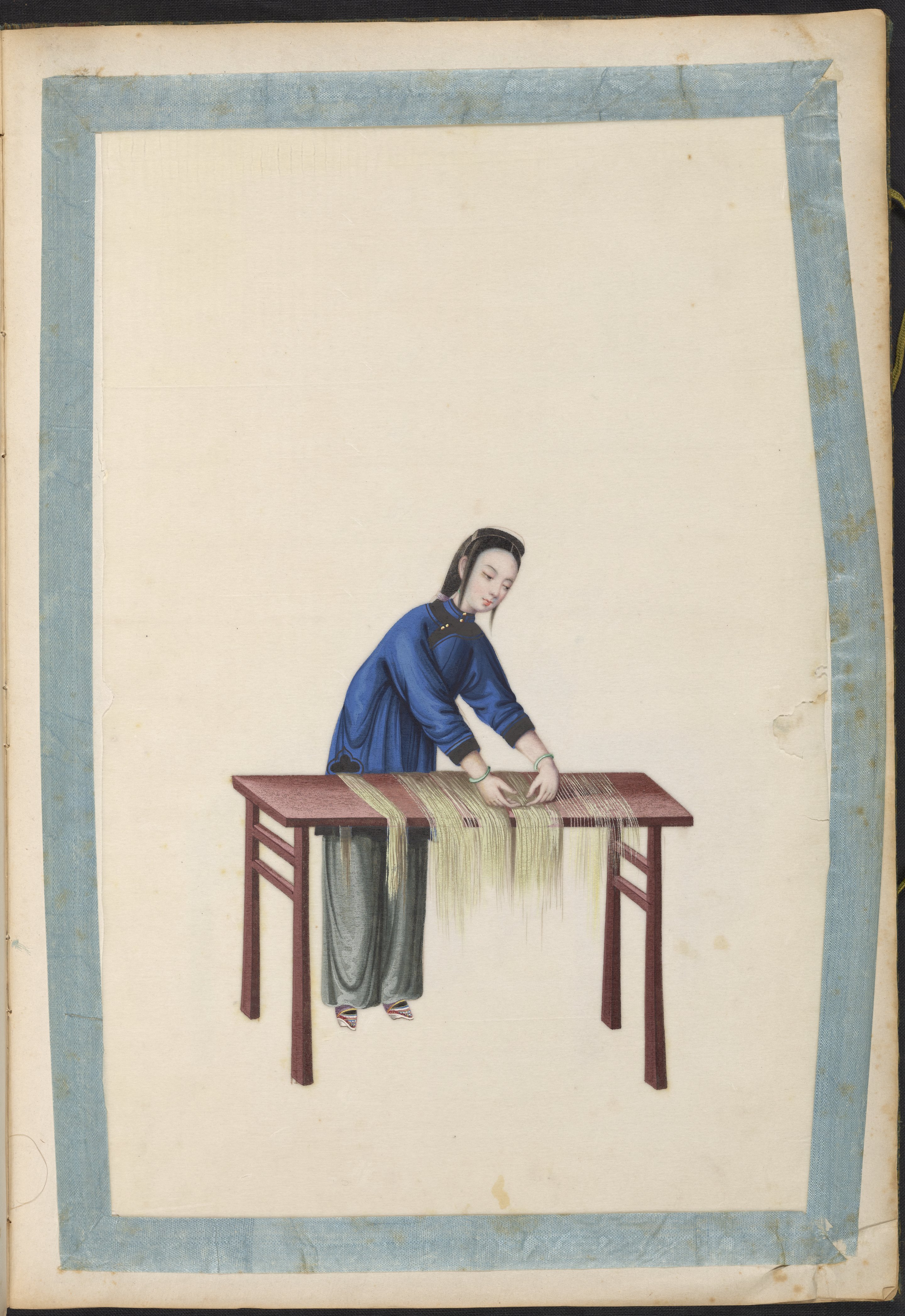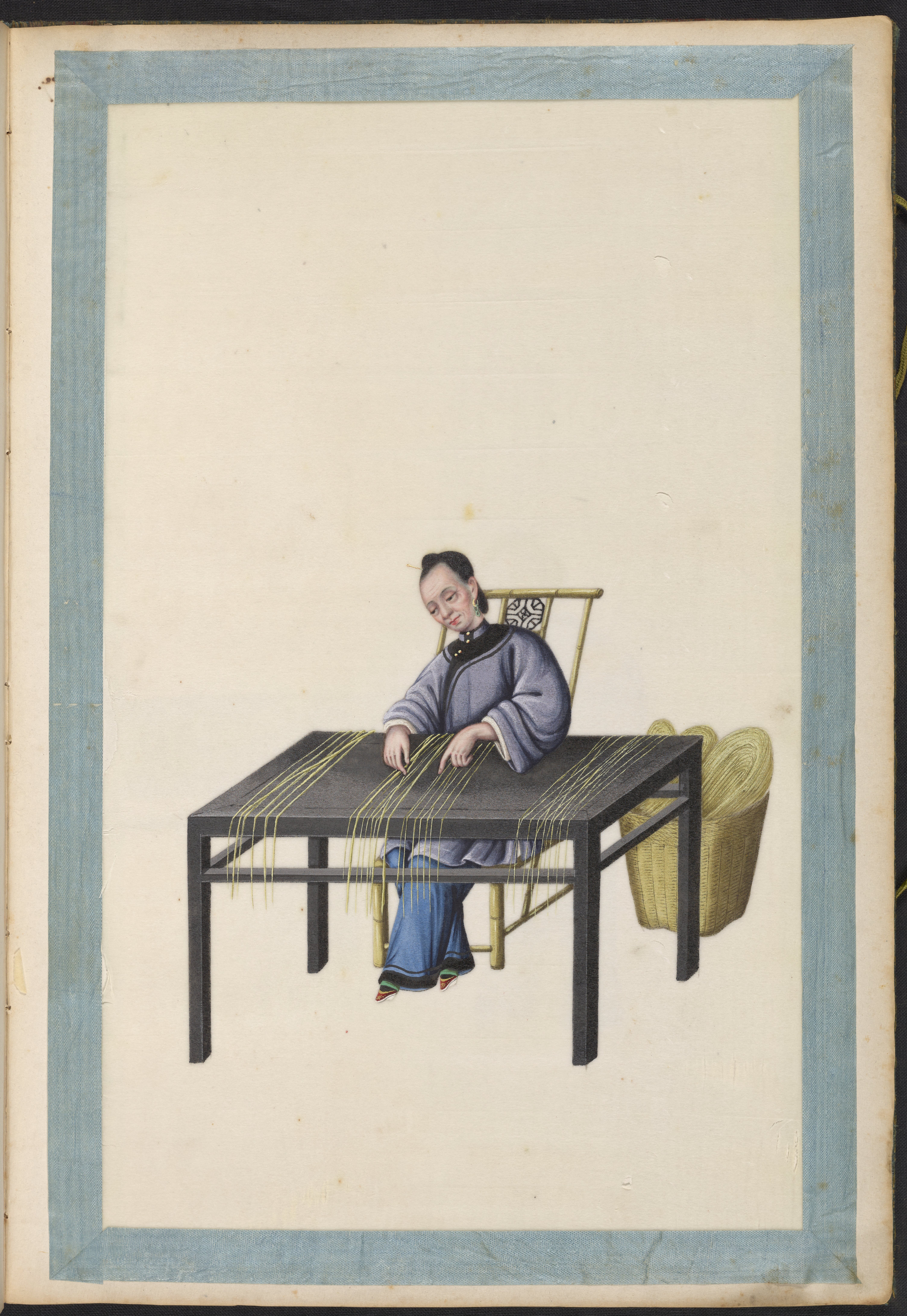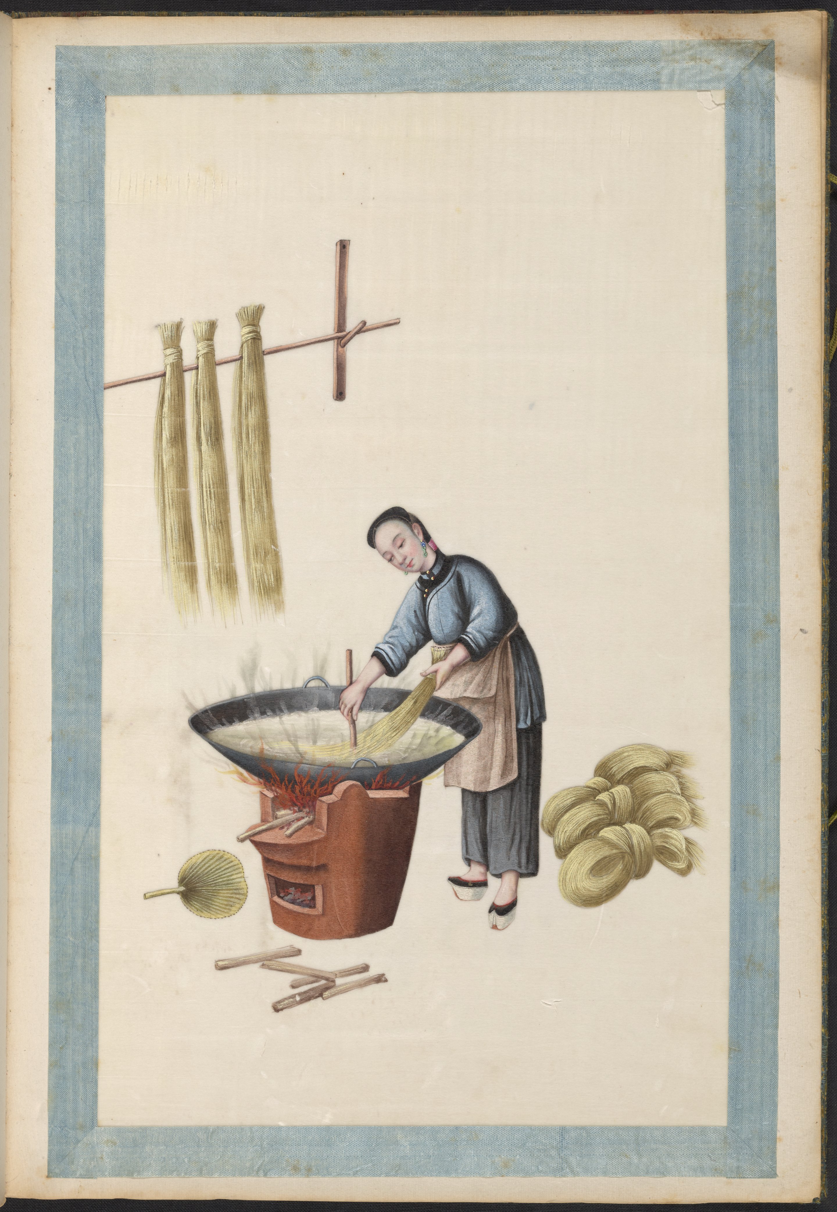 Small JPG1200 x 1745px — 296 KBLarge JPG2880 x 4188px — 1.6 MBFull-sized JPG5983 x 8701px — 6.5 MBOriginal fileTIFF — 5983 x 8701px — 149 MBVolume two of five brocade-bound sets of 60 Chinese watercolor paintings. The watercolors show, in chronological order, the process of producing Ramie cloth, a silk-like fabric, in China during the 1820s. The collection is accompanied by a transcription of hand-written text, describing the steps in Ramie cloth production. These works are part of a long lineage of works by Chinese artists that depict the various processes in the production of materials from China.