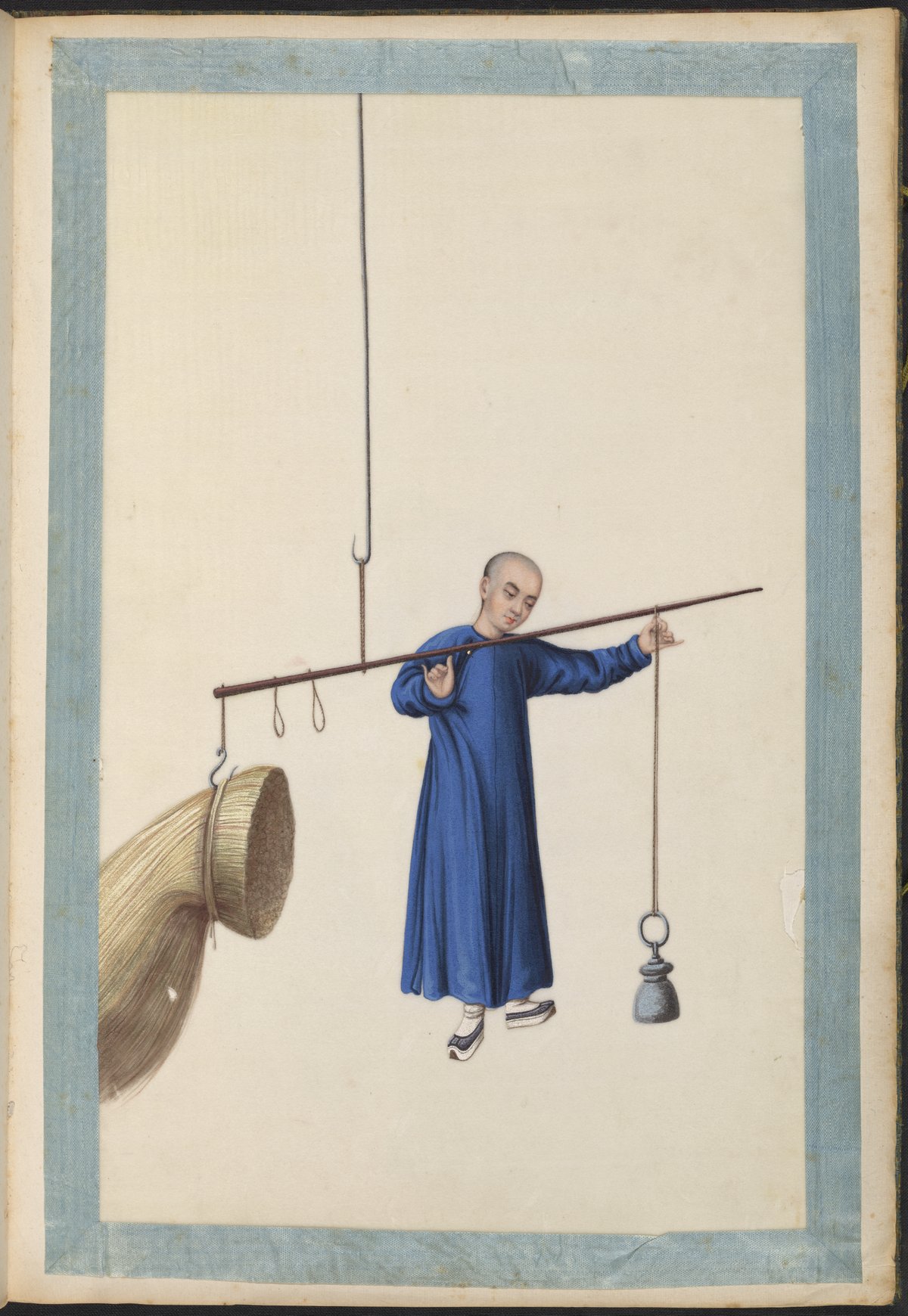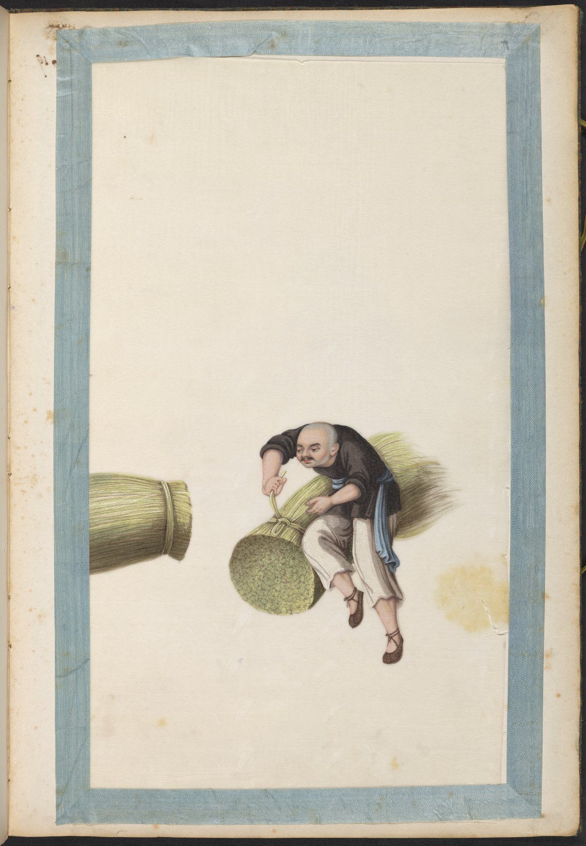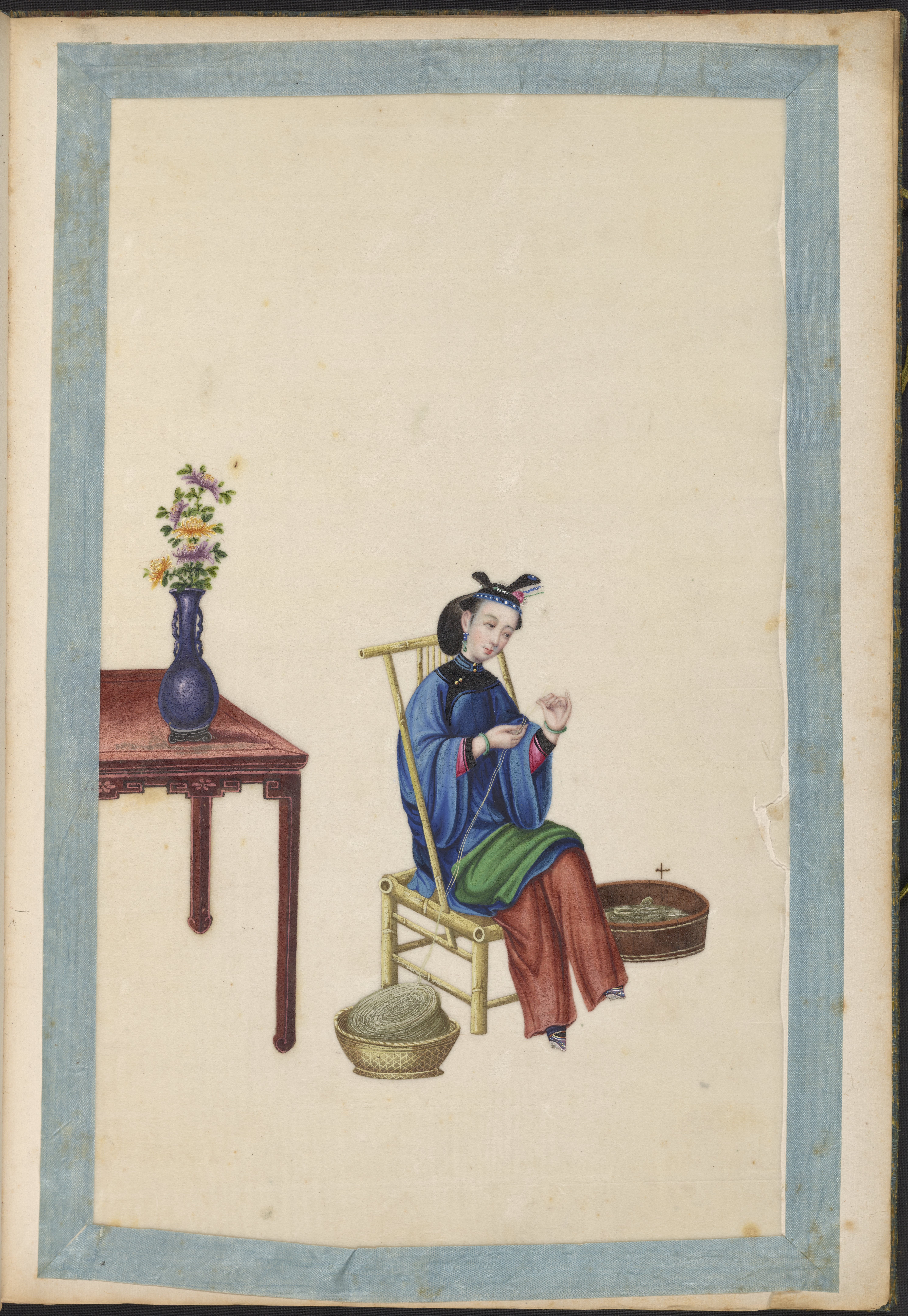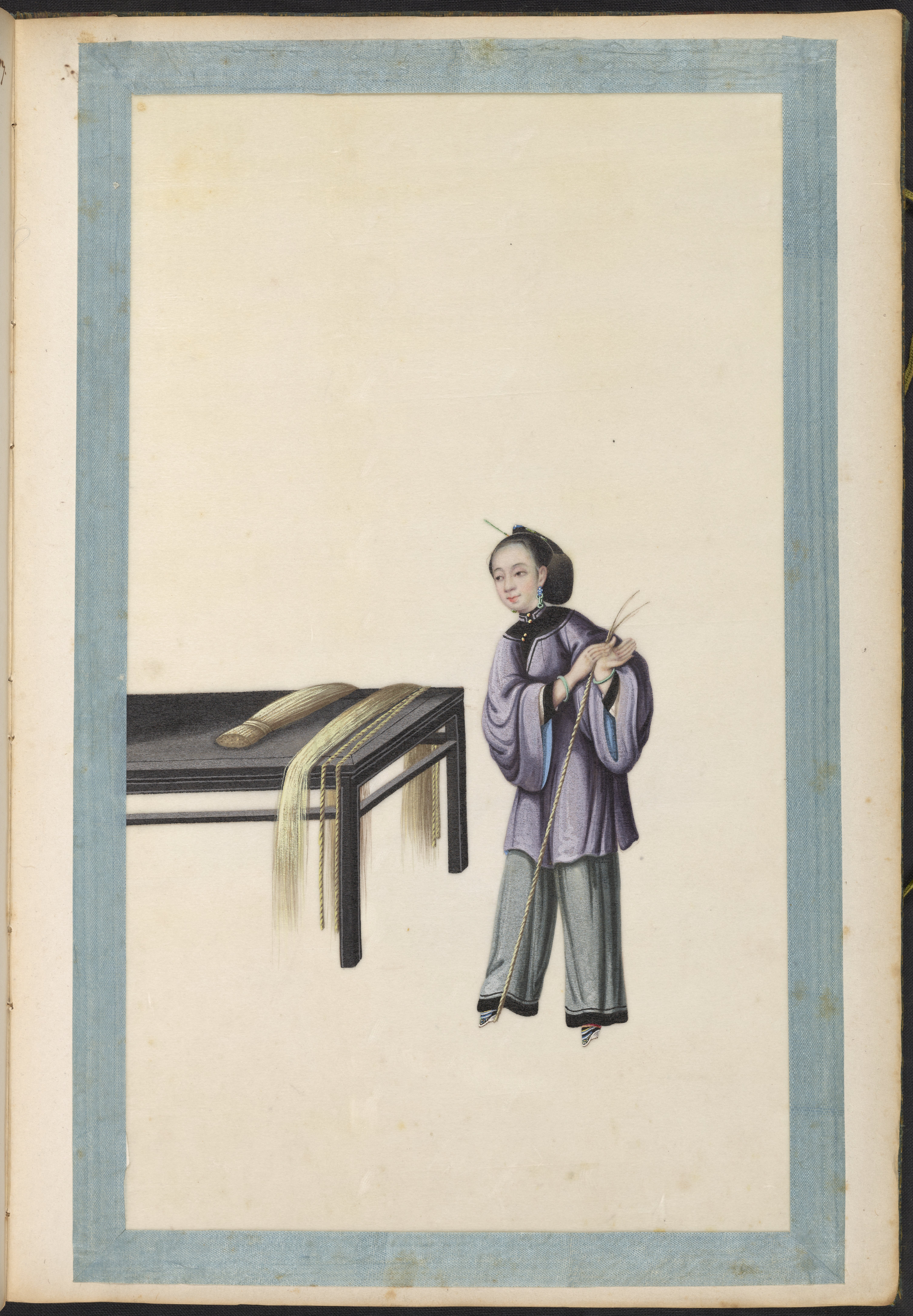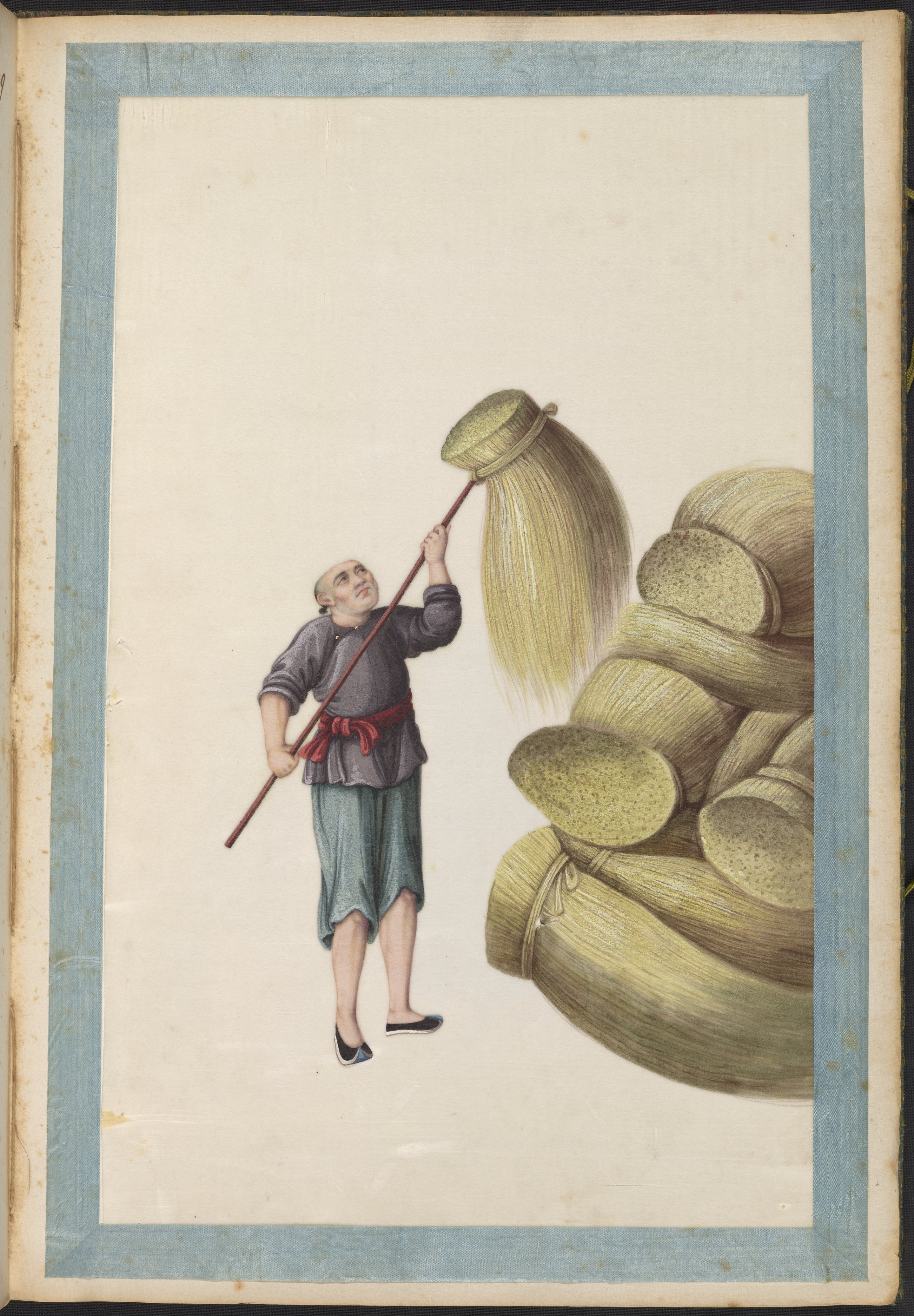 Small JPG1200 x 1745px — 296 KBLarge JPG2880 x 4188px — 1.6 MBFull-sized JPG5983 x 8701px — 6.5 MBOriginal fileTIFF — 5983 x 8701px — 149 MBVolume two of five brocade-bound sets of 60 Chinese watercolor paintings. The watercolors show, in chronological order, the process of producing Ramie cloth, a silk-like fabric, in China during the 1820s. The collection is accompanied by a transcription of hand-written text, describing the steps in Ramie cloth production. These works are part of a long lineage of works by Chinese artists that depict the various processes in the production of materials from China.