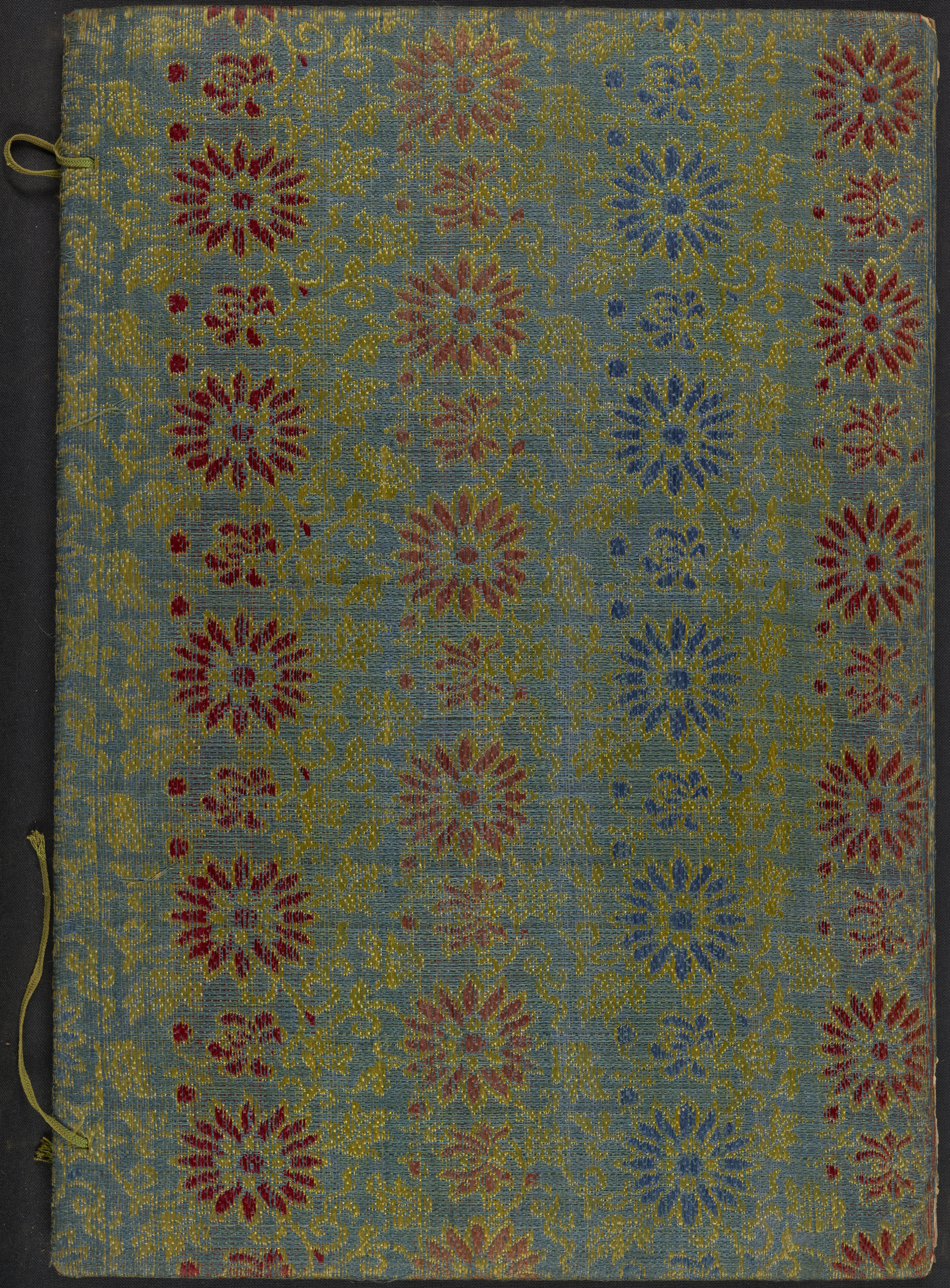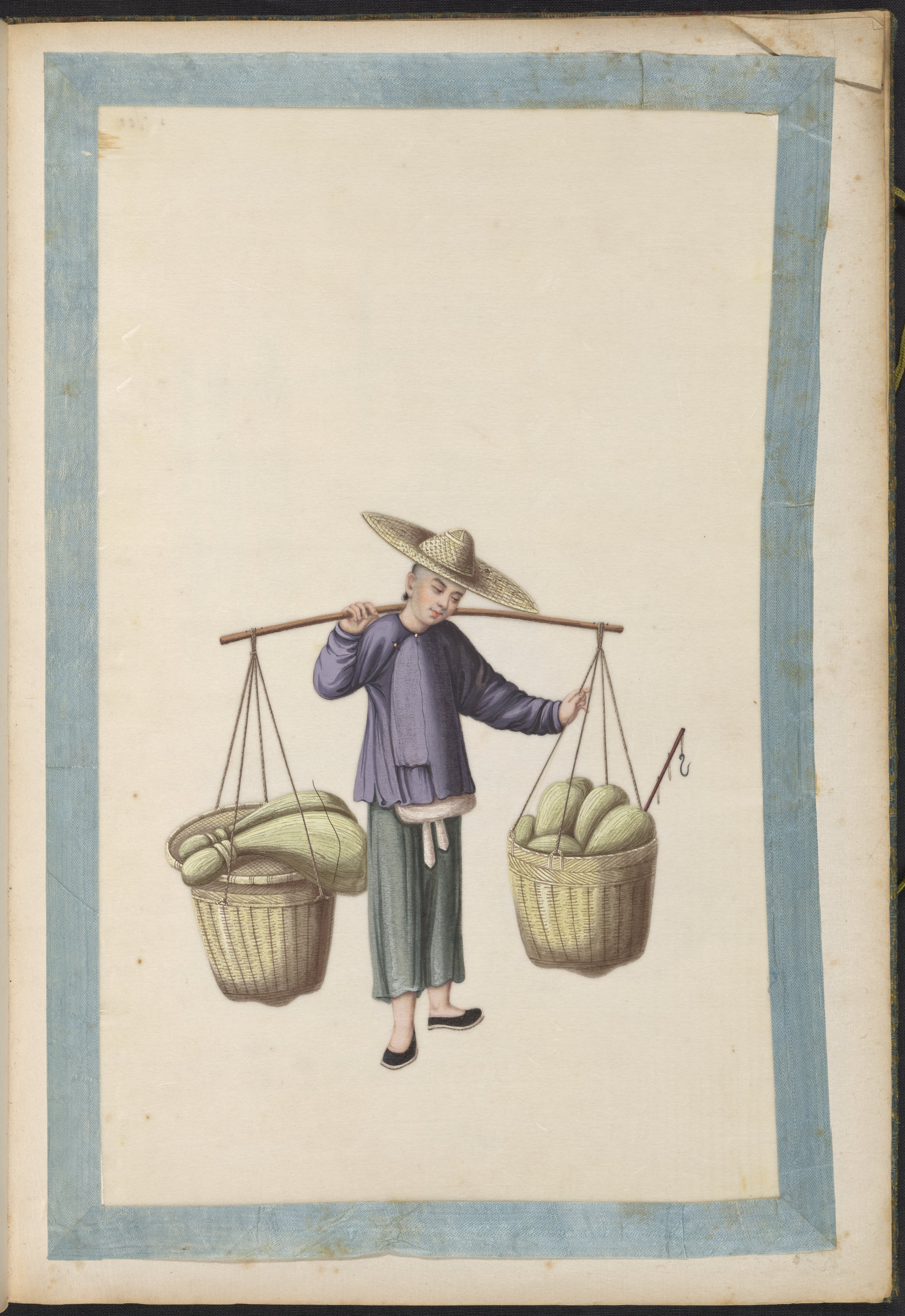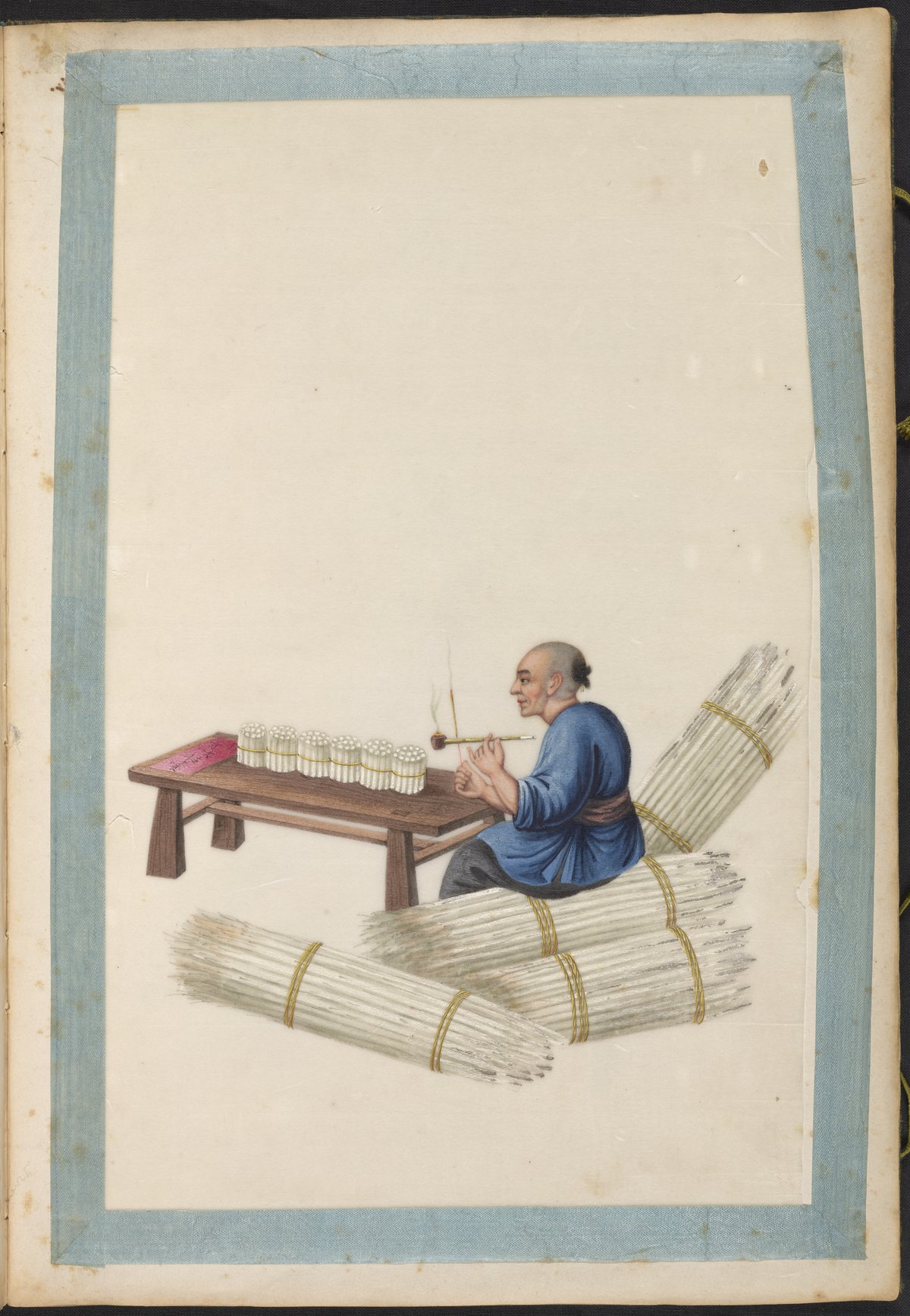 These elaborate paintings were made on pith paper supports, a paper-like product made from the pith of a small tree. Pith was a popular painting support of Chinese export paintings as it was a sumptuous but inexpensive form of locally made paper, an alternative to pricier imported European paper. The pith paper paintings are secured onto the album pages with thin, blue silk tapes.