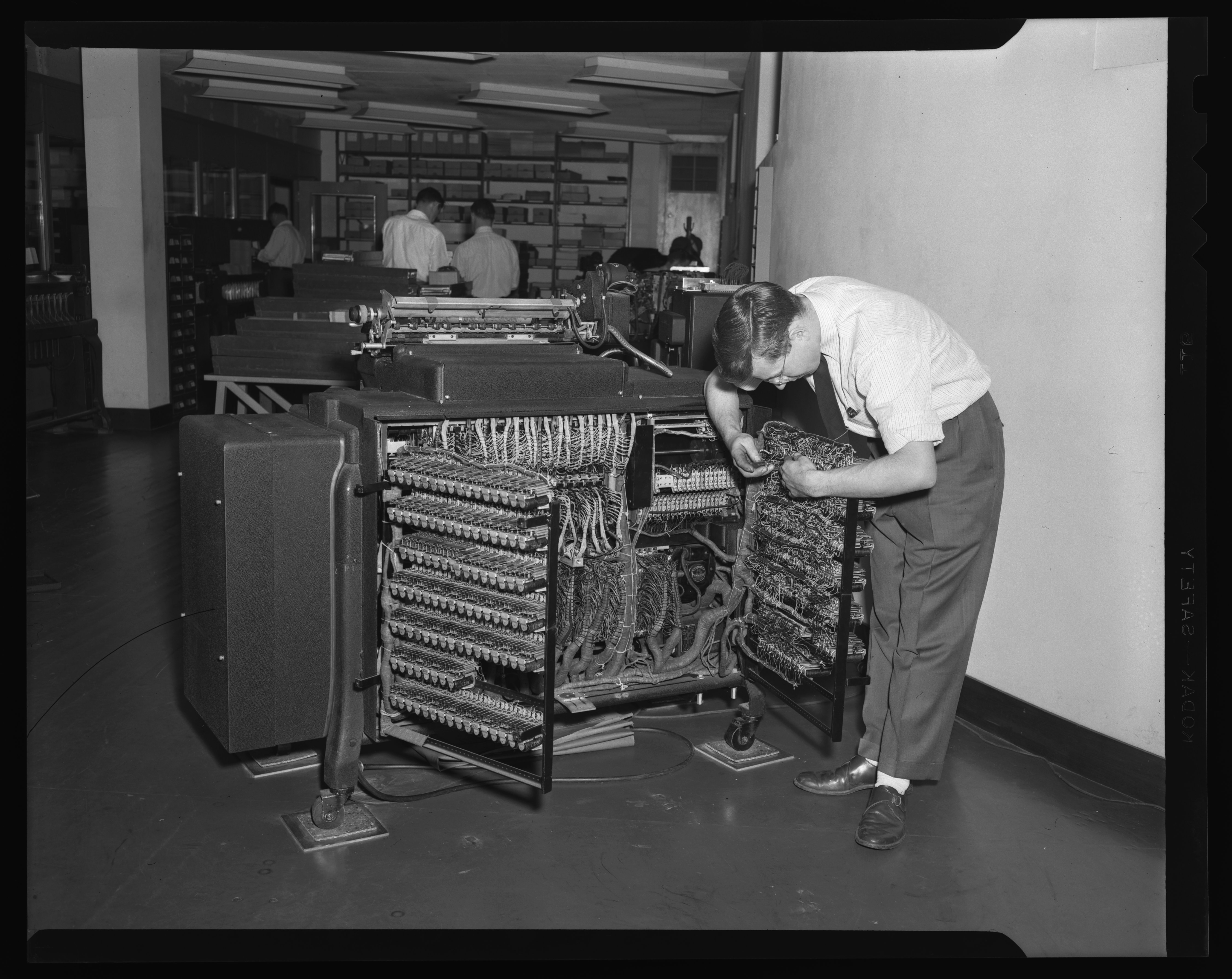 Dow Chemical Company. “Neil Grover Servicing Alphabetic Tabulator at Dow Tabulating Department,” December 16, 1947. Dow Chemical Company Historical Image Collection, Box 10, Folder Plants--Tabulating Department. Science History Institute. Philadelphia. https://digital.sciencehistory.org/works/p2676w57z.