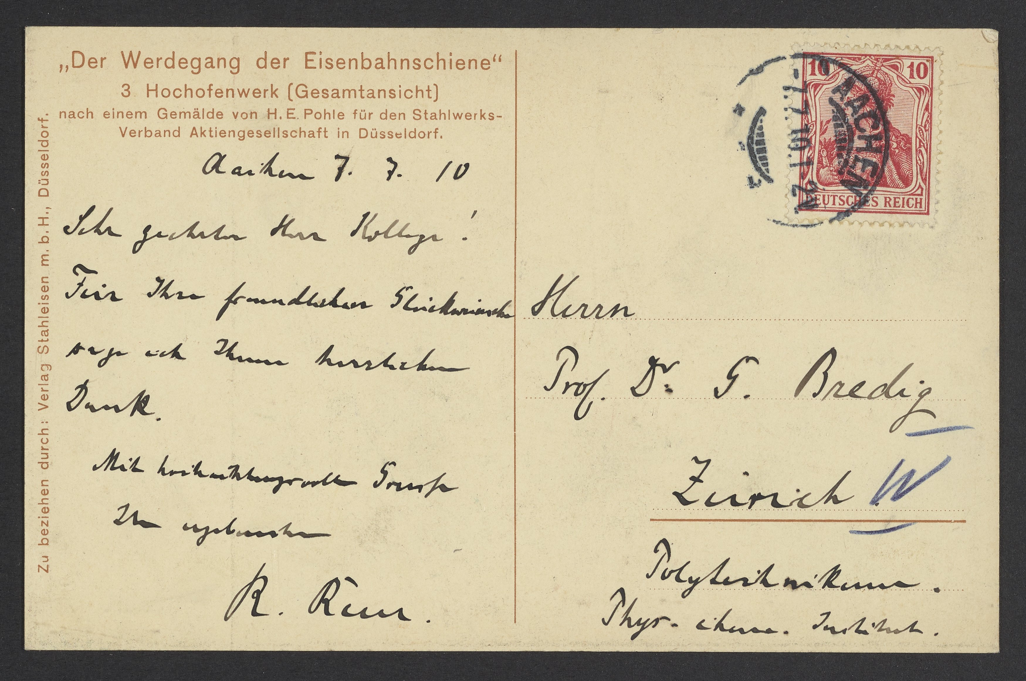 Pohle, H. E. “Postcard of Der Werdegang Der Eisenbahnschiene, 3. Hochofenwerk (Gesamtansicht),” July 7, 1910. Papers of Georg and Max Bredig, Box 22. Science History Institute. Philadelphia. https://digital.sciencehistory.org/works/p3cr4az.
