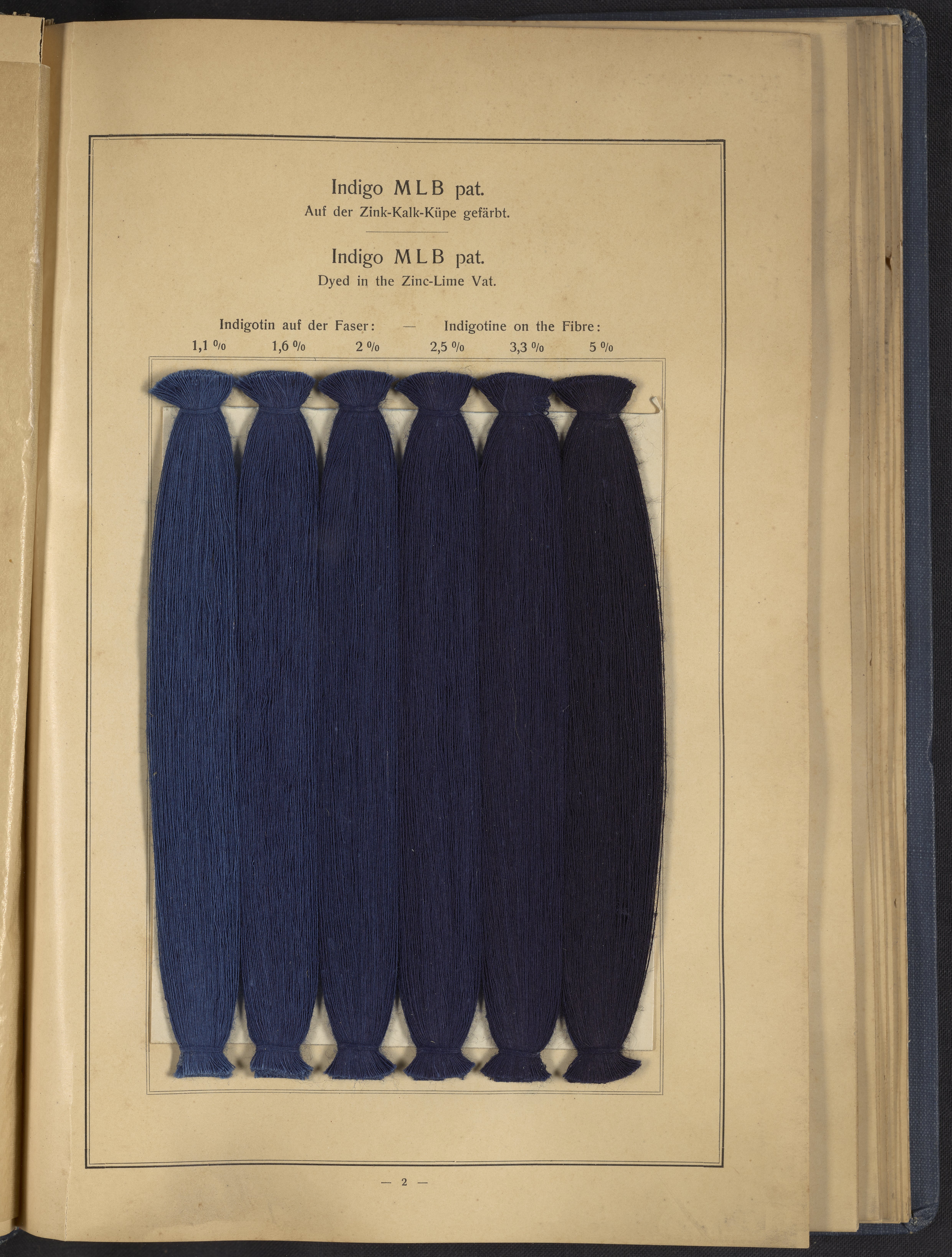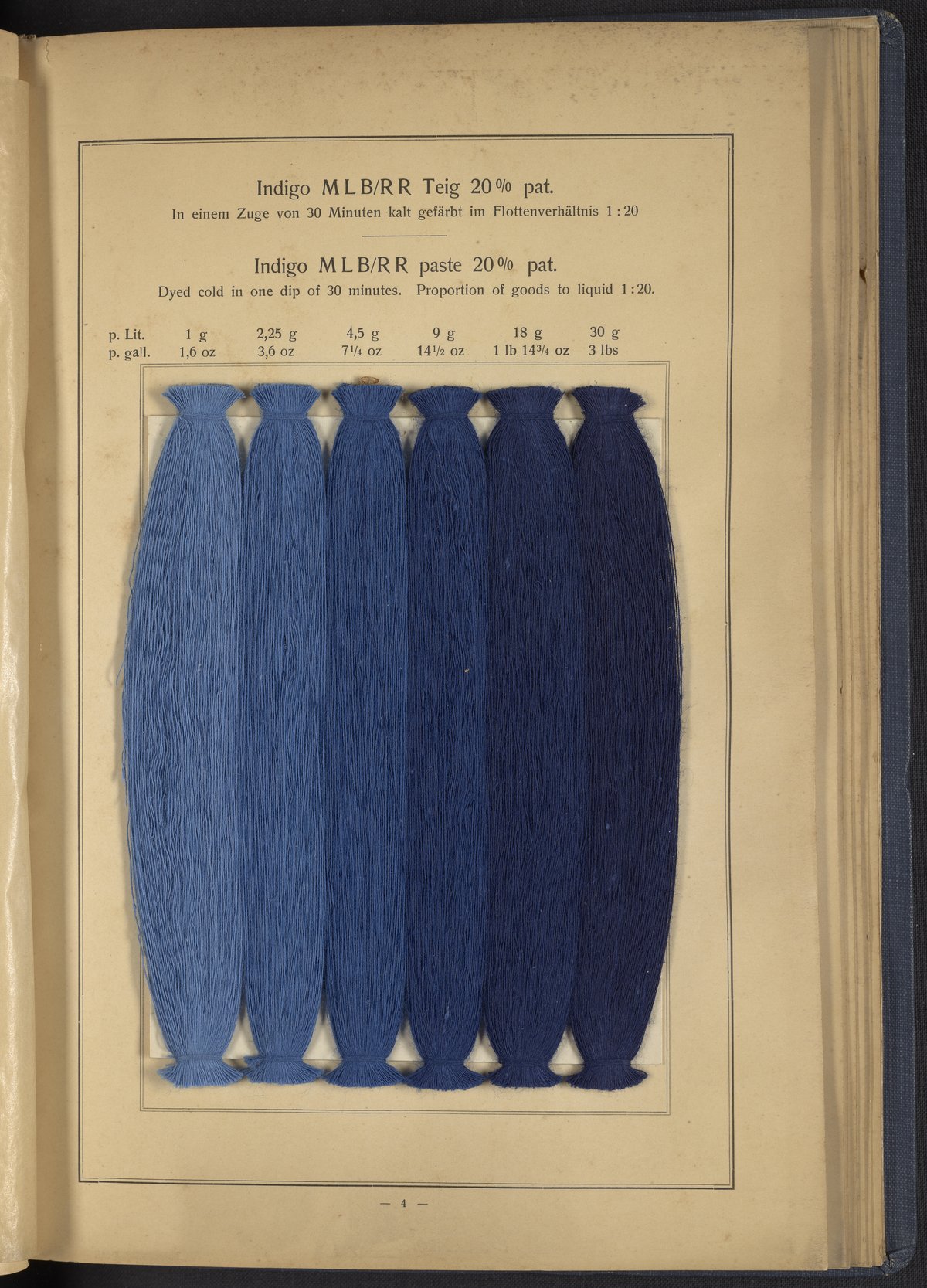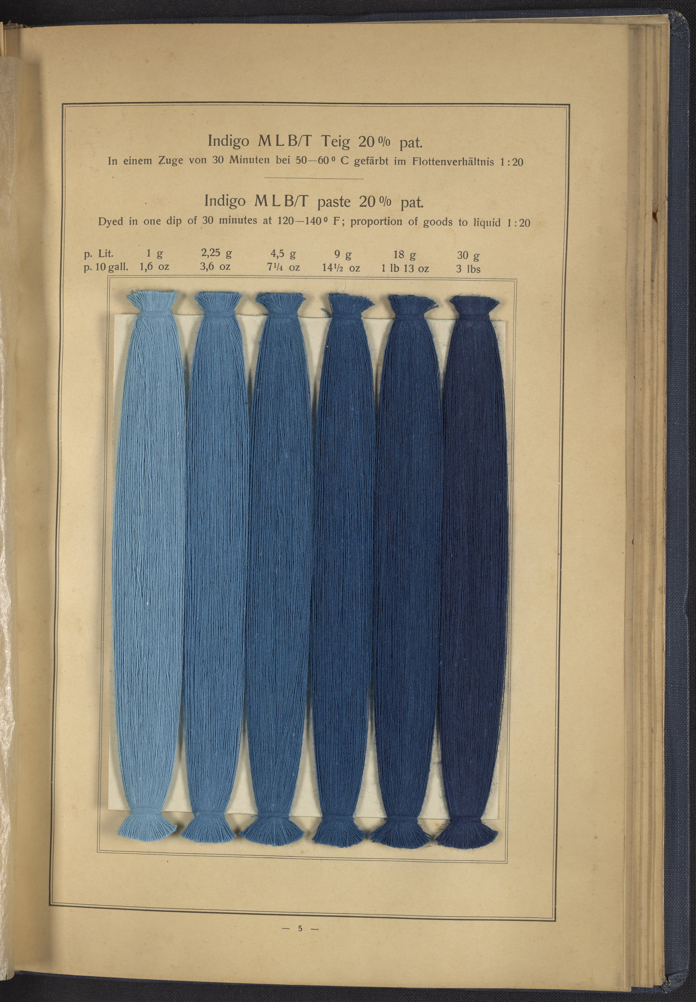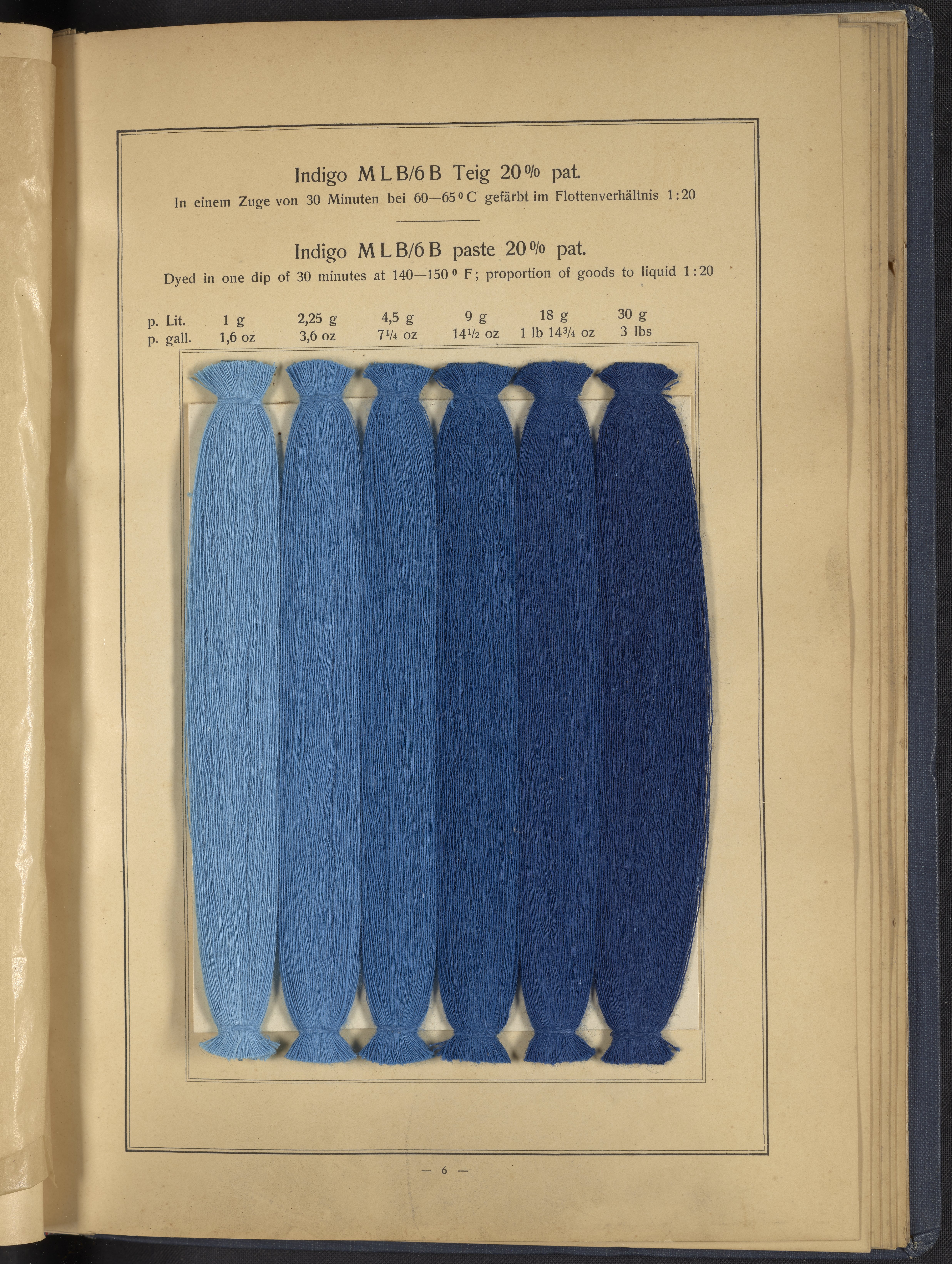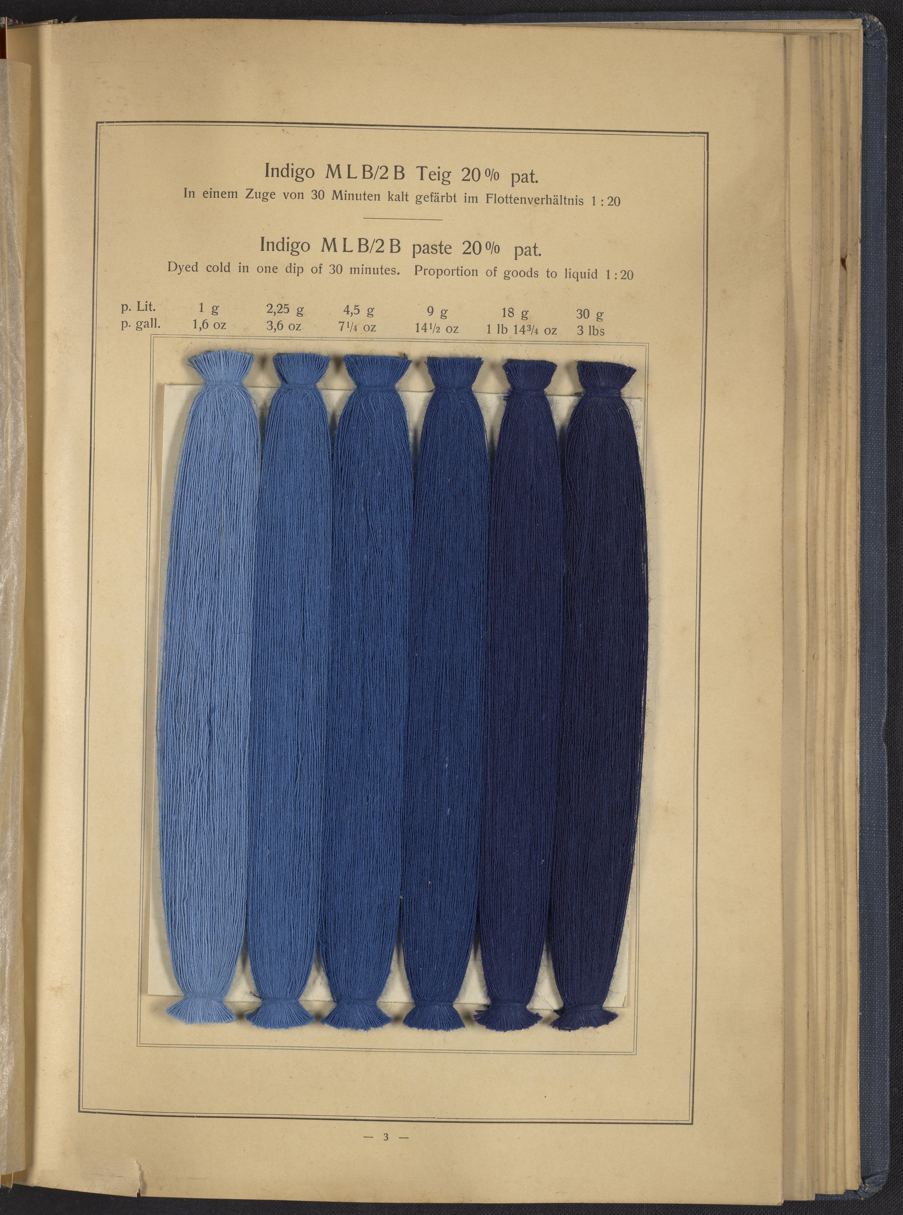 Small JPG1200 x 1634px — 431 KBLarge JPG2880 x 3920px — 2.7 MBFull-sized JPG4863 x 6619px — 7.0 MBOriginal fileTIFF — 4863 x 6619px — 92.2 MBThis sample book begins with a selection of recipes for the preparation of dye vats. Each recipe lists the solvents and solutes necessary to mix large-volume solutions of indigo textile dye using Indigo M.L.B. brand powdered dye, a synthetic indigo created using the "Pfleger indigo process," the first commercial process of indigo dye production. The recipes are followed by a series of protocols for indigo "resists" or the media used to prevent dye from penetrating the textile. Resist-dyeing is a traditional method used to create patterned designs on textiles. Substances are used to "resist" or prevent the dye from reaching all the cloth, thereby creating a pattern. Finally, the work contains 16 plates of mounted yarn and fabric samples demonstrating the outcomes of the preceding recipes.