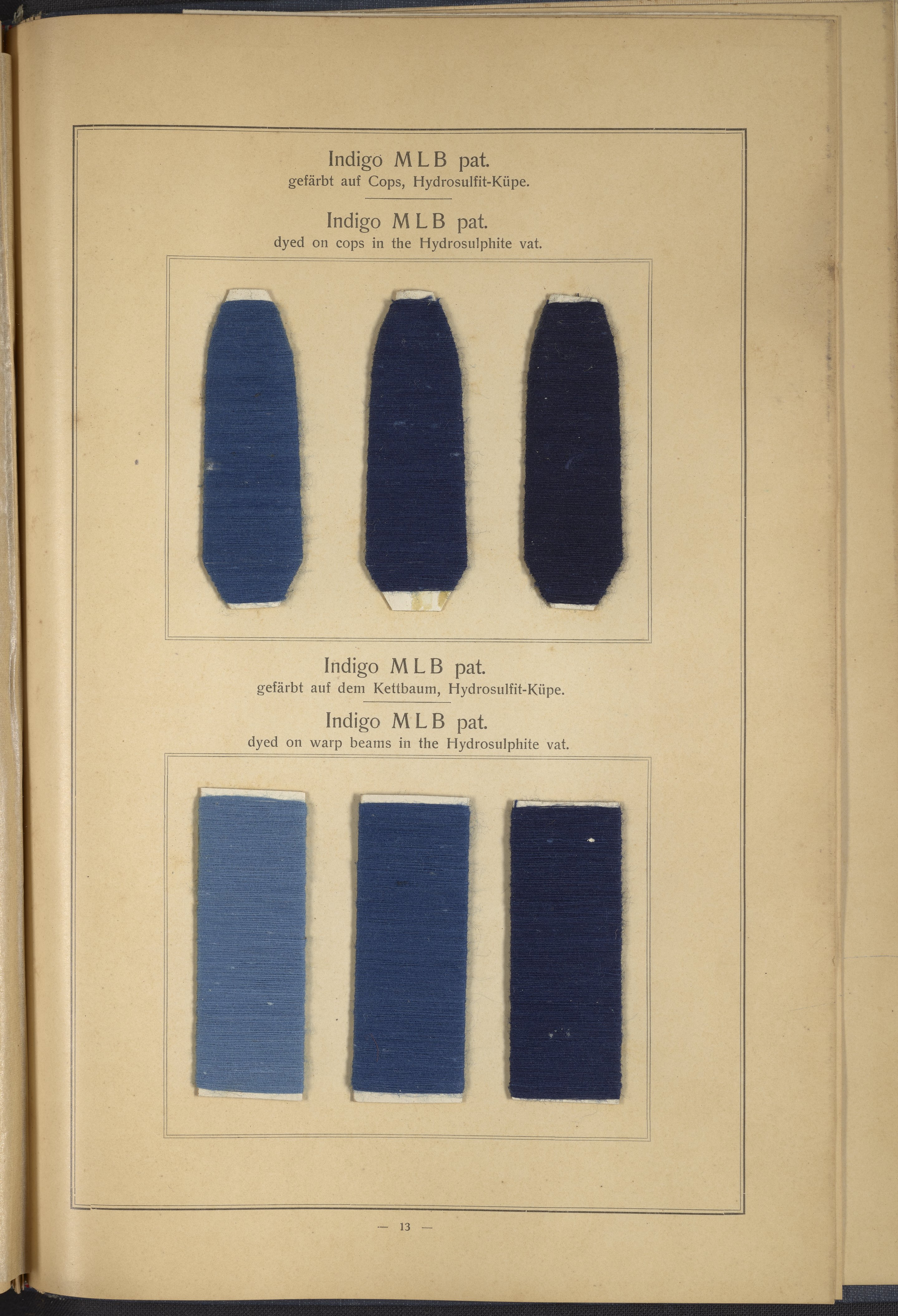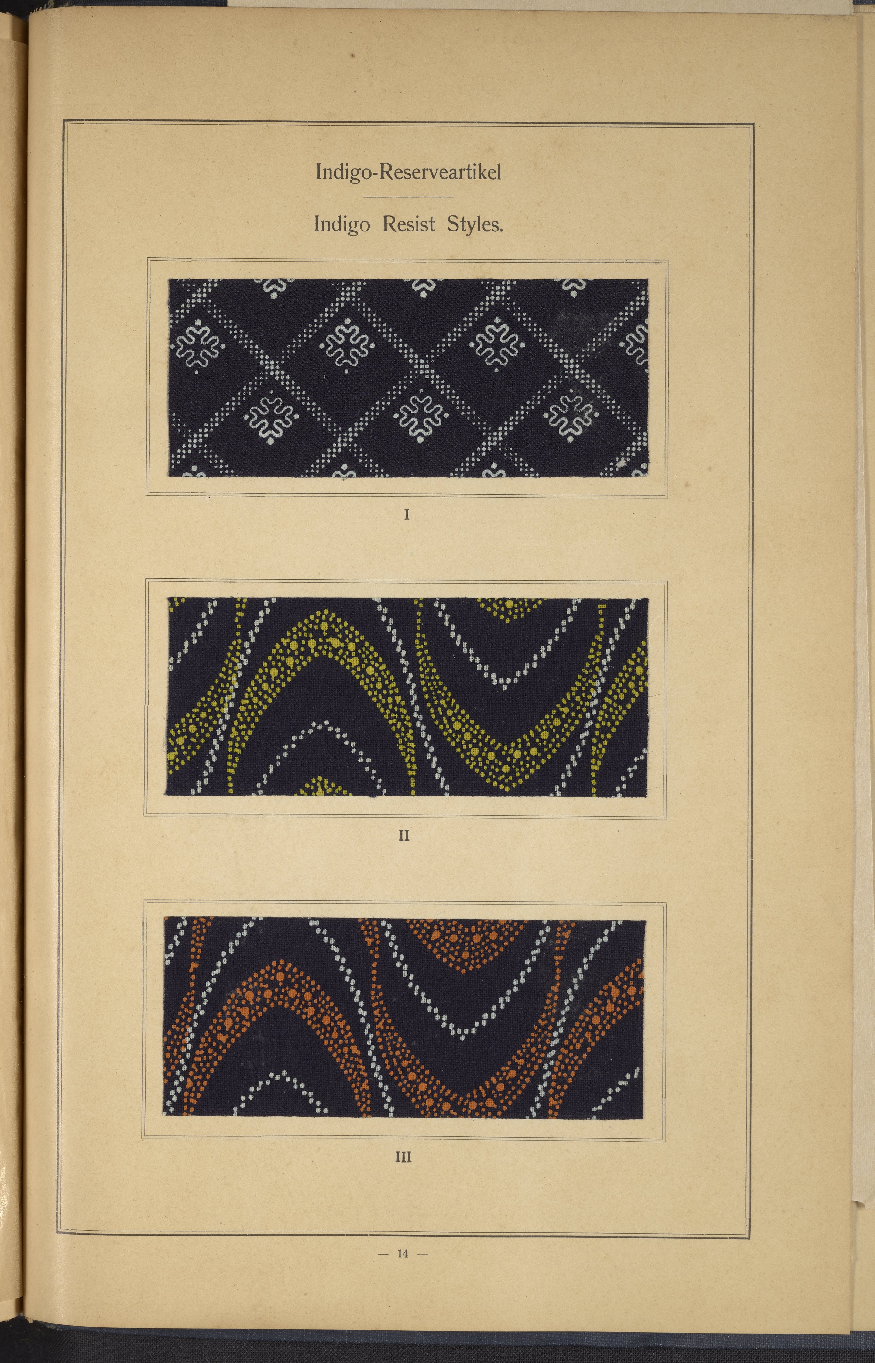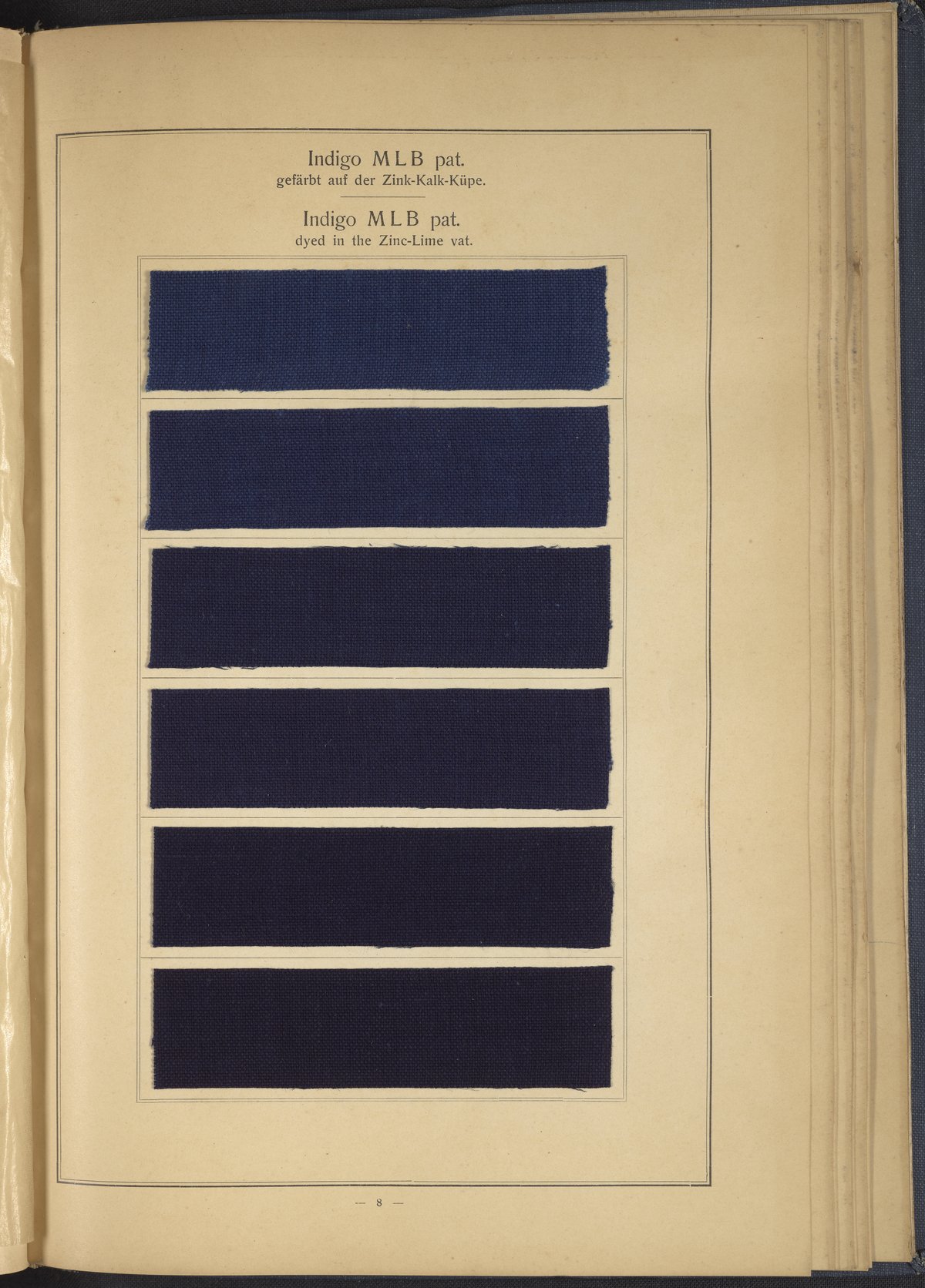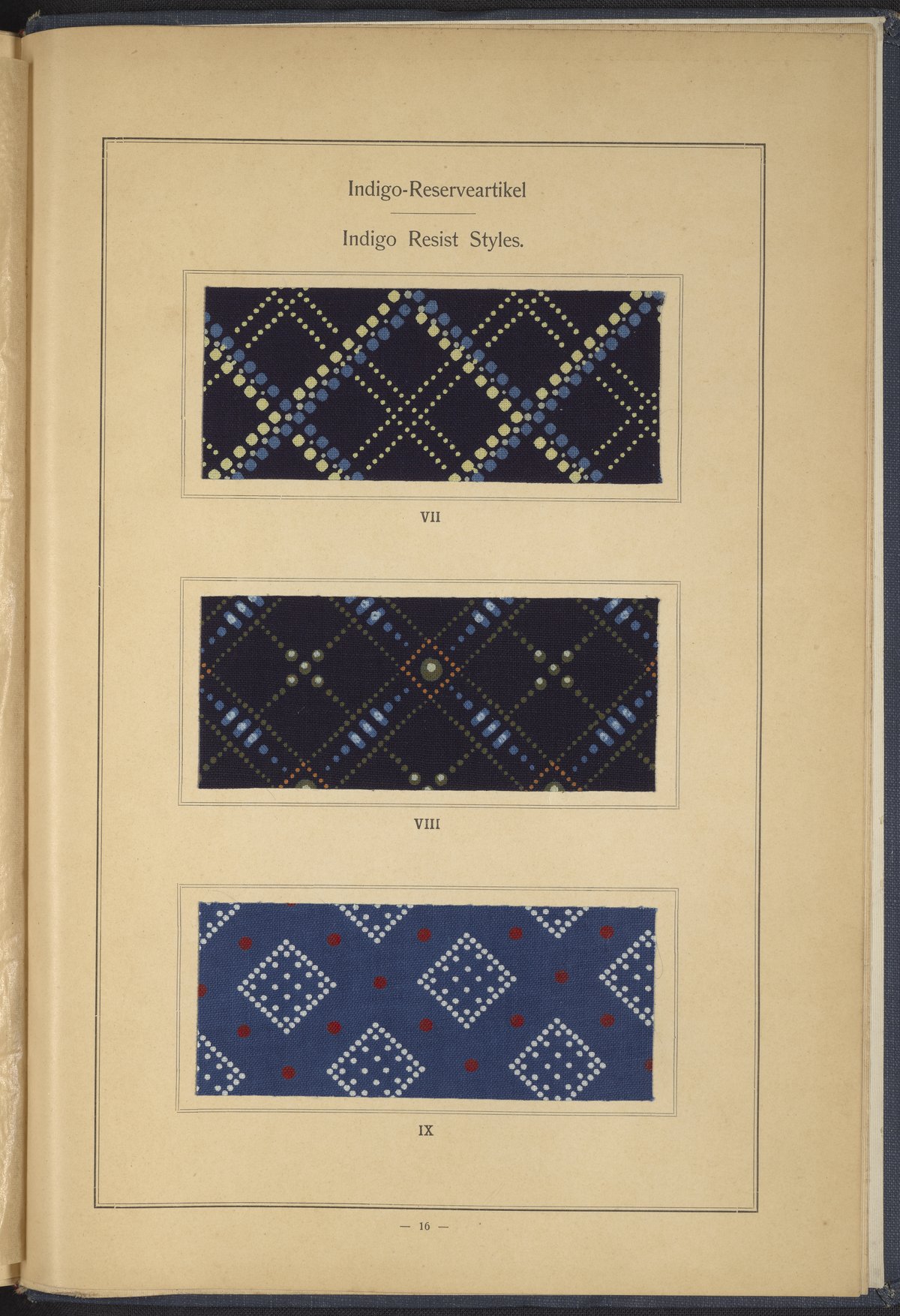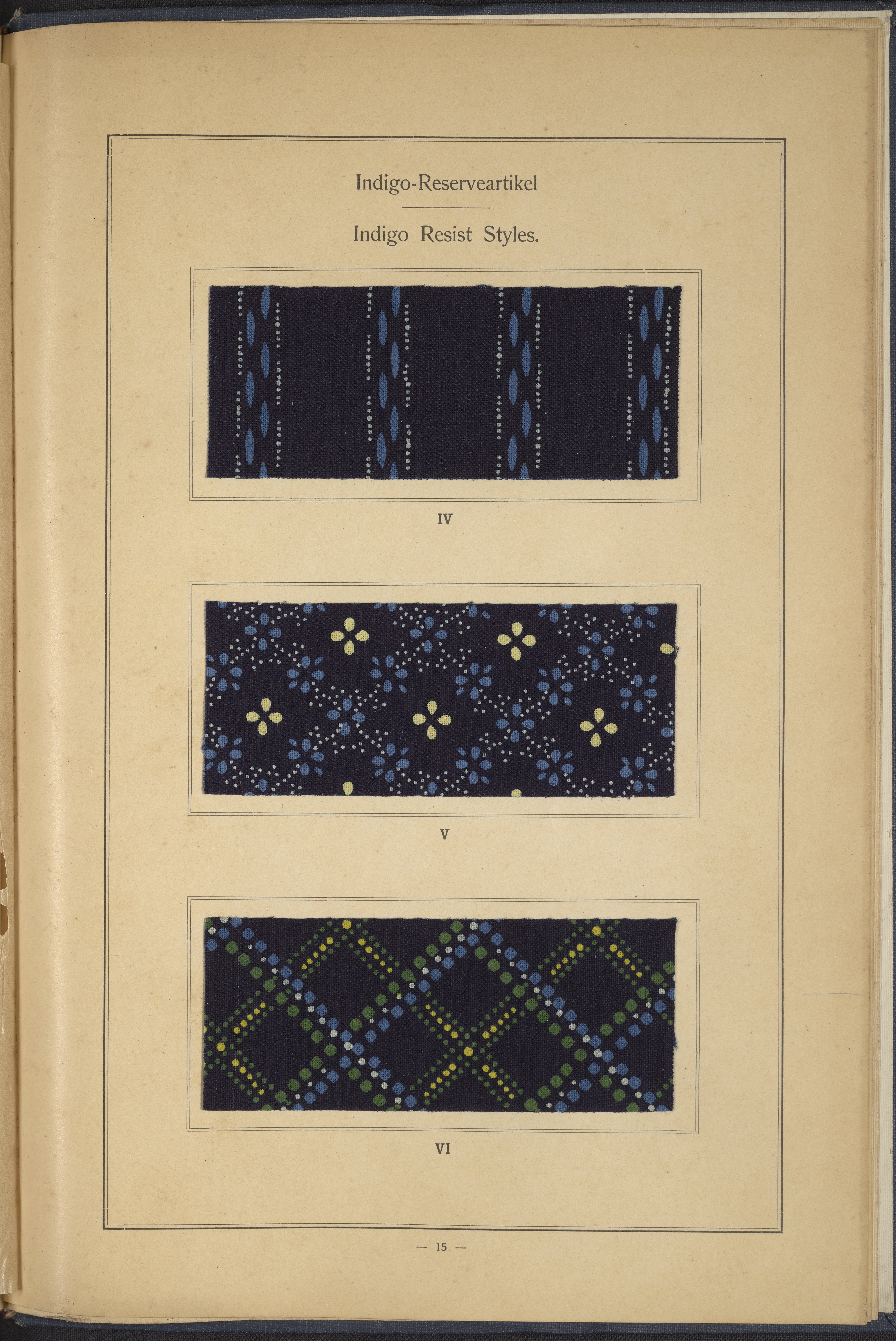 Small JPG1200 x 1634px — 431 KBLarge JPG2880 x 3920px — 2.7 MBFull-sized JPG4863 x 6619px — 7.0 MBOriginal fileTIFF — 4863 x 6619px — 92.2 MBThis sample book begins with a selection of recipes for the preparation of dye vats. Each recipe lists the solvents and solutes necessary to mix large-volume solutions of indigo textile dye using Indigo M.L.B. brand powdered dye, a synthetic indigo created using the "Pfleger indigo process," the first commercial process of indigo dye production. The recipes are followed by a series of protocols for indigo "resists" or the media used to prevent dye from penetrating the textile. Resist-dyeing is a traditional method used to create patterned designs on textiles. Substances are used to "resist" or prevent the dye from reaching all the cloth, thereby creating a pattern. Finally, the work contains 16 plates of mounted yarn and fabric samples demonstrating the outcomes of the preceding recipes.