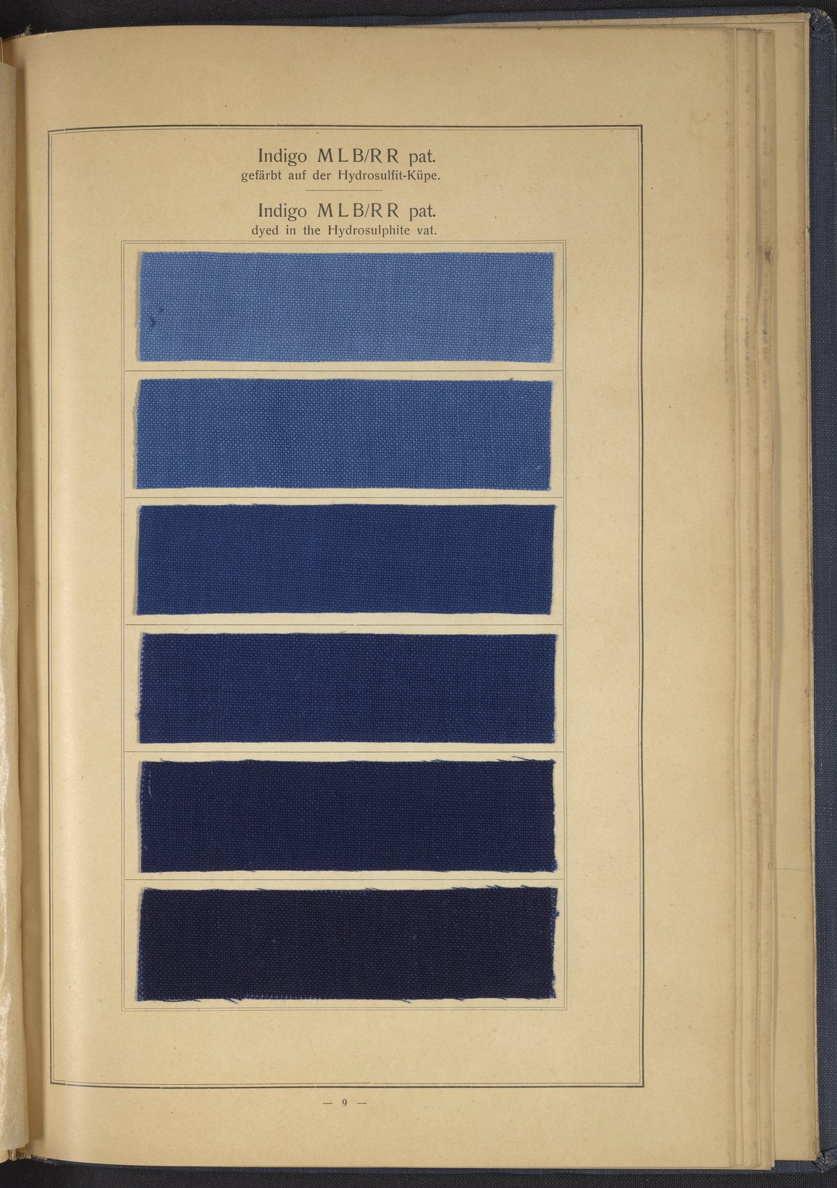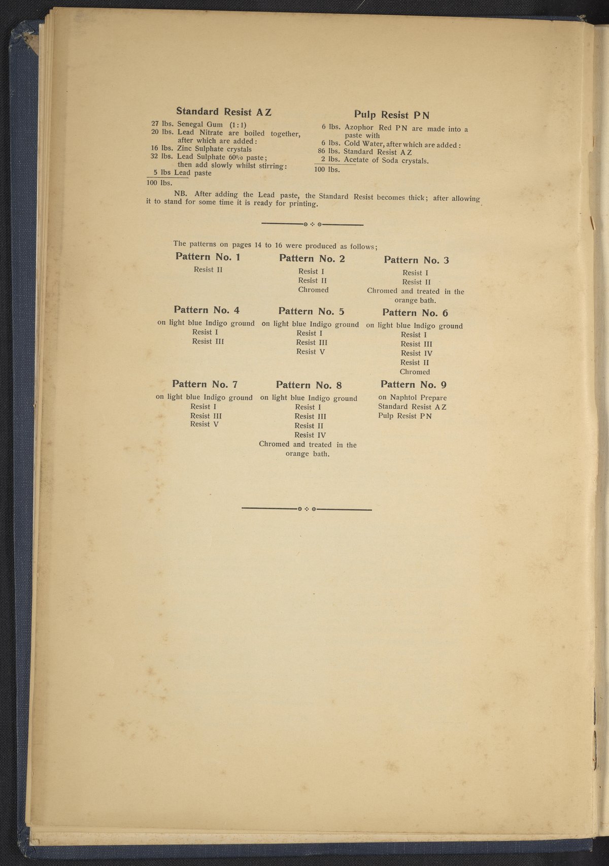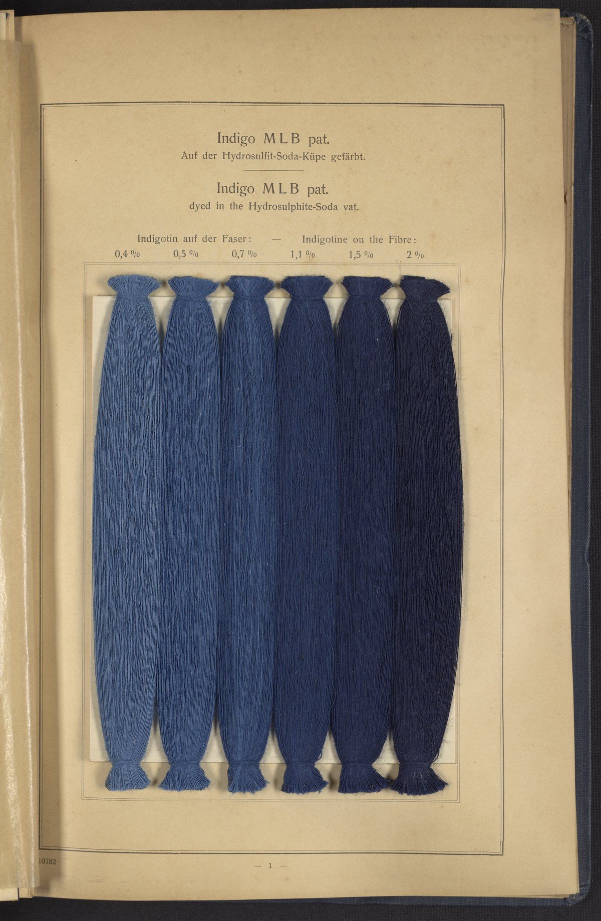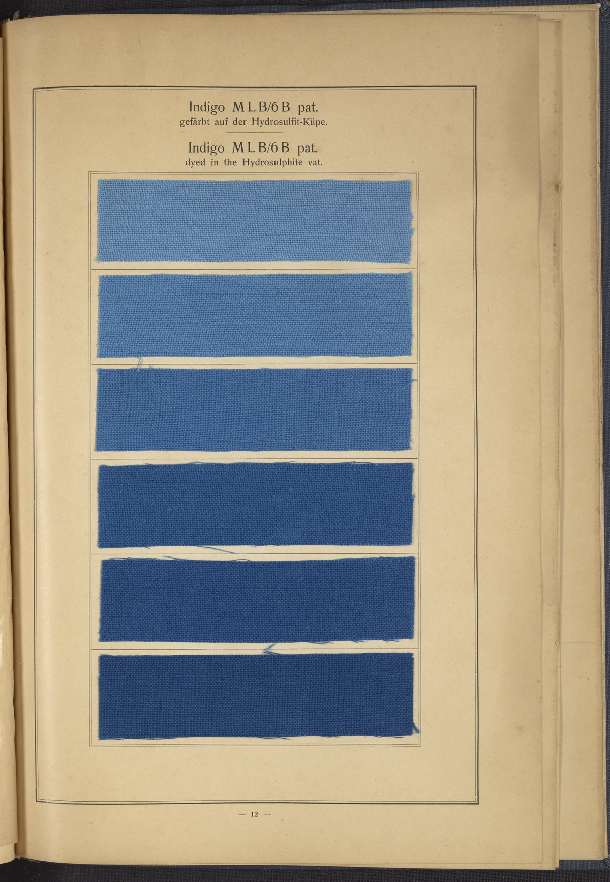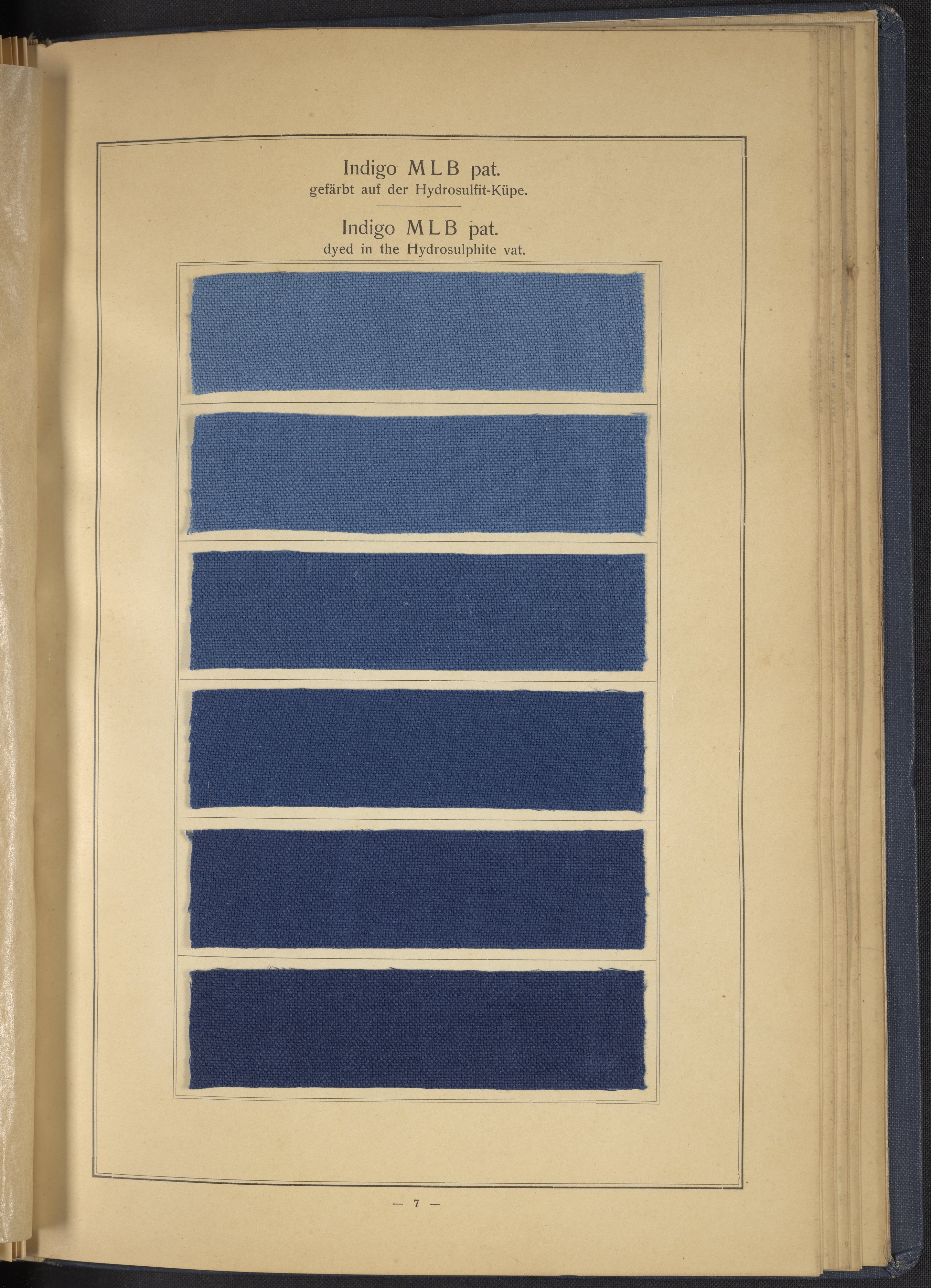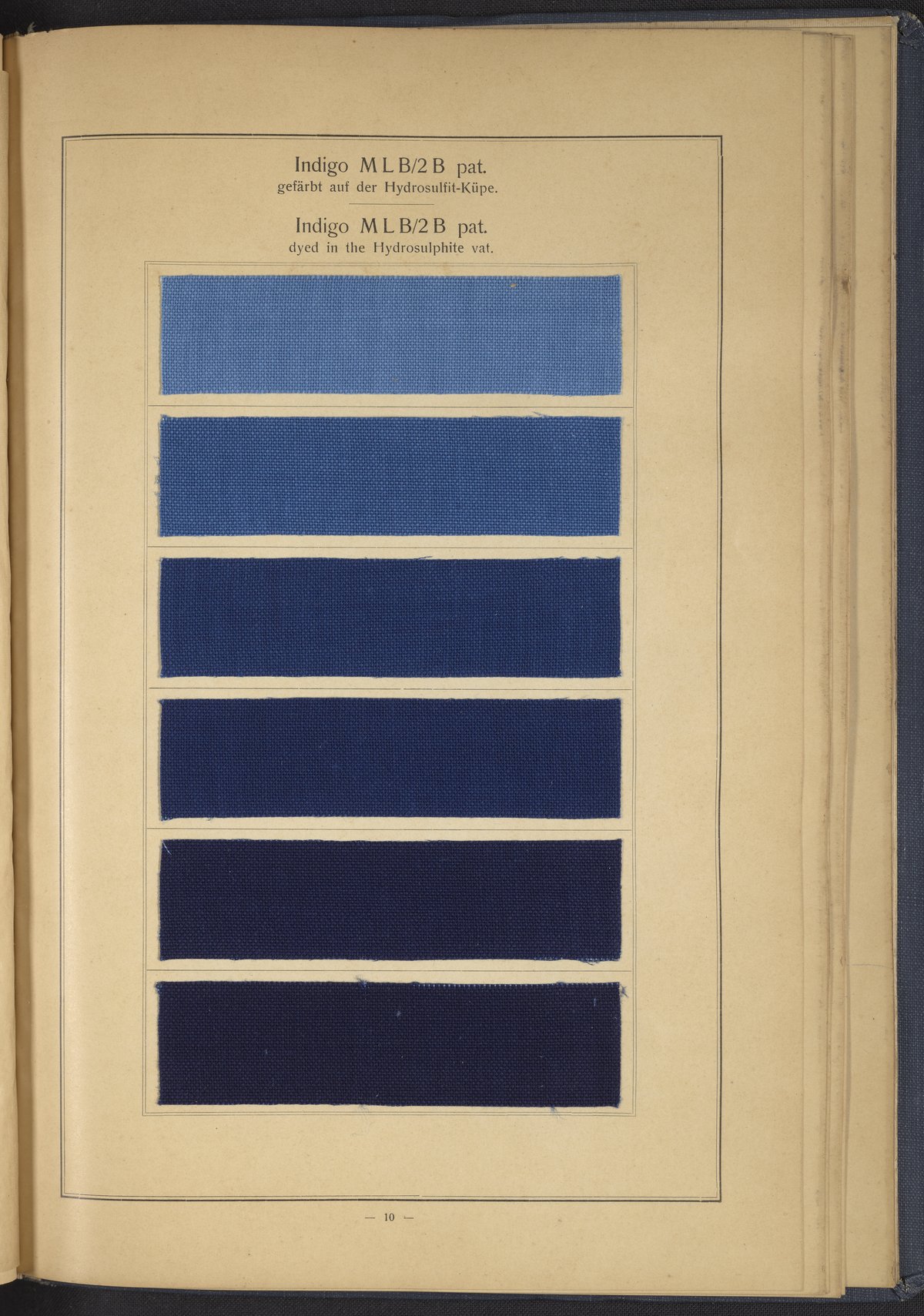 Small JPG1200 x 1634px — 431 KBLarge JPG2880 x 3920px — 2.7 MBFull-sized JPG4863 x 6619px — 7.0 MBOriginal fileTIFF — 4863 x 6619px — 92.2 MBThis sample book begins with a selection of recipes for the preparation of dye vats. Each recipe lists the solvents and solutes necessary to mix large-volume solutions of indigo textile dye using Indigo M.L.B. brand powdered dye, a synthetic indigo created using the "Pfleger indigo process," the first commercial process of indigo dye production. The recipes are followed by a series of protocols for indigo "resists" or the media used to prevent dye from penetrating the textile. Resist-dyeing is a traditional method used to create patterned designs on textiles. Substances are used to "resist" or prevent the dye from reaching all the cloth, thereby creating a pattern. Finally, the work contains 16 plates of mounted yarn and fabric samples demonstrating the outcomes of the preceding recipes.