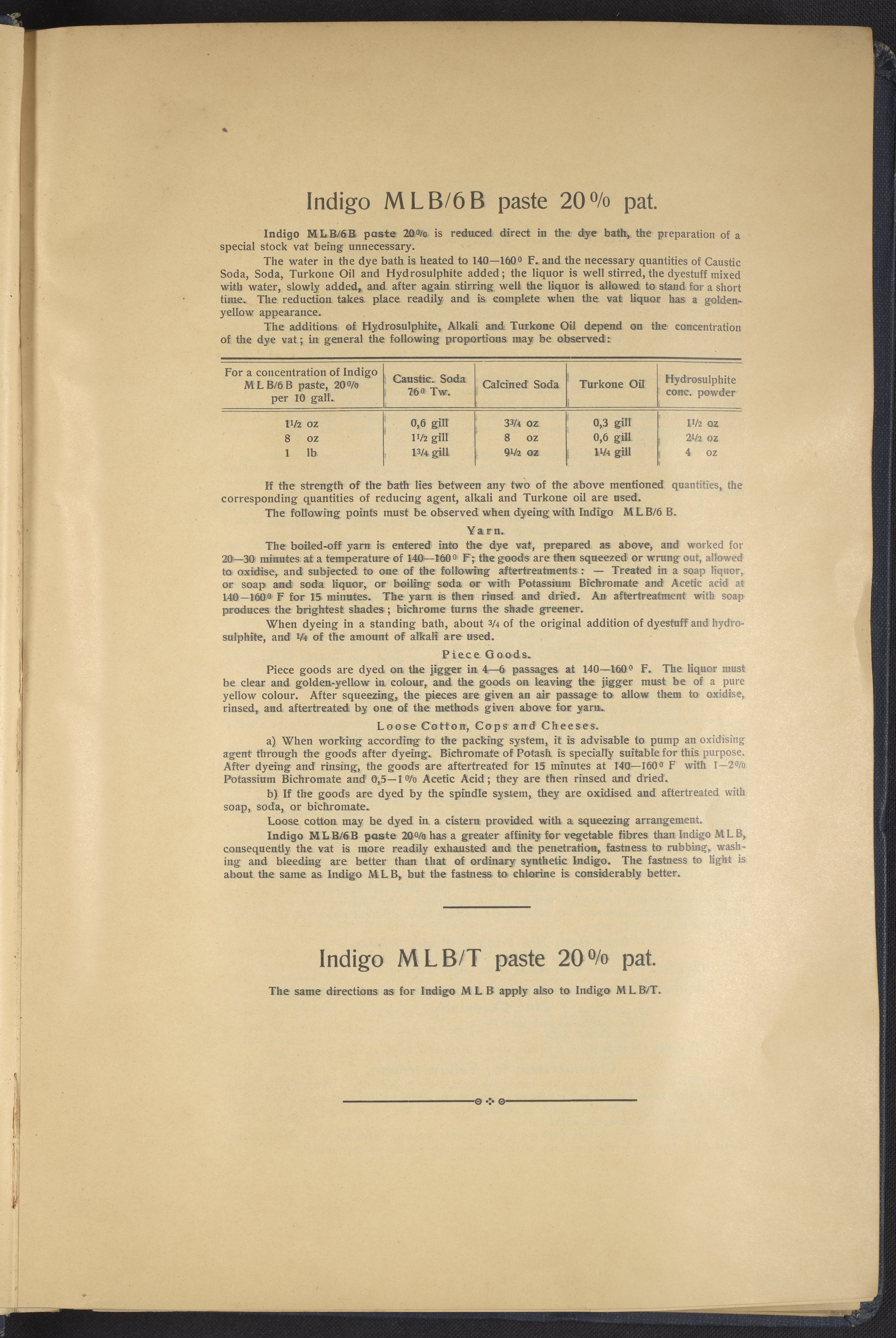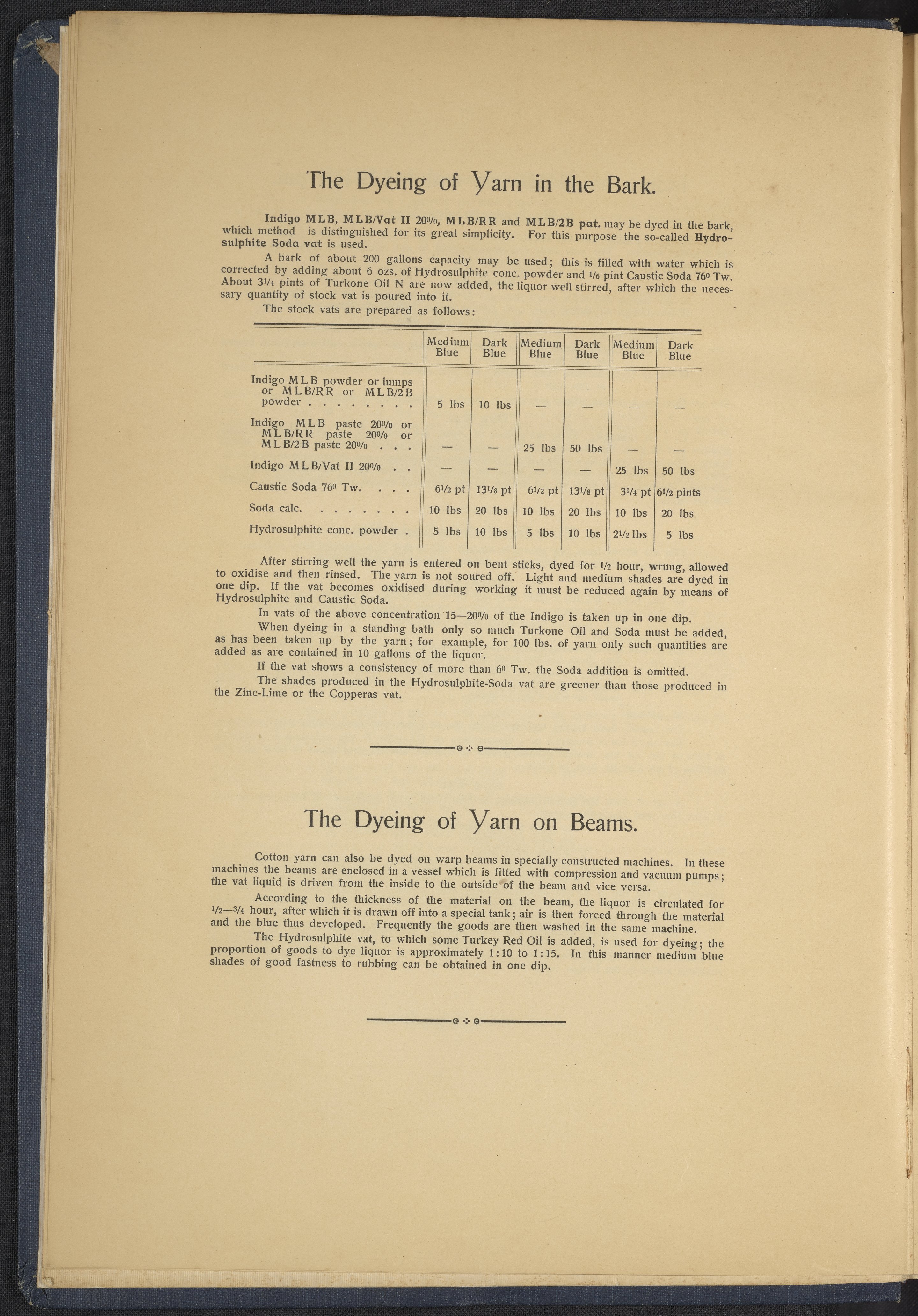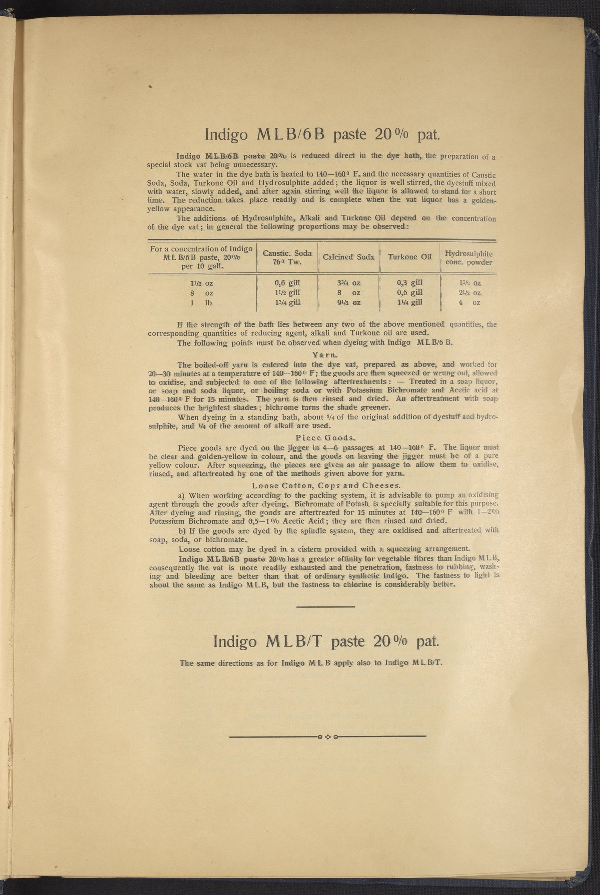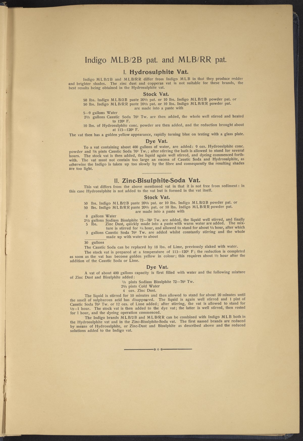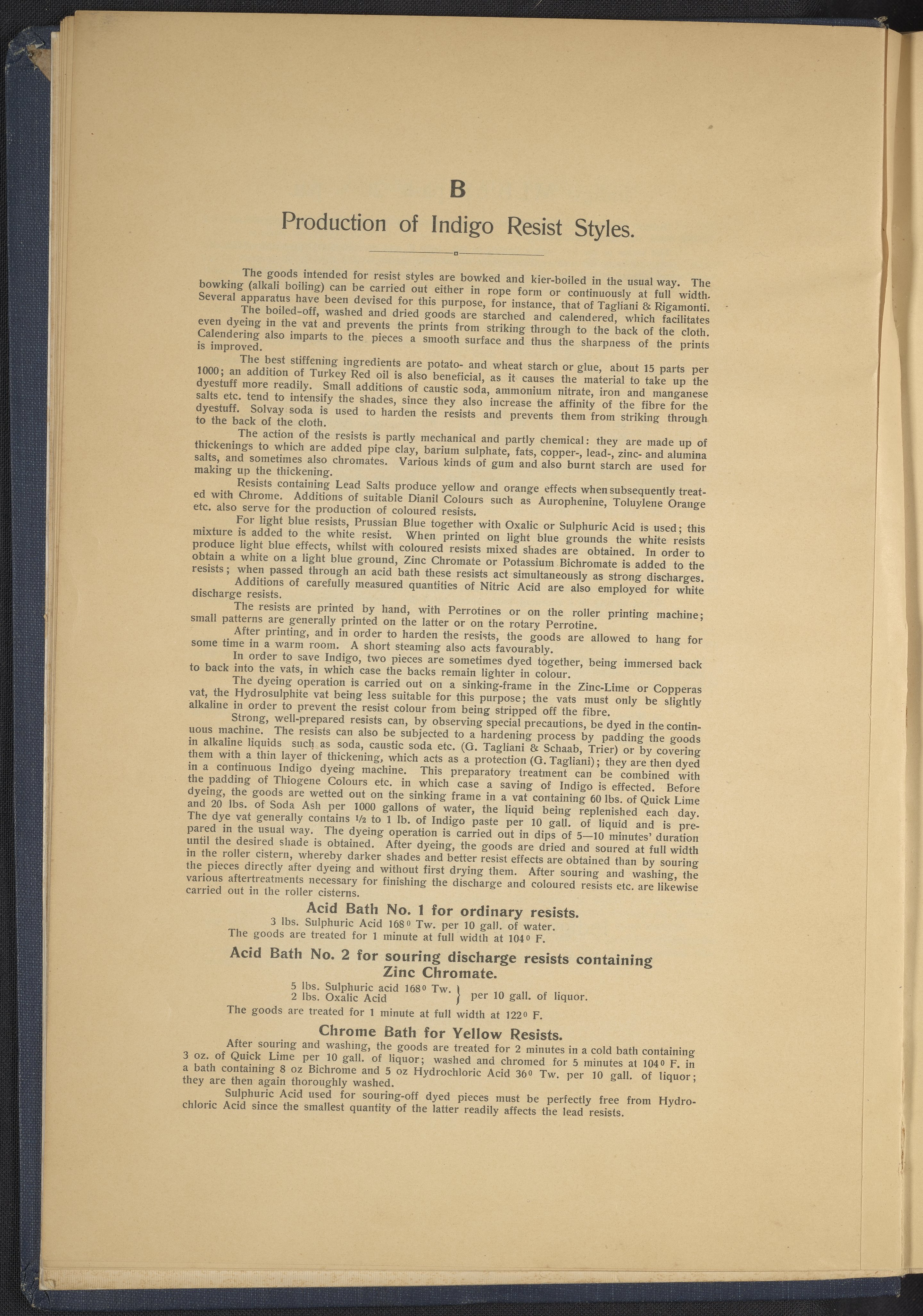 Small JPG1200 x 1634px — 431 KBLarge JPG2880 x 3920px — 2.7 MBFull-sized JPG4863 x 6619px — 7.0 MBOriginal fileTIFF — 4863 x 6619px — 92.2 MBThis sample book begins with a selection of recipes for the preparation of dye vats. Each recipe lists the solvents and solutes necessary to mix large-volume solutions of indigo textile dye using Indigo M.L.B. brand powdered dye, a synthetic indigo created using the "Pfleger indigo process," the first commercial process of indigo dye production. The recipes are followed by a series of protocols for indigo "resists" or the media used to prevent dye from penetrating the textile. Resist-dyeing is a traditional method used to create patterned designs on textiles. Substances are used to "resist" or prevent the dye from reaching all the cloth, thereby creating a pattern. Finally, the work contains 16 plates of mounted yarn and fabric samples demonstrating the outcomes of the preceding recipes.