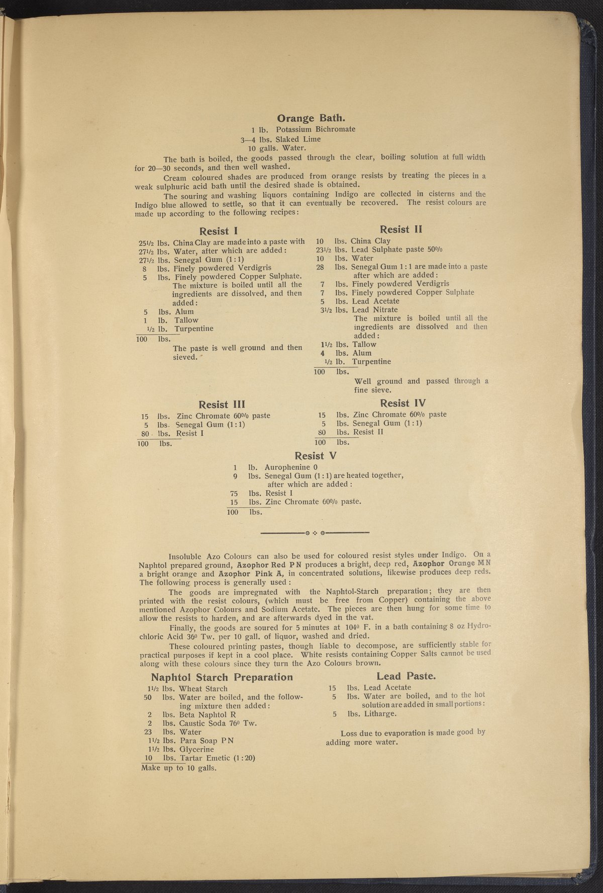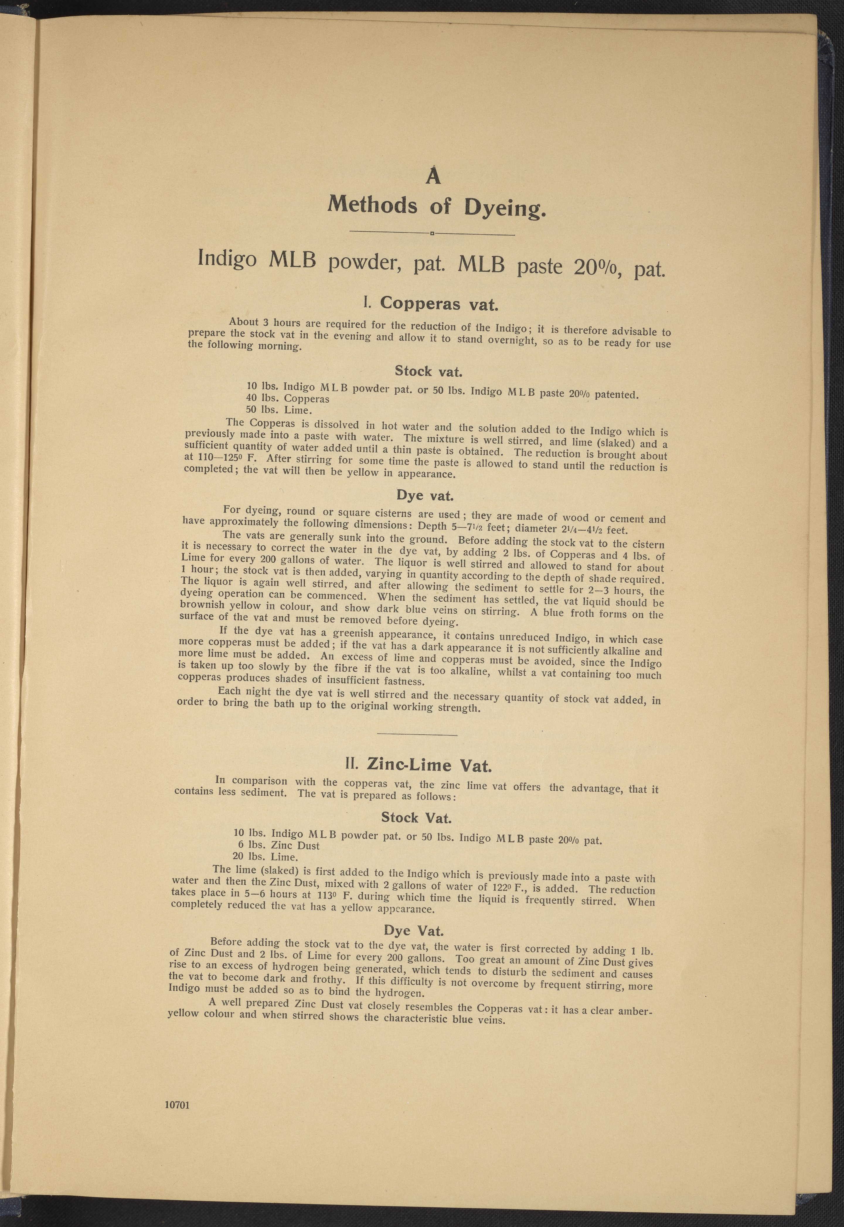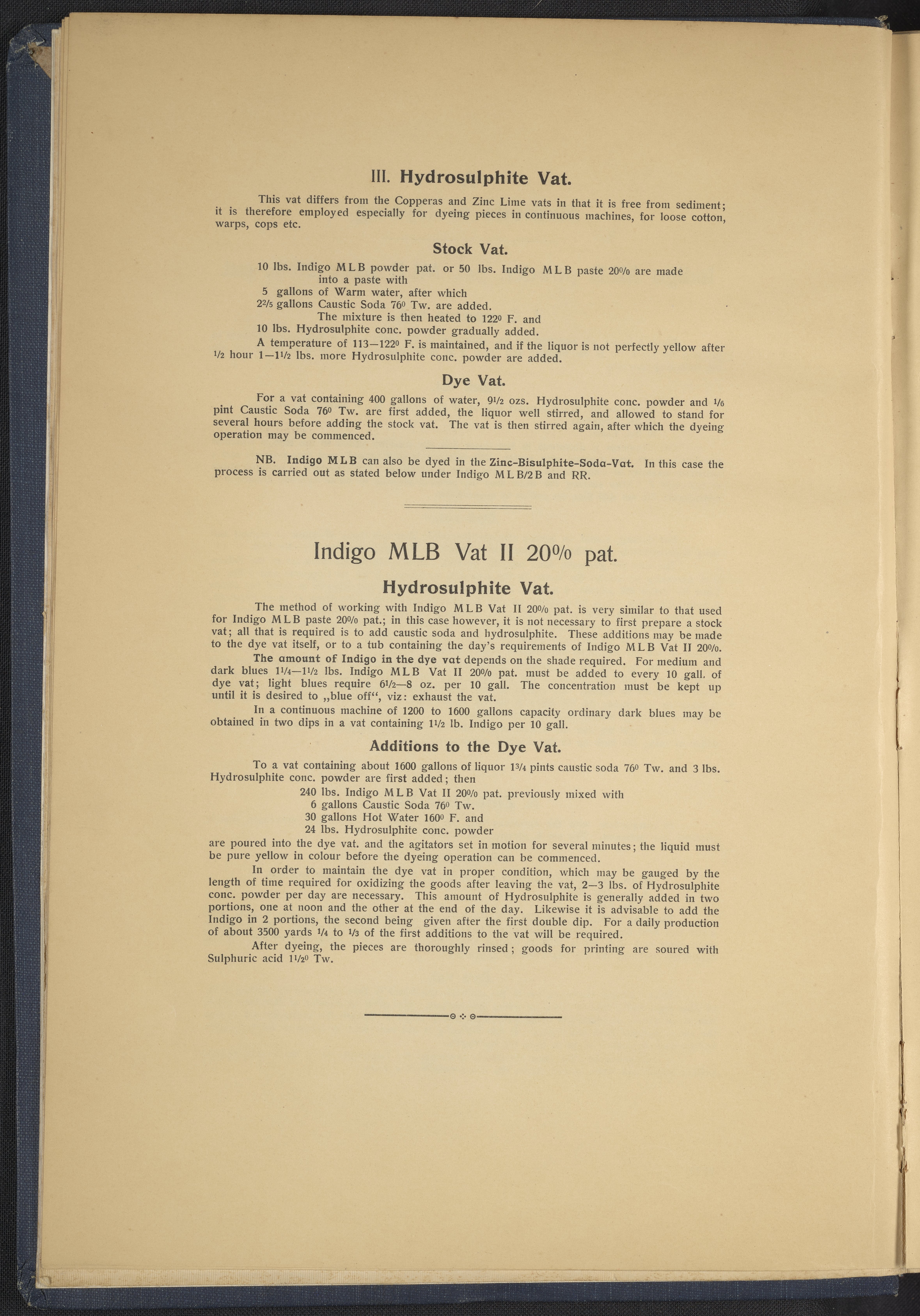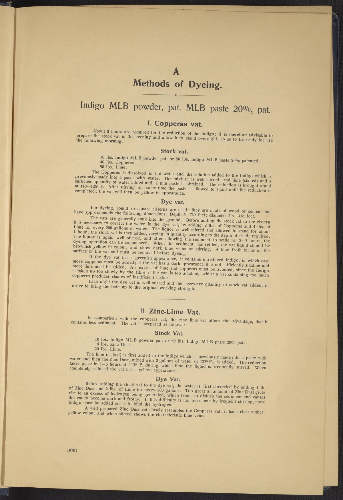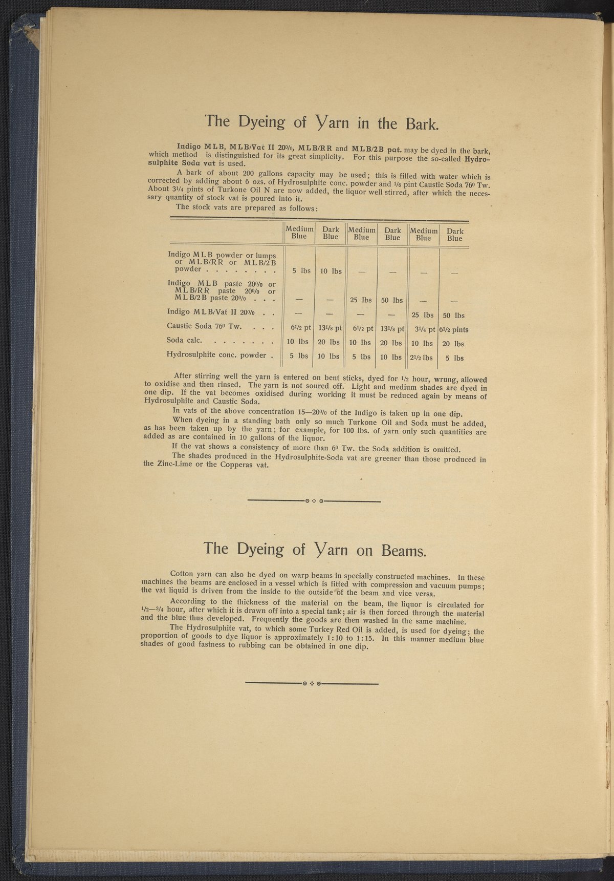 Small JPG1200 x 1634px — 431 KBLarge JPG2880 x 3920px — 2.7 MBFull-sized JPG4863 x 6619px — 7.0 MBOriginal fileTIFF — 4863 x 6619px — 92.2 MBThis sample book begins with a selection of recipes for the preparation of dye vats. Each recipe lists the solvents and solutes necessary to mix large-volume solutions of indigo textile dye using Indigo M.L.B. brand powdered dye, a synthetic indigo created using the "Pfleger indigo process," the first commercial process of indigo dye production. The recipes are followed by a series of protocols for indigo "resists" or the media used to prevent dye from penetrating the textile. Resist-dyeing is a traditional method used to create patterned designs on textiles. Substances are used to "resist" or prevent the dye from reaching all the cloth, thereby creating a pattern. Finally, the work contains 16 plates of mounted yarn and fabric samples demonstrating the outcomes of the preceding recipes.