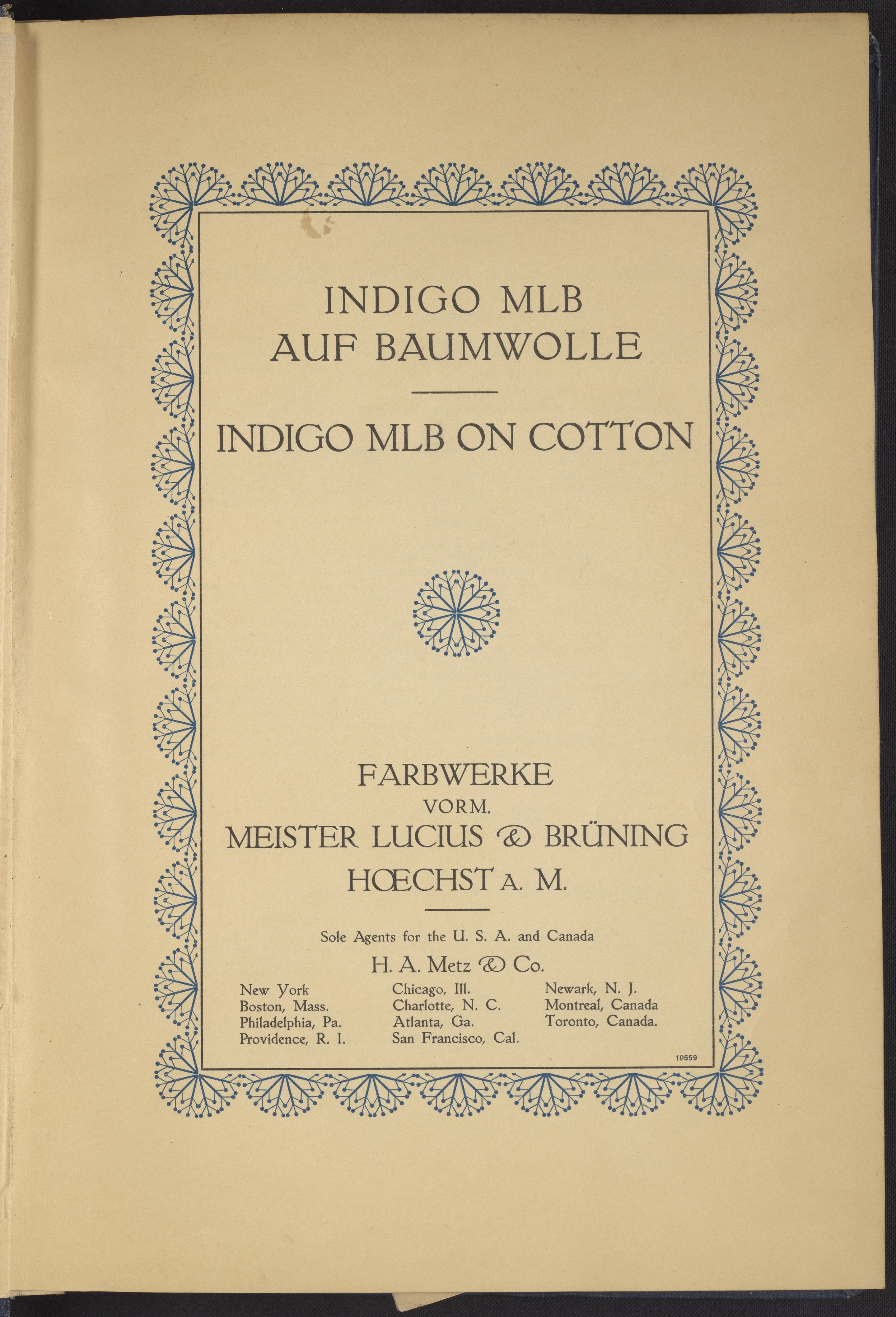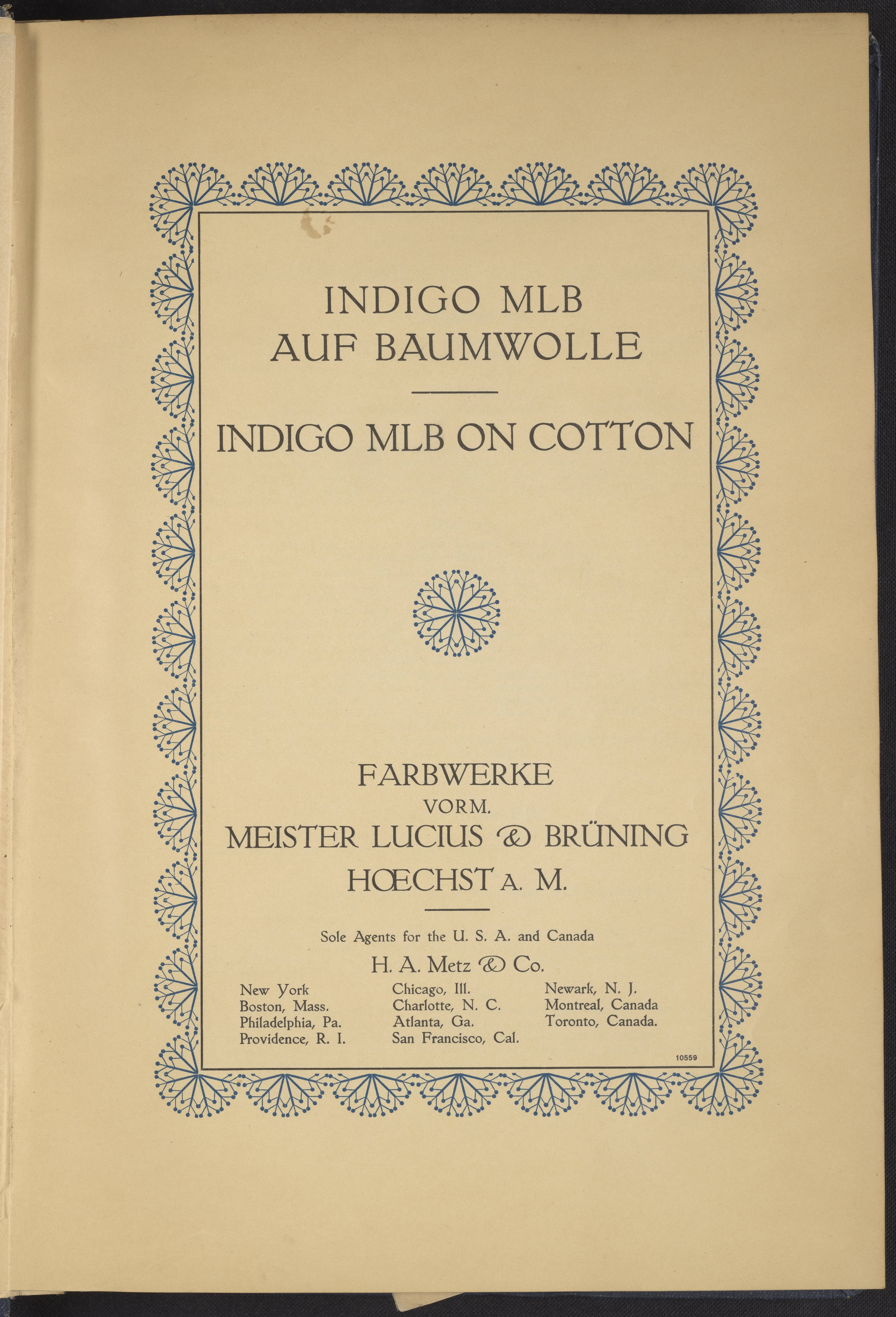 Farbwerke vorm. Meister Lucius & Brüning. Indigo MLB Auf Baumwolle : Indigo MLB on Cotton. Cotton (textile). H.A. Metz & Co, n.d. https://digital.sciencehistory.org/works/p408o02.