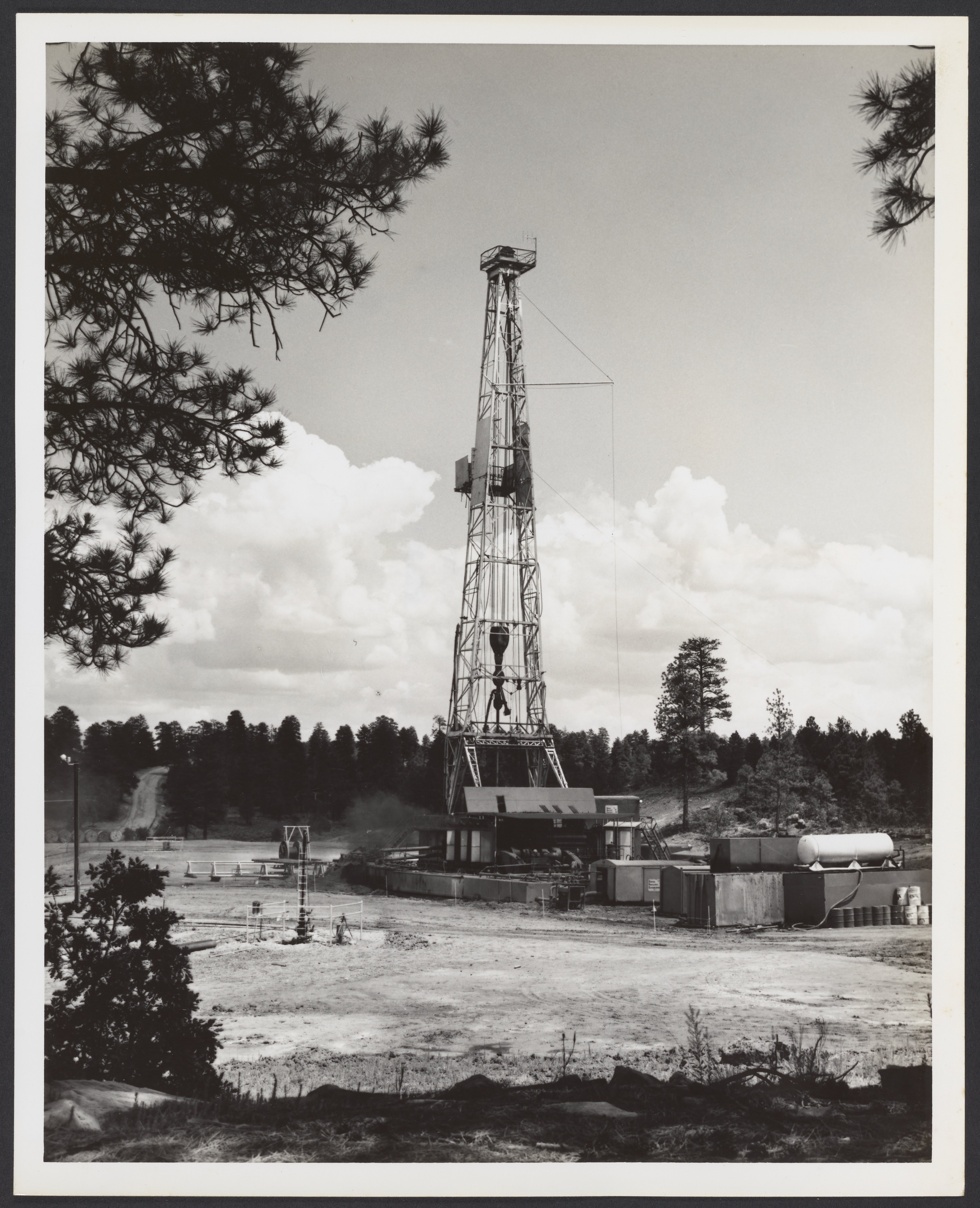 Small JPG1200 x 1480px — 278 KBLarge JPG2880 x 3552px — 1.1 MBFull-sized JPG5076 x 6260px — 2.8 MBOriginal fileTIFF — 5076 x 6260px — 91.0 MBBlack and white photograph of the Signal Drilling Company rig that bored the device emplacement hole for Project Gasbuggy. Also shows the first test hole drilled at the site.