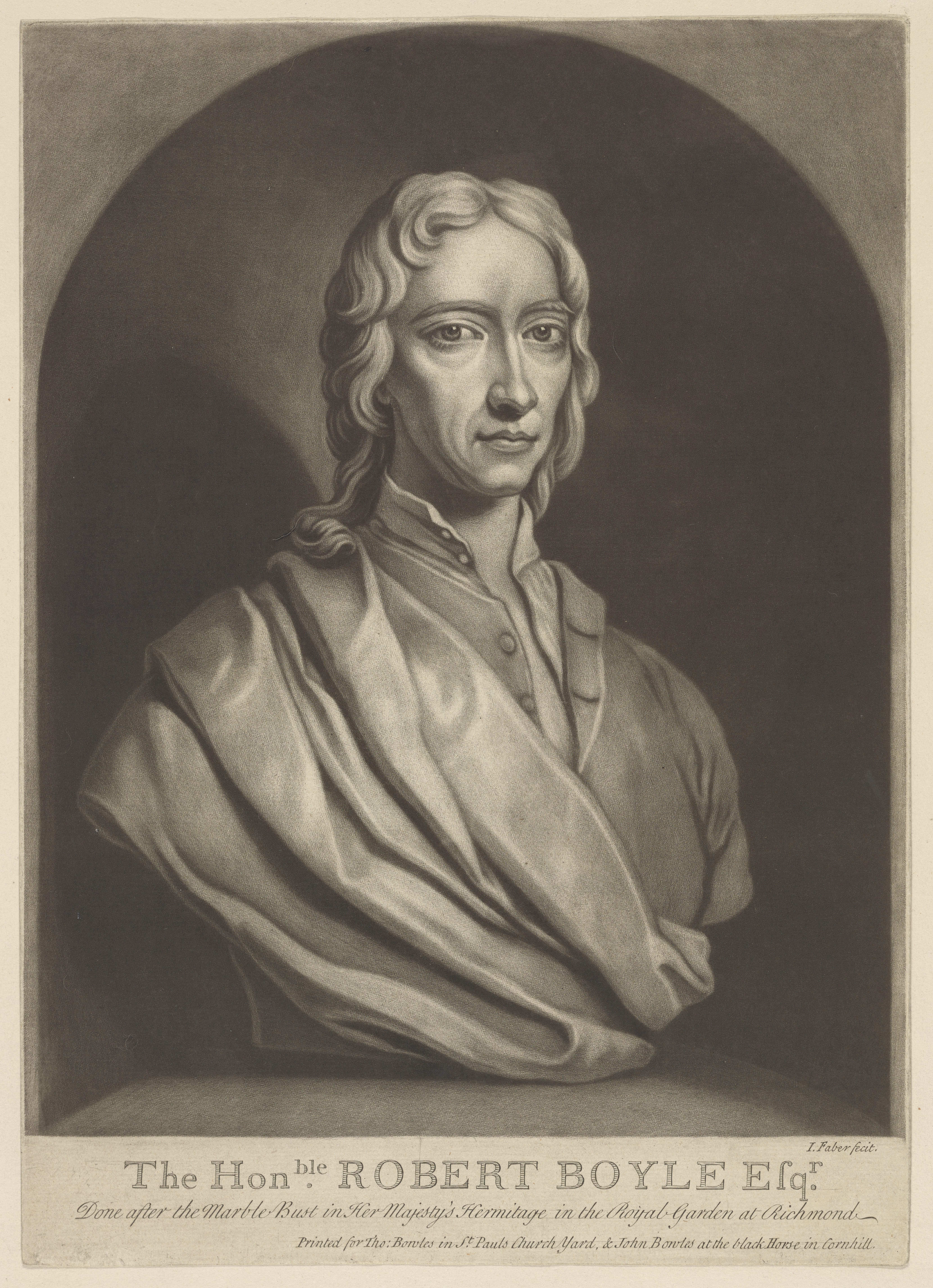 Mezzotint of a portrait bust of the Irish chemist Robert Boyle (1627–1691) in an arched niche.