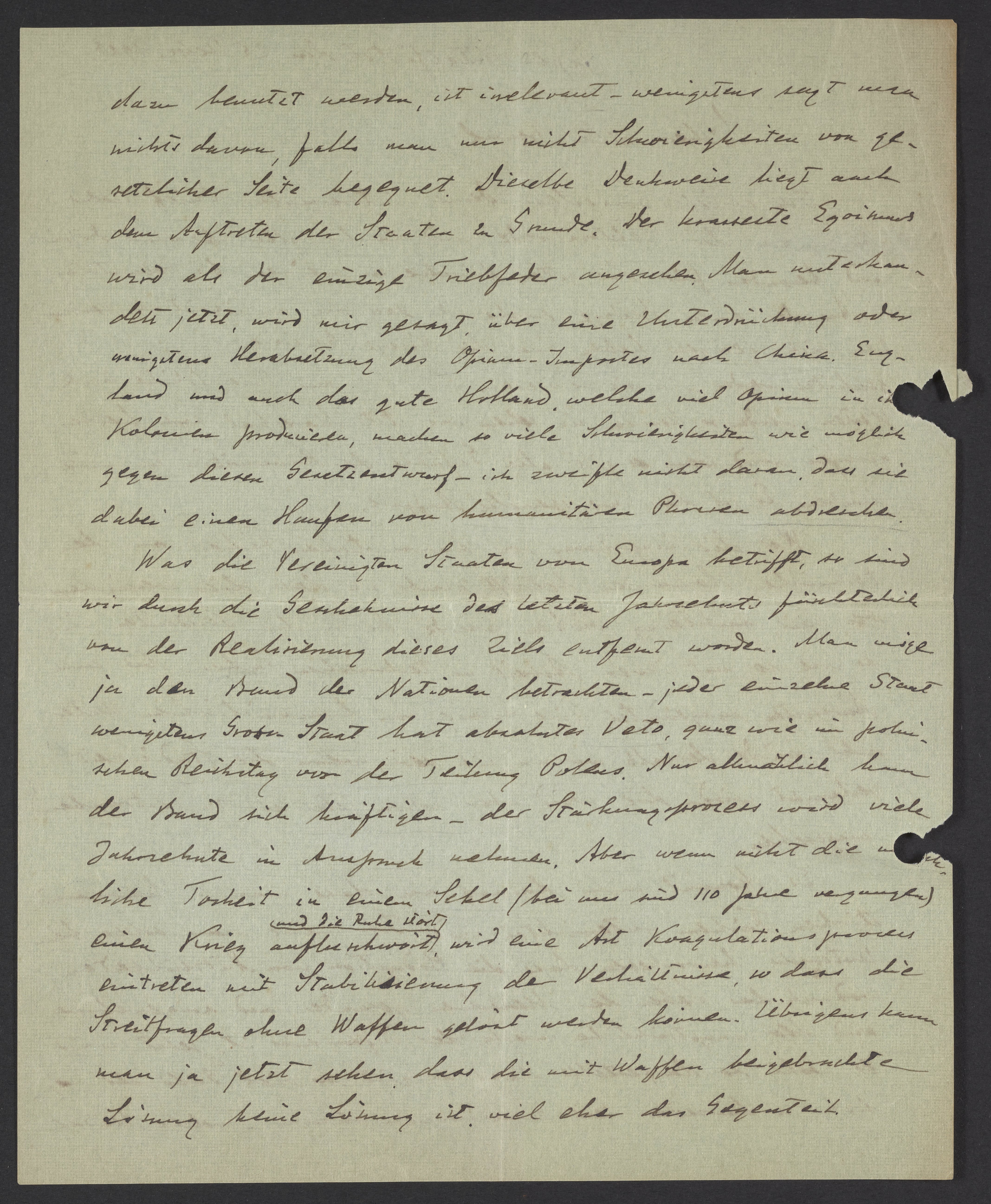 welche Mittel dazu benutzt werden, ist irrelevant – wenigstens sagt man nichts davon, falls man nur nicht Schwierigkeiten von gesetzlicher Seite begegnet. Diesselbe Denkweise liegt auch dem Auftreten der Staaten zu Grunde. Der krasseste Egoismus wird als der einzige Triebfeder angesehen. Man unterhandelt jetzt, wird mir gesagt, über eine Ünterdrückung oder wenigstens Herabsetzung des Opium-Importes nach China. England und auch das gute Holland, welche viel Opium in ihren Kolonien producieren, machen so viele Schwierigkeiten wie möglich gegen diesen Gesetzentwurf - ich zweifele nicht daran, dass sie dabei einen Haufen von humanitären Phrasen abdreschen.
